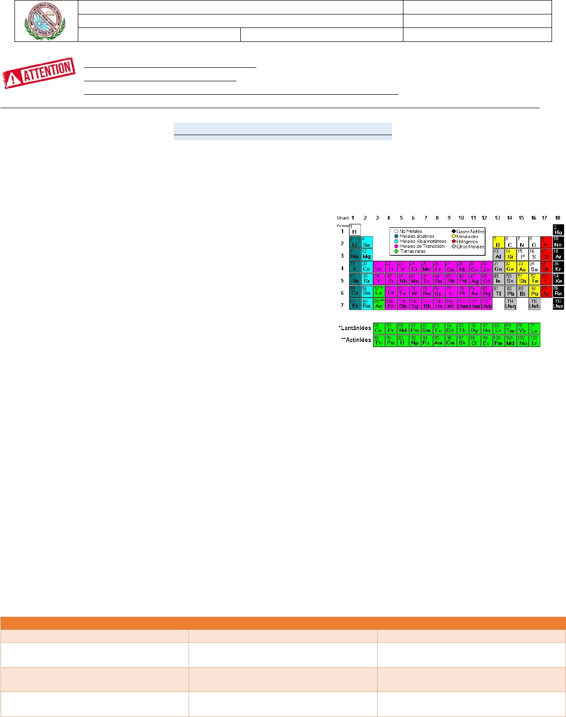 INSTITUTO MODERNO CRISTO REDENTOR Fecha: 26/10/2020 GUÍA # 4 METALES NO METALES Y METALOIDES Docente: Astrid Bothia Periodo IV Grado: Octavo Asignatura: Química FECHA LÍMITE DE ENTREGA 30/10/2020 Correo: astridbothia21@gmail.com RECUERDE: trabajo que NO esté debidamente marcado NO será recibido Instrucciones: lea atentamente la siguiente información y resuelva la actividad al final de la misma, en base a este contenido. ELEMENTOS METALES NO METALES Y METALOIDES Los metales, no metales y metaloides o semimetales, son las tres divisiones en las que pueden clasificarse todos los elementos químicos de la tabla periódica. Los elementos que pertenecen a cada una de estas divisiones comparten un conjunto de características o propiedades físicas y químicas, las cuales los diferencian de otros elementos. METALES: Elementos a la izquierda de la línea se consideran metales; a excepción del hidrógeno (H), el primer elemento en la tabla periódica. A temperaturas y presiones ordinarias, el hidrógeno se comporta como un no metal. La mayoría de los elementos son metales. Este grupo incluye los metales alcalinos (IA), metales alcalinotérreos (IIA), metales de transición, metales básicos, lantánidos (tierras raras), y actínidos. Aunque por separado en la tabla periódica, los lantánidos y actínidos son tipos muy específicos de los metales de transición. Generalmente son brillantes, y sólo se derriten a altas temperaturas; su forma puede cambiar fácilmente y pueden ser convertidos en cables o láminas sin romperse. Los metales se corroen, al igual que el desgaste gradual del hierro. El calor y la electricidad viajan fácilmente a través de los metales ¡razón por la cual no es prudente pararse junto a un poste metálico durante una tempestad! METALOIDES: solo existen 7 metaloides reconocidos como tal en la tabla periódica: Boro [B], Silicio [Si], Germanio [Ge], Arsénico [As], Antimonio [Sb], Telurio [Te] y Polonio [Po]. Estos elementos tienen las propiedades de los metales y no metales. Físicamente, los metaloides lucen como metales, pero químicamente se comportan como no metales. Pueden ser tanto brillantes como opacos, y su forma puede cambiar fácilmente. Generalmente, los metaloides son conductores de calor y de electricidad, de mejor manera que los no metales, y no tan bien como los metales. Separan los metales y no metales en una tabla periódica. Además, muchas tablas periódicas tienen una línea de escalones en la tabla que identifica los grupos de elementos. La línea comienza en boro (B) y se extiende hasta el polonio (Po). Elementos justo a la derecha de las propiedades de la línea de exhibición de ambos metales y no metales y se denominan metaloides o semimetales. NO METALES: a la derecha de la Tabla Periódica aparecen los no metales, éstos son muy diferentes a los metales. Su superficie es opaca, y son malos conductores de calor y electricidad. En comparación con los metales, son de baja densidad, y se derriten a bajas temperaturas. La forma de los no metales no puede ser alterada fácilmente, ya que tienden a ser frágiles y quebradizos. Entre los sólidos tenemos al azufre, carbono (carbón o diamante), fósforo, selenio y el yodo. El bromo es el único no metal que existe como un líquido color café rojizo. Mientras, el flúor, cloro, nitrógeno, oxígeno, hidrógeno, helio, argón, etc., son elementos gaseosos. Propiedades de los elementos Metales Metaloides o semimetales No metales La mayoría de los elementos son metales. Mezcla de características entre metales y no metales. Estados físicos variables Aspecto metálico y brillante (excepto Cu y Au) Opaco o brillante Aspecto mate Normalmente sólido a temperatura ambiente. Hay metales que son líquidos a Todos son sólidos La mayoría gaseosos. El bromo es el único no metal líquido. mailto:astridbothia21@gmail.com temperaturas moderadas, como ocurre con el mercurio, francio, galio y el cesio. Algunos solidos Buenos conductores del calor y la electricidad Semiconductores de calor y electricidad Malos conductores de calor y electricidad Maleable (se puede doblar y golpeó en láminas delgadas) Menudo maleable Generalmente frágiles Dúctil (puede ser convertido en alambre) Menudo dúctil Nula Puede tener un punto de fusión muy alto Por lo general bajo punto de fusión de los sólidos, en comparación con los metales Generalmente densa (excepciones incluyen litio, potasio y sodio) Ligeramente densos Por lo general menos densa, en comparación con los metales Pierden fácilmente electrones Puede ganar o perder electrones en las reacciones Ganan electrones con facilidad, excepto los gases. ACTIVIDAD Cada hoja del cuaderno debe estar marcada con el primer nombre, apellido del estudiante, y grado que cursa. Luego escriba el número y título de la guía de trabajo de manera llamativa, la fecha de inicio y la fecha límite en la que debe entregar esta actividad. Recuerde que trabajo que NO esté marcado de esta forma NO será recibido. 1. Construya una síntesis del contenido de la guía, con los datos que consideres que facilitan la comprensión de este tema. La forma como construya la síntesis es libre. Por ejemplo: puede ser un resumen corto (máximo 10 renglones), un glosario (mínimo 10 conceptos), un mapa conceptual (abarque el contenido) 2. En la siguiente tabla marca correctamente a donde corresponda cada enunciado Características Metal No metal Sn Brillante No son conductores Ástato Maleables Variedad de colores Argón 3. Observa la tabla y complementa los espacios en blanco, clasificándolo y describiéndolo correctamente. 4. De acuerdo a las características observadas de los metales y los no metales, clasifica las siguientes imágenes. Elemento Símbolo químico Metal No metal Metaloide Color Brillo Olor Textura Sensación térmica Polonio Yodo Mercurio Carbono Radio Helio INSTITUTO MODERNO CRISTO REDENTOR Fecha: 26/10/2020 GUÍA # 4 METALES NO METALES Y METALOIDES Docente: Astrid Bothi
