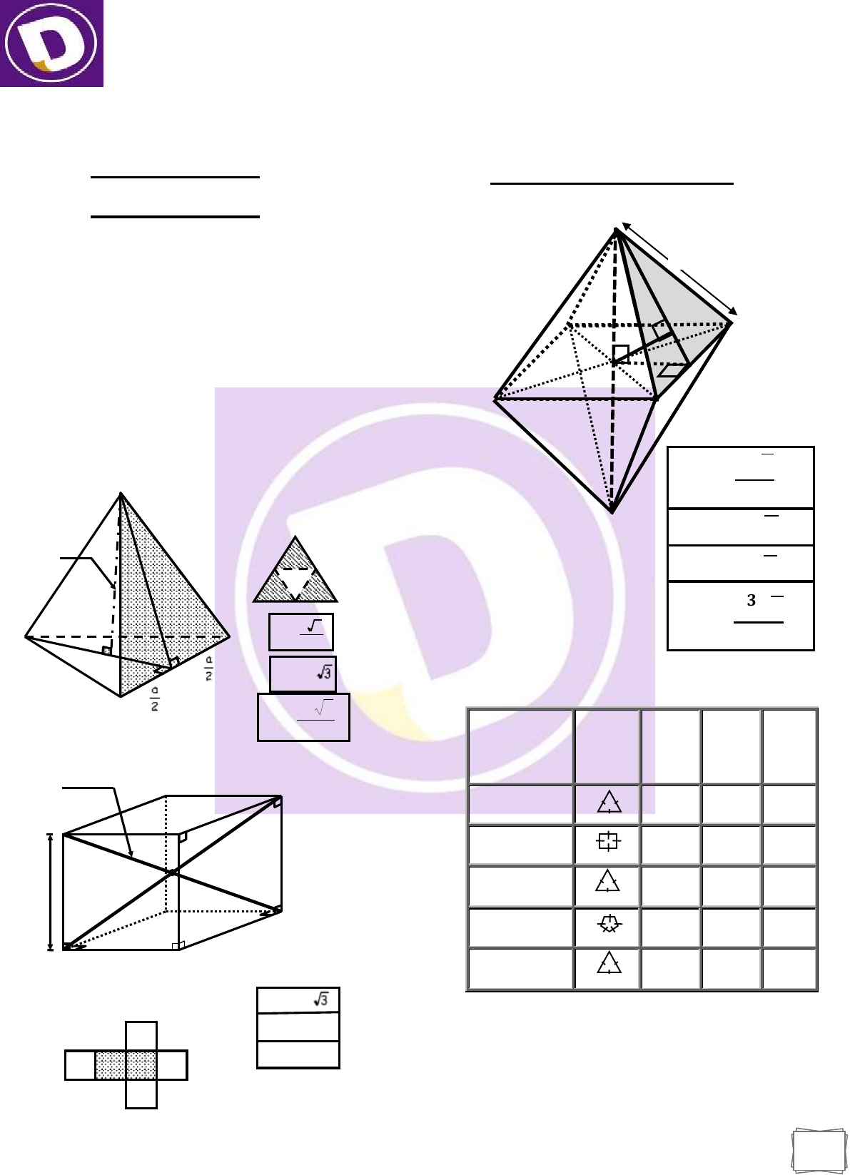 1 POLIEDROS REGULARES CONCEPTO: Se llama poliedro regular al poliedro cuyas caras son todas polígonos regulares congruentes, comprobándose que en cada vértice concurren un número igual de aristas. En todo poliedro regular sus ángulos diedros son congruentes, los mismos que sus ángulos poliedros. Solo existen 5 poliedros regulares convexos. a) TETRAEDRO REGULAR a : Arista Desarrollo Superficie: b) HEXAEDRO REGULAR (CUBO) ¨a¨: arista Desarrollo de la Superficie c) OCTAEDRO REGULAR Observación: Poliedro Forma de la cara C V A Tetraedro 4 4 6 Hexaedro 6 8 12 Octoedro 8 6 12 Dodecaedro 12 20 30 Icosaedro 20 12 30 h A a G C M B D h = 3 6a V = 12 23a AT = a2 V = a3 AT = 6a2 d = a a E H G A B C D d F 0 D C B O H A P Q a V = 𝒂𝟑ξ𝟐 𝟑 At = 𝟐ξ𝟑𝒂𝟐 D = 𝒂ξ𝟐 OH = 𝒂ξ𝟔 𝟔 2 PROBLEMAS 1) Una pelota de futbol en forma de un icosaedro truncado está formado por 20 caras hexagonales de ¨n¨ caras pentagonales. Si el número de aristas es 90, halle el número de vértices del poliedro a) 50 b) 60 c) 70 d) 80 2) En el cubo mostrado, calcule la medida del ángulo que forman las rectas 1 2L y L . a) 30° b) 37° c) 45° d) 60° 3) Se fabrica envases de cartón para un perfume en forma de hexaedro regular como se muestra en la figura. Si el área de la región triangular DOC es 2ξ2𝑐𝑚2 y MO=OD, halle el área de cartón utilizada en un envase. a) 90𝑐𝑚2 b) 80𝑐𝑚2 c) 48𝑐𝑚2 d) 100𝑐𝑚2 4) La arista de un tetraedro regular mide 4, halle la distancia entre dos aristas opuestas. a) ξ2 b) ξ3 c) 2ξ2 d) 3ξ2 5) Calcular el volumen del tetraedro regular inscrito en el cubo cuya arista es “a”. a) 𝑎2.ξ2 b) 𝑎3ξ3 2 c) 𝑎3ξ3 3 d) 𝑎3 3 6) En la figura, OABC es un tetraedro regular AT=3TO=6m. Halle el área de la región triangular BTC. a) 24𝑚2 b) 30𝑚2 c) 20𝑚2 d) 36𝑚2 7) En un cubo ABCD, M y N son puntos medios de las aristas laterales 𝐷𝐻̅̅ ̅̅ y 𝐶𝐺̅̅ ̅̅ respectivamente. Si la distancia entre 𝑀𝐶̅̅̅̅̅ y 𝐻𝑁̅̅̅̅̅ es 2m, hallar el área lateral del cubo. a) 80 𝑚2 b) 60𝑚2 c) 70𝑚2 d) 90𝑚2 8) En la figura, se muestra un trípode topográfico. Una de las posiciones adecuadas es que determine un tetraedro regular. Si el punto medio del hilo de la plomada 𝑂𝐴 ̅̅ ̅̅ ̅al vértice C mide 3ξ2 m, halle la altura H. 2L1 L N C DA L M B P O 1L 2L N C DA L M B P A O C B T 3 a) 2ξ6m b) 3ξ2m c) 4ξ3m d) 5ξ2m 9) El hexaedro regular, la distancia del centro de una cara a la diagonal del hexaedro es ξ6m. Halle el área total del hexaedro. a) 216 𝑚2 b) 210 𝑚2 c) 218 𝑚2 d) 220 𝑚2 10) Halle el volumen del sólido que se forma al unir los centros de las caras de un cubo cuya arista mide ξ2 m. a) ξ2 3 𝑚2 b) ξ2 8 𝑚2 c) 3ξ2 7 𝑚2 d) 2ξ2 11) En un octaedro regular, la distancia entre los centros de gravedad de dos caras opuestas que tienen un vértice común es ¨a¨. Calcular el área de la superficie del octaedro. a) 4ξ3𝑎2 b) 9 2 ξ2𝑎2 c) 3ξ3𝑎2 d) 9 2 ξ3𝑎2 12) En la figura, P – ABCD – Q es un octaedro regular, PM = MC, m 𝐴𝑁�̂� = 90° y MN ξ11 m . Halle el área total del octaedro regular. a) 24ξ3𝑚2 b) 28ξ3𝑚2 c) 32ξ3𝑚2 d) 36ξ3𝑚2 13) Hallar el área de la región determinada por la proyección de un octaedro regular sobre un plano perpendicular a una arista, cuya longitud es 4m. 14) a) 8ξ2𝑚2 b) 4ξ2𝑚2 c) 8ξ3𝑚2 d) 8ξ5 14) En un tetraedro Q-ABC; M y N son puntos medios de 𝑂𝐵̅̅ ̅̅ y 𝐴𝐶̅̅ ̅̅ respectivamente. Además, m<OAB = m<OCB = 90°, OB = 100 y AC = 80. Calcular MN. a) 30 b) 40 c) 25 d) 35 15) Calcular la razón que existe entre las áreas de dos tetraedros regulares, siendo la altura de uno de ellos la mitad de la arista del otro. a) 4 3 b) 5 2 c) 9 2 d) 8 3 TAREA 1) Calcular el área de la sección que determina un plano de simetría que pasa por una arista en un tetraedro regular de 20cm de arista. a) 100ξ2𝑐𝑚2 b) 50ξ2𝑐𝑚2 c) 80ξ2𝑐𝑚2 d) 90ξ2𝑐𝑚2 2) Del gráfico, calcular el área de la región sombreada. a. a2 b. a2 3 c. 2 a2 3 d. 2 3a2 D C B A P Q M N D B A C O H a 4 3) Calcular el área de la región sombreada. a. a2 2 b. 2 2a2 c. 4 2a2 d. 3a2 4) En la figura, V-ABC es un tetraedro regular, cuya arista mide 9 cm. Si G es el baricentro de la cara VBC, halle la distancia de G a la base ABC. a. 2ξ6 cm b. ξ3 cm c. ξ6 cm d. 3ξ2 cm 5) En la figura, la arista del tetraedro regular mide 4 cm, el plano que es perpendicular a la altura, pasa por el punto medio de esta. Halle el área de la sección plana determinada. a. 2ξ6𝑐𝑚2 b. ξ3𝑐𝑚2 c. 2ξ3𝑐𝑚2 d. ξ3 2 𝑐𝑚2 6) En la figura, V-ABC es un tetraedro regular y AB = 18ξ3 cm. Si G es el baricentro de la cara BVC, halle GP. a. 5ξ6 𝑐𝑚 b. 6ξ6 𝑐𝑚 c. 7ξ6 𝑐𝑚 d. 2ξ3 𝑐𝑚 14) 7) En un tetraedro regular B-ACD, O es centro de la cara ACD. Si la distancia entre los puntos medios de 𝑂𝐵̅̅ ̅̅ y 𝐶𝐷̅̅ ̅̅ es 2ξ3 m, halle la longitud de la altura del tetraedro regular. 15) 16) A) 2ξ3 m B) 4ξ2m C) 3ξ2m D) 4ξ3m 8) Calcular el área de la región sombreada si el área de la superficie total del hexaedro regular es 144. a) 36 b) 12ξ2 c) 12 d) 8ξ2 9) Calcular el área total de un tetraedro regular sabiendo que su arista es 3 . a) 3 b) 3 3 c) 6 d) 2 3 10) Halle la distancia entre los baricentros de dos caras de un tetraedro regular de arista a. a. 3 2 ª b) 𝑎 5 c) 𝑎 3 d) 𝑎 2 A V C B G A V C B A V C B G E A B C G H F O D a a O