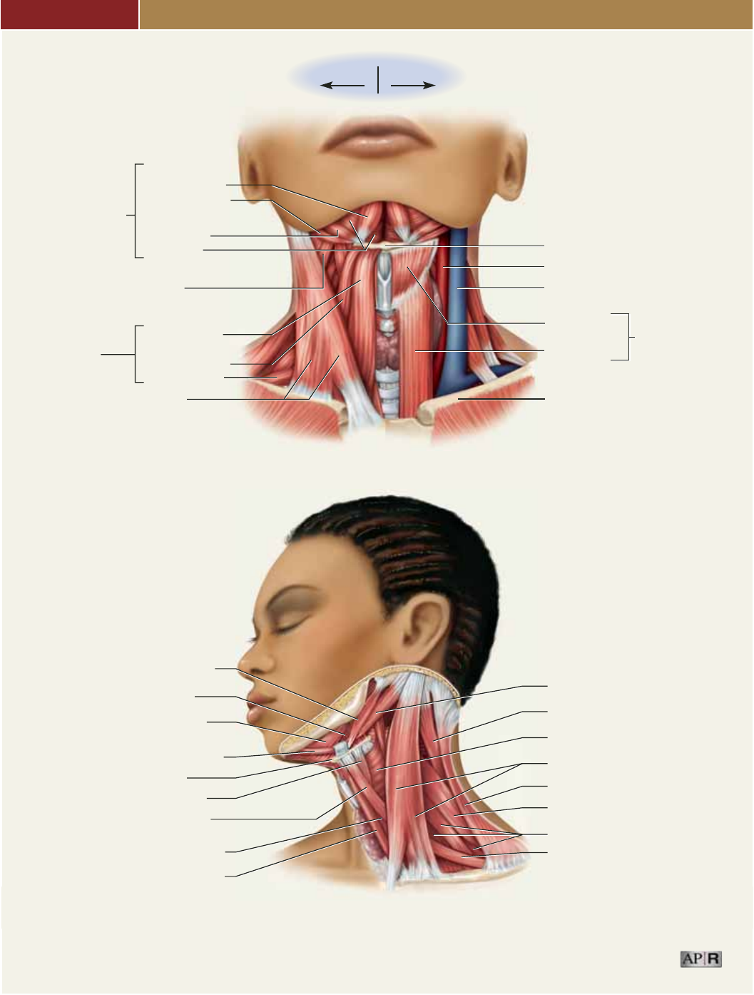 330 PARTE DOS Soporte y movimiento CUADRO 10.2 Músculos de la masticación y la deglución (continuación) FIGURA 10.11 Músculos del cuello. Los rótulos en negritas indican músculos de los grupos suprahioideos e infrahioideos. Otro músculo del grupo suprahioideo, el geniohioideo, es profundo en relación con el milohioideo y puede verse en la figura 10.8. Elevador de la escápula Esternocleidomastoideo Digástrico: Vientre anterior Vientre posterior Estilohioideo Milohioideo Esternohioideo Grupo suprahioideo Grupo infrahioideo a) Vista anterior Hioides Arteria carótida común Vena yugular interna Clavícula Tirohioideo Omohioideo: Vientre superior Vientre inferior Esternotiroideo Trapecio Esplenio de la cabeza Esternocleidomastoideo Elevador de la escápula Escalenos Omohioideo (vientre inferior) Estilohioideo Milohioideo Hipogloso Digástrico (vientre posterior) Tirohioideo Hioides Constrictor faríngeo inferior Esternohioideo b) Vista lateral Omohioideo (vientre superior) Digástrico (vientre anterior) Esternotiroideo Superior Profundo Grupo infrahioideo