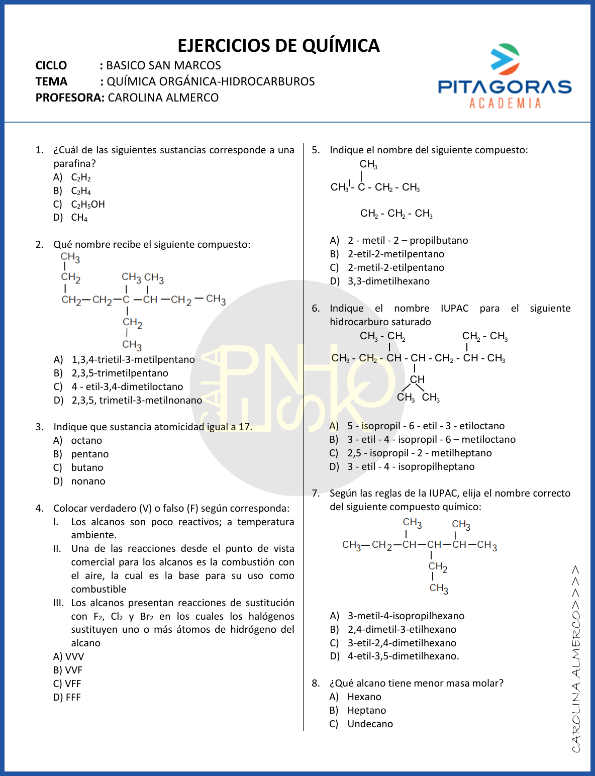 EJERCICIOS DE QUÍMICA CICLO : BASICO SAN MARCOS TEMA : QUÍMICA ORGÁNICA-HIDROCARBUROS PROFESORA: CAROLINA ALMERCO 1. ¿Cuál de las siguientes sustancias corresponde a una parafina? A) C2H2 B) C2H4 C) C2H5OH D) CH4 2. Qué nombre recibe el siguiente compuesto: A) 1,3,4-trietil-3-metilpentano B) 2,3,5-trimetilpentano C) 4 - etil-3,4-dimetiloctano D) 2,3,5, trimetil-3-metilnonano 3. Indique que sustancia atomicidad igual a 17. A) octano B) pentano C) butano D) nonano 4. Colocar verdadero (V) o falso (F) según corresponda: I. Los alcanos son poco reactivos; a temperatura ambiente. II. Una de las reacciones desde el punto de vista comercial para los alcanos es la combustión con el aire, la cual es la base para su uso como combustible III. Los alcanos presentan reacciones de sustitución con F2, Cl2 y Br2 en los cuales los halógenos sustituyen uno o más átomos de hidrógeno del alcano A) VVV B) VVF C) VFF D) FFF 5. Indique el nombre del siguiente compuesto: A) 2 - metil - 2 – propilbutano B) 2-etil-2-metilpentano C) 2-metil-2-etilpentano D) 3,3-dimetilhexano 6. Indique el nombre IUPAC para el siguiente hidrocarburo saturado A) 5 - isopropil - 6 - etil - 3 - etiloctano B) 3 - etil - 4 - isopropil - 6 – metiloctano C) 2,5 - isopropil - 2 - metilheptano D) 3 - etil - 4 - isopropilheptano 7. Según las reglas de la IUPAC, elija el nombre correcto del siguiente compuesto químico: A) 3-metil-4-isopropilhexano B) 2,4-dimetil-3-etilhexano C) 3-etil-2,4-dimetilhexano D) 4-etil-3,5-dimetilhexano. 8. ¿Qué alcano tiene menor masa molar? A) Hexano B) Heptano C) Undecano CH2 - CH2 - CH3 CH3 CH3 - C - CH2 - CH3 CH3 - CH2 - CH - CH - CH2 - CH - CH3 CH3 - CH2 CH2 - CH3 CH CH3 CH3 C A R O L IN A A L M E R C O > > > > D) Dodecano 9. Indique el nombre del siguiente compuesto: A) 3 - etil - 2, 4, 4 – trimetilhexano B) 3 - etil - 2, 5, 5 – trimetilhexano C) 5 - etil - 3, 3, 5 – trimetilhexano D) 1 - etil - 2, 4, 4 - trimetilhexano 10. Indique el nombre del siguiente compuesto: A) 2 - etil - 2 – propilpropano B) 3,3-dimetilhexano C) 4,4-dimetilhexano D) 3,3-dimetilheptano 11. ¿Cuál de las siguientes sustancias corresponde a una parafina? A) C20H38 B) C2H6 C) C3H6 D) CCl4 12. Al siguiente compuesto se le denomina: A) 3 - etilbutano B) 3 - hexano C) metilhexano D) 3 - metilpentano 13. Escribir la nomenclatura adecuada: A) 1,3 - metiletilpentano B) 2 - metiletilpentano C) 3 - etil- 2 - metilpentano D) 1 - metil - 3 - etilpentano 14. Marcar con verdadero (V) o falso (F) según corresponda: I. A los hidrocarburos alcanos se les considera como saturados II. Las siguientes fórmulas globales corresponden a hidrocarburos saturados CnH2n, CnH2n-2, CnH2n + 2 III. Se trata de un hidrocarburo saturado: A) VVV B) VFV C) FFV D) FFV 15. Indique el nombre IUPAC del compuesto: A) 4 - etil - 3,4 dimetilheptano. B) Decano. C) 2 etil-2-butilpentano. D) 3,4 dimetil-4-propilhexano. 16. ¿Cuál de las siguientes sustancias tiene una masa molar igual a 86 g/mol? A) Hexano B) Pentano C) Butano D) Pentadecano 17. En un análisis se determina que un hidrocarburo saturado de formula global C8H18 posee 5 carbonos primarios, 1 carbono secundario, 1 carbono terciario y 1 carbono cuaternario. Indique el nombre IUPAC del compuesto. A) 2,3,4-trimetilpentano B) 4-etil-2-metilpentano C) 2,2,4-trimetilpentano D) 3-etil-3-metilpentano 18. Nombrar al siguiente hidrocarburo: CH2 - CH3 CH3 - CH - CH - C(CH3)2 - CH2 - CH3 CH3 C2H5 CH3 - C - CH3 C3H7 CH3 - CH - CH - CH2 - CH3 CH3 CH2CH3 H - C - C - H H H H H C A R O L IN A A L M E R C O > > > > A) 4 - propil - 2,3,5 - trimetilheptano B) 4 - propil - 3,5,6 - trimetilheptano C) 2,3,5 - trimetil - 4 - propilheptano D) 3,5,6 - trimetil - 4 - propilheptano 19. Señale el nombre correcto del siguiente alcano. A) 4 - isopropil - 5 - metil - 6 - propilnonano B) 6 - etil - 4 - isopropil - 5 - metilnonano C) 4 - etil - 6 - isopropil - 5 - metilnonano D) 6 - isopropil - 5 - metil - 4 - propilnonano 20. Indique el nombre del siguiente alcano. A) 2,2 - dimetil - 4 - etil - 5 - isopropiloctano B) 2,2 - dimetil - 5 - isopropil - 4 -etiloctano C) 4 - etil - 2,2 - dimetil - 5 - isopropiloctano D) 4 - etil - 5 - isopropil - 3,3 - dimetiloctano C A R O L IN A A L M E R C O > > > > Copy protected with Online-PDF-No-Copy.com https://online-pdf-no-copy.com/?utm_source=signature