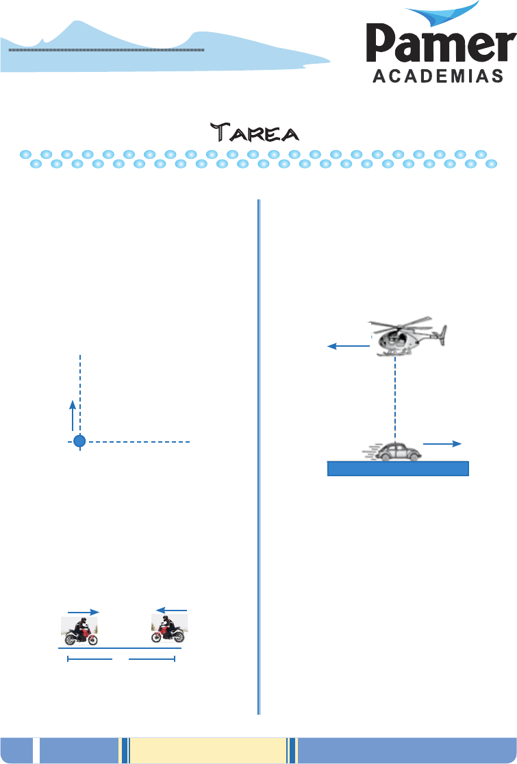 SSI3XN1 FISICA TEMA R1 1 SAN MARCOS EXTENDIDO 2021 – IFISICATEMA R1 TAREA NIVEL I 1. Un móvil que desarrolla un MRU se dirige con 6 m/s hacia el norte; luego de 4 s cambia la dirección de su movimiento hacia el este y sigue desarrollando MRU, pero ahora con 3 m/s y durante 6s. ¿Cuál fue el módulo del desplazamiento del móvil para este intervalo de 10 s? Y: NORTE X: ESTE A) 18 m B) 20 m C) 24 m D) 30 m 2. Dos ciclistas separados una distancia x=350m se dirigen uno al encuentro del otro por vías paralelas de una pista. Calcular el tiempo de encuentro sabiendo que v=10m/s. Los ciclistas realizan MRU. 2v 5v x A) 3s B) 4s C) 5 D) 6s 3. A partir del instante mostrado, determine a que distancia estarán separados los móviles al cabo de 10 s. Considere que los móviles realizan MRU. 16 m/s 70 m 16 m/s A) 260 m B) 130 m C) 280 m D) 250 m 4. Un auto inicia su movimiento con acele- ración constante. Si en los dos primeros segundos recorre 8 m, ¿qué distancia avanzará en el décimo segundo de su movimiento? A) 16 m B) 28 m C) 30 m D) 36 m 2SAN MARCOS EXTENDIDO 2021 – IFISICATEMA R1 CINEMATICA RECTILINEA - CURVILINEA 5. El auto mostrado inicia MRUV. Si demora 4 s en ir de A hasta B, ¿cuánto tardará en ir de B hasta C? a = 2m/s2 Vo = 0 A B C 9 m A) 5 s B) 4 s C) 3 s D) 1 s NIVEL II 6. Un pequeño objeto se lanza verticalmente hacia arriba desde el piso y logra recorrer en el primer segundo se su ascenso 20 m más que en el último segundo de su as- censo. Calcule el tiempo total que emplea en subir y bajar. (g=10m/s2). A) 6 s B) 4 s C) 7 s D) 2 s 7. Una esfera A que es soltada desde cierta altura emplea 3 s en su caída libre. ¿Con qué rapidez se debe lanzar hacia abajo otra esfera B, desde la misma altura, de modo que llegue en 2 s al piso? (g= 10 m/s2) (B) V0(A)=0 V0(B) (A) PISO A) 5 m/s B) 10,75 m/s C) 12,5 m/s D) 11,5 m/s 8. Una esfera se lanza desde P, tal como se muestra. Determine su rapidez luego de 3 s, desde su lanzamiento. (g=10m/s2) 37° 50 m/s P A) 25 m/s B) 20 5 m/s C) 40 5 m/s D) 40 m/s 9. Un proyectil es lanzado horizontalmente desde una altura de 80 m. calcule la dis- tancia d.(g=10m/s2) 80 m 7,5 m/s d A) 45 m B) 60 m C) 30 m D) 50 m 10. Con respecto al gráfico, determine el tiem- po que transcurre para que la velocidad del proyectil forme un ángulo de 450 con la vertical. (g=10m/s2) 100 m Vo= 20 m/s 3 SAN MARCOS EXTENDIDO 2021 – IFISICATEMA R1 CINEMATICA RECTILINEA - CURVILINEA A) 1,5 s B) 2,0 s C) 1,0 s D) 0,5 s 11. Se muestra un móvil que realiza MRU. Si el tramo AB lo recorre en 3 s y el tramo BC en 5 s, calcule la rapidez del móvil. Las distancias están en metros. A B C x x +12 A) 12 m/s B) 3 m/s C) 8 m/s D) 6 m/s 12. Un automóvil que se mueve a rapidez constante de 10 m/s emplea 15 s para atravesar un puente de 147 metros de longitud. ¿Qué longitud tiene el auto? A) 2 m B) 2,5 m C) 3,5 m D) 4 m 13. Si a partir del instante mostrado pasa un segundo para que el chofer escuche el eco del sonido que produce al iniciar su movimiento con aceleración constante, calcule el módulo de tal aceleración. (vsonido=340 m/s). 171 m A) 1 m/s2 B) 6 m/s2 C) 4 m/s2 D) 2 m/s2 14. Calcule la altura desde la que se debe dejar caer un cuerpo a partir del reposo para que se encuentre a 20 m del piso al cabo del cuarto segundo de su movimiento. (g=10m/s2). A) 120 m B) 110 m C) 100 m D) 90 m 15. Un proyectil es lanzado, tal como se indica en la figura, en la figura y realiza un movimiento parabólico de caída libre. Calcular la rapidez del proyectil al cabo de 1s. (g=10m/s2) 53° 50 m/s A) 40 2 m/s B) 30 2 m/s C) 20 2 m/s D) 40 m/s NIVEL III 16. La esferita gira a razón de 1200 RPM, si el hilo que lo sostiene es de 50 cm. ¿Qué velocidad tangencial tiene la esferita? 53 A) 22 m/s B) 32 m/s C) 62 m/s D) 16 m/s 4SAN MARCOS EXTENDIDO 2021 – IFISICATEMA R1 CINEMATICA RECTILINEA - CURVILINEA 17. Una partícula con MCUV posee la velocidad tangencial de 10 m/s. Si su aceleración tangencial es de 5m/s2, determine su velocidad al cabo de 6s. A) 18 m/s B) 24 m/s C) 32 m/s D) 40 m/s 18. Una curva circular pertenece a un ángulo central de 600 y tiene un radio de 90m. Si un ciclista con MCU tarda 5s en pasar por la curva, entonces su velocidad tangencial, en m/s, es: A) 2 B) 3 C) 4 D) 6 19. Una partícula con MCUV posee la velocidad tangencial de 5 m/s. Si su aceleración tangencial es de 5m/s2, determine su velocidad al cabo de 6s. A) 14 m/s B) 18 m/s C) 24 m/s D) 35 m/s 20. Un disco parte del reposo con MCUV si realiza 8 vueltas en 4s. Hallar la magnitud de la aceleración angular. A) rad/s2 B) 2 rad/s2 C) 4 rad/s2 D) 6 rad/s2