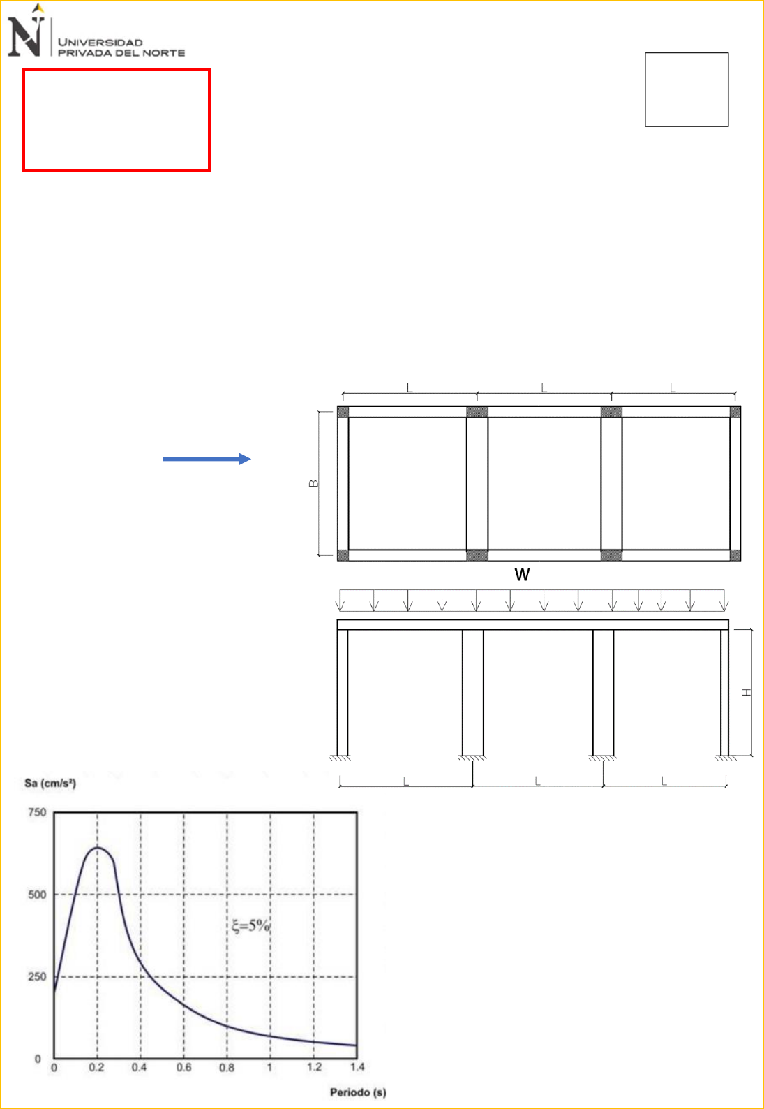 Facultad de Ingeniería UG (Lima Centro) 1 EXAMEN PARCIAL INGENIERIA SISMORRESISTENTE INGENIERIA CIVIL SEMESTRE 2020-2 1. Se muestra la planta y elevación de un almacén, con carga distribuida de W= 2.5 tonf/m2 Considerar modulo elástico E=2.1x106 tonf/m2 y un amortiguamiento ξ de 5%. Las características geométricas son las siguientes: B= 5.0m, H=5.0m, L=4.0m. Considerar las columnas de sección 0.40mx0.40m y 0.40mx0.80m Calcular la rigidez de la estructura K, la frecuencia circular natural n, con el periodo Tn y con el espectro de respuesta en aceleración en figura determinar el máximo desplazamiento Dmax de la estructura. (4 puntos) Determinar el momento total en la base de la estructura y el momento en una columna de sección 0.40x0.40m y en una columna 0.40x0.80m. (4 puntos) FILA A ESTUDIANTE CON CODIGO QUE TERMINA CON EL NUMERO DE 0 A 2 Dir. Análisis Facultad de Ingeniería UG (Lima Centro) 2 COL.1 COL.2 P= 2.5 tn/m2 h 0.40 m h 0.80 m E= 2.10E+06 tn/m2 b 0.40 m b 0.40 m B= 5.00 m H= 5.00 m L= 4.00 m I40x40= 0.00213 m4 I80x40= 0.01707 m4 Ktot= 1.55E+04 tn/m Peso= 150 tn masa= 15.29051988 tn*s2/m w= 31.82 rad/s frec. Natural T= 0.1975 s Sa 6.50 M/S2 FR= 99.39 tn Mtot0 496.94 tn*m Dtot0 0.006 0.64 cm kcol1 430.08 kcol2 3440.64 Mcol1 13.80 Mcol2 110.43 Facultad de Ingeniería UG (Lima Centro) 3 2. Determinar la frecuencia natural, el periodo y la frecuencia cíclica del sistema mostrado en figura, el cual consiste en un anuncio de peso P= 2500.00 N, el cual está sostenido por una viga en voladizo a través de un cable. La viga con un extremo empotrado, cuenta con una altura h = 0.25m y un ancho b= 0.25m, un módulo de elasticidad E=1.8x104 Mpa y una longitud L1=1.50m . El cable tiene un diámetro de 0.02m y cuenta con un módulo de elasticidad E= 2.1x105 Mpa y una longitud L2= 0.50m. (6 ptos) P= 2500 N VIGA CABLE h 0.25 m diam. 0.020 m b 0.25 m L 0.50 m L 1.50 m E= 2.10E+05 Mpa E= 1.80E+04 Mpa Iviga= 0.000325521 m4 Kviga= 5.21E+06 N/m A. elastico= 0.000314159 m2 Kcable= 1.32E+08 N/m Ktot= 5.01E+06 masa= 254.84 N*s2/m w= 140.22 rad/s frec. Natural T= 0.0448 s f= 22.32 Hz Facultad de Ingeniería UG (Lima Centro) 4 3. Un peso unido a un resorte de 525N/m es un sistema amortiguado. Cuando el peso es desplazado y dejado libre, el periodo de vibración amortiguado resultante es 1.80s y en 2 amplitudes consecutivas se pasa de 4.2cm a 1.0cm. Determinar la amplitud cuando la fuerza F=2cos3t actúa en el sistema. Para el decremento logarítmico usar la formula completa del decremento logarítmico y recordar la relación entre D estático y D dinámico. (6 ptos) 𝛿 = 2𝑛𝜋𝜉 √1 − 𝜉2 K= 525 N/m A1= 4.2 td= 1.8 s A2= 1 F= 2 cos3t δ= 1.435 ξ= 0.223 ωd= 3.491 ωn= 3.581 β=ωd/ωn= 0.83786 X= 0.00798 m 0.798 cm