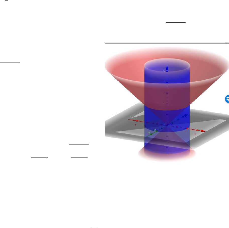 Sección 15.8 Integrales Triples en Coordenadas Cilíndricas 1 CALCULO 2: Ejercicios resueltos A continuación se presentan algunos ejercicios resueltos en relación a los temas trabajados en la sección 15.8 para que éstos sirvan de modelo a la hora de desarrollar los ejercicios propuestos. Para trabajar con coordenadas cilíndricas y esféricas, debemos tener a mano la relación entre ellas y las coordenadas rectangulares: Las coordenadas cilíndricas (𝑟, 𝜃, 𝑧) se relacionan con las rectangulares (𝑥, 𝑦, 𝑧) de la siguiente forma: 𝑥 = 𝑟𝑐𝑜𝑠𝜃 , 𝑦 = 𝑟𝑠𝑒𝑛𝜃 , 𝑧 = 𝑧 , con 0 ≤ 𝜃 < 2𝜋 𝑡𝑎𝑛𝜃 = 𝑦 𝑥 𝑟2 = 𝑥2 + 𝑦2 . Ejercicio: Calcule el volumen del sólido acotado por las gráficas de 𝑧 = √𝑥2 + 𝑦2 , 𝑥2 + 𝑦2 = 4, y 𝑧 = 0. Primero que nada, tratemos de visualizar el sólido en cuestión: 𝑧 = √𝑥2 + 𝑦2 es la ecuación de un cono. 𝑥2 + 𝑦2 = 4 es la ecuación de un cilindro circular de radio 2, con centro en el origen. 𝑧 = 0 es el plano xy. El sólido es lo que se encuentra sobre el plano xy, debajo del cono y dentro del cilindro. Si lo quisiéramos plantear en coordenadas rectangulares, tendríamos los siguientes límites: 0 ≤ 𝑧 ≤ 𝑐𝑜𝑛𝑜, es decir 0 ≤ 𝑧 ≤ √𝑥2 + 𝑦2 −2 ≤ 𝑥 ≤ 2 y −√4 − 𝑥2 ≤ 𝑦 ≤ √4 − 𝑥2 y la función del integrando sería 𝑓(𝑥, 𝑦, 𝑧) = 1 por tratarse de un volumen mediante una integral triple. Como nos piden calcular el volumen usando coordenadas cilíndricas tendremos los siguientes límites: 0 ≤ 𝑧 ≤ 𝑟 ya que si paso la ecuación del cono a cilíndricas obtengo 𝑧 = 𝑟, y además el sólido está sobre el plano xy, es decir 𝑧 = 0; y viendo que la intersección entre el cono y el cilindro es un círculo de radio 2 obtenemos que 0 ≤ 𝑟 ≤ 2 y 0 ≤ 𝜃 ≤ 2𝜋. Con todo esto: 𝑉 = ∫ ∫ ∫ 𝑟 𝑑𝑧 𝑑𝑟 𝑑𝜃 𝑟 0 2 0 2𝜋 0 = 16 3 𝜋 Sección 15.8 Integrales Triples en Coordenadas Cilíndricas 2 Ejercicio: Evaluar la integral cambiando a coordenadas cilíndricas: ∫ ∫ ∫ 𝑥𝑧 𝑑𝑧𝑑𝑥𝑑𝑦 2 √𝑥2+𝑦2 √4−𝑦2 −√4−𝑦2 2 −2 Para pasar a coordenadas cilíndricas, debemos poder esbozar la región de integración, o al menos interpretarla e imaginarla. Estos límites nos indican: √𝑥2 + 𝑦2 ≤ 𝑧 ≤ 2 , −√4 − 𝑦2 ≤ 𝑥 ≤ √4 − 𝑦2 , −2 ≤ 𝑦 ≤ 2 - Miremos los límites de z: 𝑧 = √𝑥2 + 𝑦2 (o bien 𝑧2 = 𝑥2 + 𝑦2) es un cono, que, en coordenadas cilíndricas su ecuación es 𝑧 = 𝑟 (Ver ejemplo 2 pág. 1029). 𝑧 = 2 es un plano. De aquí tendríamos, en coordenadas cilíndricas que 𝑟 ≤ 𝑧 ≤ 2 - Miremos los límites de x y de y: igualando tenemos 𝑥 = ±√4 − 𝑦2 o, equivalentemente, 𝑥2 + 𝑦2 = 4, lo cuál es un círculo de radio 2 en el plano xy. Pensando en coordenadas cilíndricas, de aquí obtenemos los límites de 𝑟 y 𝜃: 0 ≤ 𝑟 ≤ 2 y 0 ≤ 𝜃 ≤ 2𝜋 Por lo tanto, al expresar la integral dada en coordenadas cilíndricas obtenemos ∫ ∫ ∫ 𝑥𝑧 𝑑𝑧𝑑𝑥𝑑𝑦 2 √𝑥2+𝑦2 √4−𝑦2 −√4−𝑦2 2 −2 = ∫ ∫ ∫ (𝑟𝑐𝑜𝑠𝜃 𝑧) 𝑟 𝑑𝑧𝑑𝑟𝑑𝜃 2 𝑟 2 0 2𝜋 0