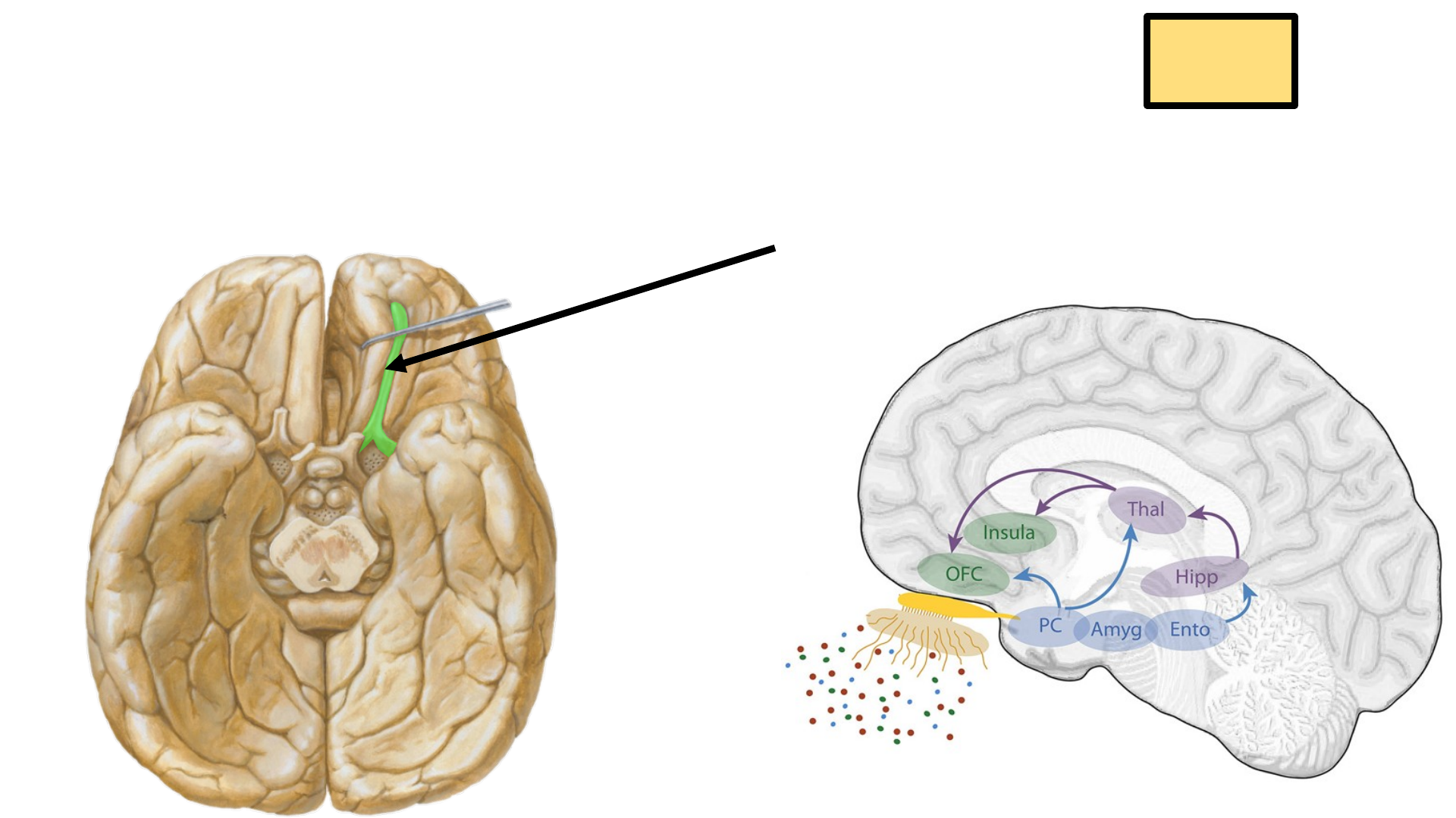 1er Par Craneal: NERVIO OLFATORIO 2 2/2 Centros Vías de Asociación Dr. Juan José Sánchez Médico Cirujano - UDO NERVIO OLFATORIO (I) Dr. Juan José B. Sánchez Espinoza Centros Olfatorios Núcleo Olfatorio Anterior -En la sustancia gris del Tracto Olfatorio -Aferencias: Células Mitrales y En Penacho homolaterales Axones del N.O.A y Bulbo Olfatorio Contralaterales -Las aferencias pasan por la Comisura Anterior Tubérculo Olfatorio -En la parte anterior de la Sustancia Perforada Anterior -Es un núcleo del Cuerpo Estriado Ventral Núcleo Amigdalino -Núcleo Cortical Anterior de la Amígdala -Corteza Periamigdalina -A través de la Estría Olfatoria Lateral -De aquí salen aferencias para los Centros del Hipocampo NERVIO OLFATORIO (I) Centros Olfatorios Corteza Olfatoria -En dónde se Identifican y Reconocen los olores -Se encuentra en el Lóbulo Piriforme -Porción rostral del Giro Parahipocampal 3 Regiones Corticales: 1. Periamigdalina -Dorsal al complejo Amigdalino -Corresponde al Giro Semilunar y al Uncus 2. Entorrinal -Encima del Surco Rinal -Debajo y Delante de la Corteza Periamigdalina -Lateral al Uncus -Corresponde al área 28 de Brodmann -Memoria relacionada a olores 3. Prepiriforme -Formada por el Giro Ambiens y Giro Olfatorio Lateral *Territorio Anterior: Codifica la estructura de las moléculas de los olores *Territorio Posterior: Identificación del objeto al cual pertenece el olor Dr. Juan José B. Sánchez Espinoza NERVIO OLFATORIO (I) Dr. Juan José B. Sánchez Espinoza Corteza Asociativa Olfatoria -Comprende áreas de los Giros Orbitarios -Conexiones con la ínsula Rostral -Se conecta con la Corteza Piriforme -A través del Núcleo Dorsomedial del Tálamo Vías de Asociación y Conexiones Entre los Centros Olfatorios entre sí -Centros Temporales y Frontales se unen del Mismo Lado: *Estrías Longitudinales Medial y Lateral *Cintilla Cinérea *Giro Dentado *Estría Terminal Del lado Contrario: *Comisura Anterior *Comisura del Fórnix *Comisura de la Habénula No Olvides Suscribirte, Darle Like y Compartir!!! @ juan_sanchez1315 Dr. Juan José Sánchez Sígueme en: