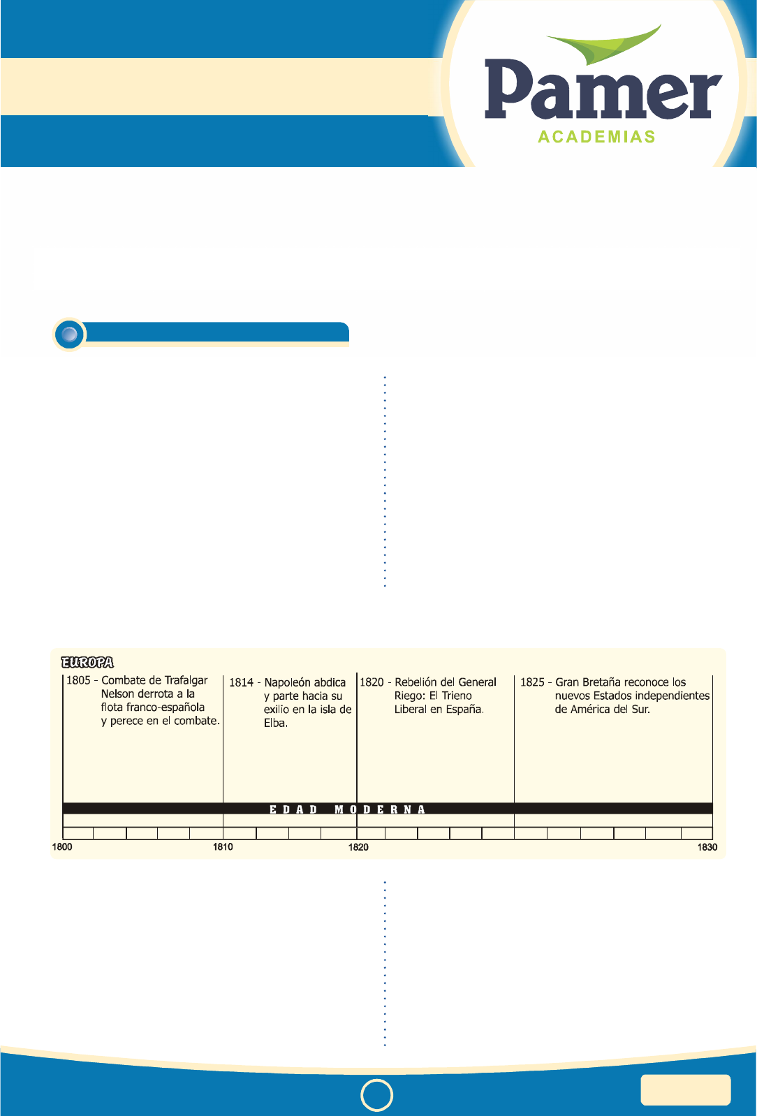 1 HISTORIA DEL PERÚ TEMA 6SAN MARCOS VERANO 2016 – I SPI2HP6 HISTORIA DEL PERÚ TEMA 6 INDEPENDENCIA En el período que va desde la insurrección de Túpac Amaru II (1780) hasta la proclamación de la Independencia en 1821, o, mejor, hasta su consolidación en Ayacucho en 1824, la economía peruana empezaba a ser crecientemente sometida a la dominación inglesa, siendo España cada vez más desplazada por las nuevas potencias burguesas e industriales en ascenso. Inglaterra necesitaba expandir sus mercados para colocar sus productos industriales y, para ello, necesitaba quebrar completamente el monopolio español. El aplastamiento de la Rebelión de Túpac Amaru implica que los criollos lideraran el movimiento patriota emancipador. Se postergaron así, de hecho, las reivindicaciones e intereses, de las masas populares. El movimiento emancipador criollo estuvo impulsado tanto por motivaciones y sentimientos nacionalistas como por sus propios intereses económicos. Por ello, aunque existió participación popular durante la emancipación, expresaba principalmente en la acción de guerrilleros o montoneros, el movimiento independentista no puede ser visto como dirigido por los grupos populares, ni sirviendo a sus intereses. Señalar estos hechos no es negar el heroísmo de los patriotas de la Independencia como Bolívar, San Martín o Sánchez Carrión, por el contrario, es justamente la conjunción de ambos factores -las calidades personales heroicas, de un lado, y de otro; los intereses y las condiciones económicas propicias-, lo que permitió la culminación de nuestra independencia en los campos de Ayacucho. LÍNEA DE TIEMPO shipibos (selváticos), con los que destruyó el fuerte español de Quimiri, pero fracasó al pretender tomar Jauja. Fue una rebelión con fuertes contenidos mesiánicos y milenaristas: Juan Santos se presentaba como descendiente de Atahualpa y heredero de un nuevo Tahuantinsuyo; hacía predicciones apocalípticas acerca del fin de los tiempos y la destrucción del mundo. En 1751, Juan Santos se replegó hacia los territorios que dominaba, muriendo aparentemente en 1756. DESARROLLO DEL TEMA A. Rebelión de Juan Santos Atahualpa Fue un mestizo que había sido sirviente y discípulo de los jesuitas. Esta rebelión tuvo lugar durante el gobierno de los virreyes Marqués de Villagarcía y Conde de Superunda. Fue un movimiento dirigido sobre todo contra las misiones franciscanas de esa zona. Se alzó en 1742 en el Gran Pajonal, Chanchamayo y Oxapampa. Dirigió un contingente de indios campas, piros, conibos y INDEPENDENCIA 2HISTORIA DEL PERÚTEMA 6 SAN MARCOS VERANO 2016 – I - Túpac Amaru cometió el error de no atacar el Cusco prefiriendo ir al Altiplano con 50 000 indios y mestizos mal armados. - Cercó la ciudad del Cusco (4-1-1781), pero fracasó por la ayuda a los españoles brindada por el cacique de Chincheros, Mateo Pumacahua. - El mariscal José del Valle y el visitador José Antonio de Areche llegan al Cusco (23-2-1781) con 17 000 soldados bien armados. - Se produce la batalla decisiva de Checacupe, en la que Túpac Amaru es derrotado (6-4-1781). - Túpac Amaru y su familia son entregados por el traidor Ventura Landaeta y juzgados por el juez y el oidor Benito de la Mata Linares. - Ejecución del caudillo, su esposa Micaela Bastidas, de la cacica de Acos, Tomasa Tito Condemayta, del hijo mayor del caudillo, Hipólito Túpac Amaru, Antonio Oblitas, etc. (18-4-1781). - La rebelión la continuó en el Altiplano Diego Cristóbal Túpac Amaru, pero se acogió al perdón de Sicuani (26-1-1782), s in embargo los españoles luego lo apresaron y lo ejecutaron en el Cusco (19-7-1783). ¿Por qué Túpac Amaru se sublevó en la región sur? 1. Hubo una acentuada supervivencia de la cultura andina. 2. Elevada presión en el reparto: Nuevo Impuesto. 3. Fue la zona más afectada por la mita minera. 4. Hubo gran densidad de población indígena. 5. Gran número de caciques. 6. Fue la zona más afectada por las reformas borbónicas. 7. Separación del Alto Perú. D. Fase aimara • Líderes: Azángaro (Diego Cristóbal), Alto Perú (Túpac Catari). • Paz de Sicuani firmado entre los españoles y Diego Cristóbal, que fue traicionado y ejecutado al igual que Túpac Catari. B. Rebelión de Túpac Amaru II Fue la más grande rebelión indígena contra el poder español que conoció el continente sudamericano. Túpac Amaru fue cacique de Tungasuca, Surimana y Pampamarca y se dedicó al negocio de la arriería (tenía más de 300 mulas) su ruta comercial es de Cusco a Buenos Aires. Las dos actividades que desempeñó le permitieron constatar los grandes males que padecían sus gobernados por la mita de Potosí, el repartimiento de mercaderías, el cobro del tributo y las nuevas aduanas establecidas por los españoles. Desde 1770 inició gestiones que pretenden sea declarado legalmente descendiente de los incas. Llegó a Lima (1777 – 1778) a pedir justicia, pero sus gestiones fueron infructuosas, por lo que organizó un movimiento armado que abarcó Cusco, Puno y el actual altiplano boliviano, el cual se inició al abortar la rebelión de los plateros y del cacique de Pisac, Bernardo Tabowaqso en el Cusco (1780). C. Fase Cusqueña 1. Causas primarias • Las Reformas Borbónicas, que, al crear el Virreinato del Río de la Plata, afectaron al comercio tradicional. • Incremento de los impuestos, como la alcabala y el establecimiento de aduanas terrestres. 2. Causas secundarias El repartimiento mercantil, la mita indígena, los obrajes, el sistema de corregidor y el pedido de establecimiento de una Audiencia en Cusco. 3. Características del movimiento • Geográficamente se desarrolló entre Cusco y Puno. • Solo fue dirigido por la élite indígena de la sierra sur. • Integró diversos estamentos según intereses. • Fue de carácter mesiánico y reformistas. • Fue la culminación de un siglo de rebeliones indígenas (siglo XVIII). Principales hechos - Inicio de la 