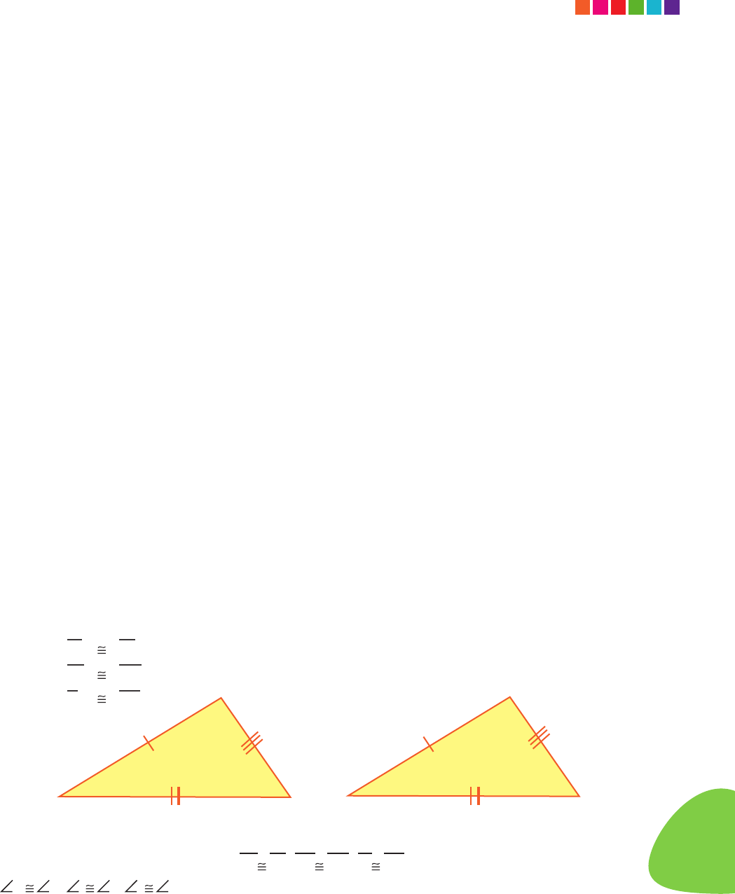 • Socializa tu respuesta a los compañeros del curso. • Comprueben su respuesta realizando los dibujos de los siguientes triángulos, cada uno realiza el triángulo luego los comparan con tres compañeros. Los triángulos tienen las siguientes longitudes: a. 5 cm, 2 cm y 4 cm, respectivamente b. 6 cm, 6 cm y 6 cm, respectivamente c. 8 cm, 4 cm y 5 cm, respectivamente d. 6 cm, 4 cm y 7 cm, respectivamente • ¿Todos los triángulos que tienen las mismas longitudes coincidieron en el curso? Por lo tanto, es posible afirmar que cuando se tienen dos triángulos que coinciden en las medidas de sus lados se puede determinar que son triángulos congruentes. Este es un criterio conocido en la congruencia de los triángulos como: LADO-LADO- LADO y se simboliza (L-L-L). Lados de un triángulo K M LH J I JI HJ HI ML KM KL Para mostrar este criterio, trasladamos el triángulo HIJ, sobre el triángulo KLM, lue- go sus lados coinciden porque HI KL; HJ KM; JI ML. Luego podemos observar que H K ; I L ; J M, entonces, como todos los elementos del triángulo HIJ coinci- den con los elementos del triángulo KML, los triángulos son congruentes. Dos triángulos son congruentes cuando los tres lados de uno de ellos son respectivamente congruentes con los tres lados del otro triángulo. 163 Guía 15 • Postprimaria Rural • ¿Será que sucede lo mismo con los cuadriláteros? ¿Siempre que coincidan en la longitud de los lados estos serán congruentes? • Comprueba tu respuesta dibujando dos cuadriláteros cuyos lados midan 3 cm, 4 cm, 5 cm y 11 cm, respectivamente. • ¿Coincidieron? • Cambia el orden de las medidas de los lados en uno de los cuadriláteros dibujados, ¿éste será congruente a uno o ambos de los cuadriláteros dibujados? • Socializa la respuesta con tus compañeros del curso y realicen varias propuestas para que se vean cuáles serían las condiciones mínimas para que todos dibuja- ran el mismo cuadrilátero. Compruébelas y ajústenlas para que se construya el mismo cuadrilátero. Analicen los siguientes cuadriláteros para determinar si son congruentes y observen si la condición es suficiente y necesaria para que se dé ese caso de congruencia. A. Coinciden en la longitud de los lados pero estos no son correspondientes. B. Coinciden en la longitud de los lados y son correspondientes. C. Coinciden en dos lados y el ángulo entre ellos. 164 Matemáticas • Grado 8 Determinar las condiciones mínimas para que todos realicen el mismo cuadrilátero hizo que se pensará en determinar triángulos en ellos para que fuera más fácil su estu- dio frente a la congruencia y otras relaciones con otros triángulos. • Determina dos triángulos en cada uno de los siguientes cuadriláteros. a c d b a c d b Con dicho procedimiento, se generaron otros criterios que se asocian a los triángulos y son los que permiten, a través del procedimiento de triangulación, determinar que otros polígonos sean congruentes. Dichos criterios de congruencia son: (L-A-L) lado – ángulo – lado Se establece que al analizar un ángulo y los lados que forman ese ángulo y este ángulo forma parte de un triángulo y al comparar con otro triángulo; y coincide dicho ángulo con sus respectivos lados en este nuevo triángulo entonces podemos decir que son triángulos congruentes. Observa la gráfica que representa el criterio: Relaciones de los lados de un triángulo C D E F A B DFAB AC DE A D 165 Guía 15 • Postprimaria Rural