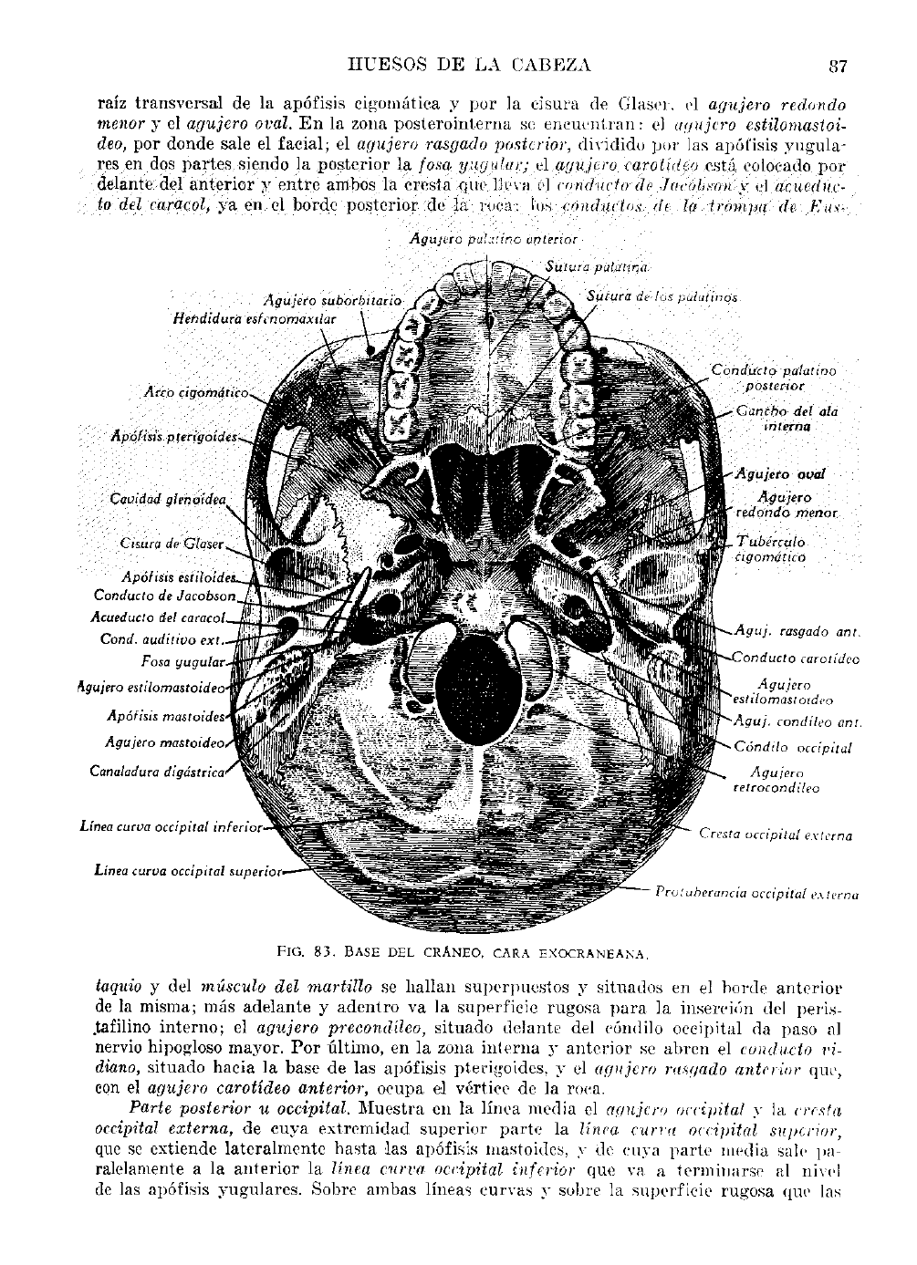 HUESOS DE LA CABEZA 87 raíz transversal de la apófisis c rom ática y por la cisura de Glaser. el agu jero redondo m enor y el agu jero oval. E n la zona posteroinlerna se encuentran : el agu jero es tilomastoi- deo, por donde sale el facial; el agu jero rasgado posterior , dividido por las apófisis yugula res en dos partes siendo la posterior la fo sa yugular; el a gu jero earo tídeo está colocado por delante del anterior y entre ambos la cresta que lleva el conduc to de -Jacubson y el a c u e d u c to del caracol, ya en el borde posterior de la. roca: los conduc tos dt la t ro m p a de Kus- A g u j e r o p a l . n i n o a n te r io r -i A g u j e r o s u b o r b i ta r io H e n d i d u r a e s f c n o m a x ü a r S u t u r a p a la t in a S u t u r a de lo s p a la t in o s Arco cigomático Apófisis pterigoides '■ Cavidad glenatdeai Cisura de Glaser Apófisis esiiloide. Conducto de Jacobson Acueducto del caracol Cond. auditivo ext. Fosa yugular Agujero estilomastoideo Apófisis mastoides Agujero mastoideo Canaladura digástrica Línea curva occipital inferior Línea curva occipital superior Conducto palatino posterior Gancho del ala in te r n a A g u j e r o o v a l Agujero redondo menor T u b é r c u lo c i g o m á t i c o A g u j . rasgado an t . o n d u c t o earo t ídeo A g u j e r o e s t i l o m a s to id e o A g u j . c o n d i l e o ant . C ó n d i l o occ ip i ta l A g u j e r o r e t r o c o n d i le o C re s ta o c c ip i ta l e x t e r n a P r o tu b e r a n c ia o c c ip i ta l ex ter F i g . 8 3 . B a s e d e l c r An e o . c a r a e x o c r a n e a n a . taquio y del m úscu lo d e l m a r t i l lo se hallan superpuestos y situados en el borde anterior de la misma; más adelante y adentro va la superficie rugosa para la inserción del peris- .tafilino interno; el agu jero precondíleo , situado delante del cóndilo occipital da paso al nervio hipogloso mayor. P or último, en la zona in terna y anterior se abren el conduc to vi- diano, situado hacia la base de las apófisis pterigoides. y el a gu jero rasgado a n te r io r que, con el agujero earotídeo an ter ior , ocupa el vértice de la roca. P arte poster ior u occipital. M uestra en la línea media el a gu jero occip ita l y la cresta occipital ex terna , de cuya extrem idad superior parte la linca c u r ra occ ip ita l superior , que se extiende lateralm ente basta las apófisis mastoides, y de cuya parto media sale pa ralelamente a la anterior la línea curva occ ip ita l in fe r io r que va a term inarse al nivel de las apófisis yugulares. Sobre ambas líneas curvas y sobre la superficie rugosa que las