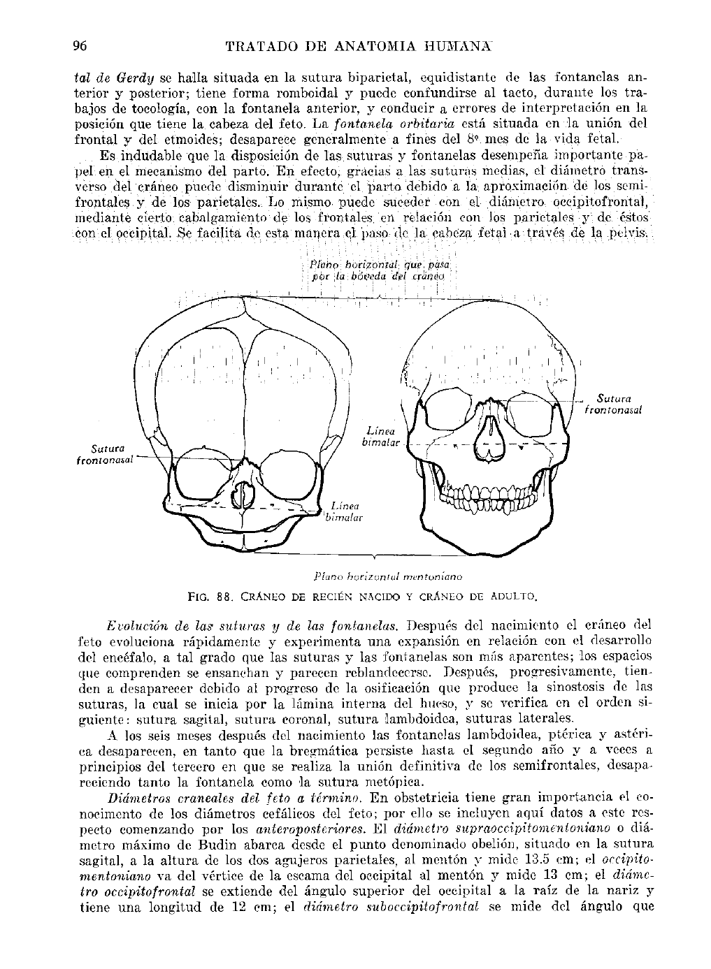 96 TRATADO DE ANATOM IA HUM ANA tal de Gerdy se halla situada en la su tu ra biparietal, equidistante de las fontanelas an terior y posterior; tiene forma romboidal y puede confundirse al tacto, duran te los tra bajos de tocología, con la fontanela anterior, y conducir a errores de interpretación en la posición que tiene la cabeza del feto. La fontanela orbitaria está situada en la unión del frontal y del etmoides; desaparece generalmente a fines del 89 mes de la vida fetal. Es indudable que la disposición de las suturas y fontanelas desempeña im portante pa pel en el mecanismo del parto. E n efecto, gracias a las suturas medias, el diám etro tran s verso del cráneo puede dism inuir durante el parto debido a la aproximación de los semi- frontalcs y de los parietales. Lo mismo puede suceder con el diám etro occipitofrontal, m ediante cierto cabalgamiento de los frontales, en relación con los parietales y de éstos con el occipital. Se facilita de esta m anera el paso de la. cabeza fetal a través de la pelvis. P la n o , h o r i z o n t a l qu e pa.ta . P l a n o h o r i z o n t a l m e n to n ia n o F ig . 8 8 . Cr á n e o d e r e c ié n n a c id o y c r á n e o d e a d u l t o . Evolución de las suturas y de las fontanelas. Después del nacimiento el cráneo del feto evoluciona rápidam ente y experim enta una expansión en relación con el desarrollo del encéfalo, a ta l grado que las su turas y las fontanelas son más aparentes; los espacios que comprenden se ensanchan y parecen reblandecerse. Después, progresivamente, tien den a desaparecer debido al progreso de la osificación que produce la sinostosis de las suturas, la cual se inicia por la lám ina in terna del hueso, y se verifica en el orden si guiente: su tura sagital, su tu ra coronal, su tura lambdoidea, su turas laterales. A los seis meses después del nacimiento las fontanelas lambdoidea, p térica y astéri- ca desaparecen, en tanto que la bregmática persiste hasta el segundo año y a veces a principios del tercero en que se realiza la unión definitiva de los semifrontales, desapa reciendo tanto la fontanela como la su tu ra metópica. Diámetros craneales del feto a término. E n obstetricia tiene gran im portancia el co- nocimento de los diámetros cefálicos del feto; por ello se incluyen aquí datos a este res pecto comenzando por los aníeroposteriores. E l diámetro supraoccipitomenioniano o diá metro máximo de B udin abarca desde el punto denominado obelión, situado en la sutura sagital, a la a ltu ra de los dos agujeros parietales, al mentón y mide 13.5 cm; el occijñto- mentoniano va del vértice de la escama del occipital al m entón y mide 13 cm; el diáme tro occipitofrontal se extiende del ángulo superior del occipital a la raíz de la nariz y tiene una longitud de 12 cm; el diámetro suboccipitofrontal se mide del ángulo que