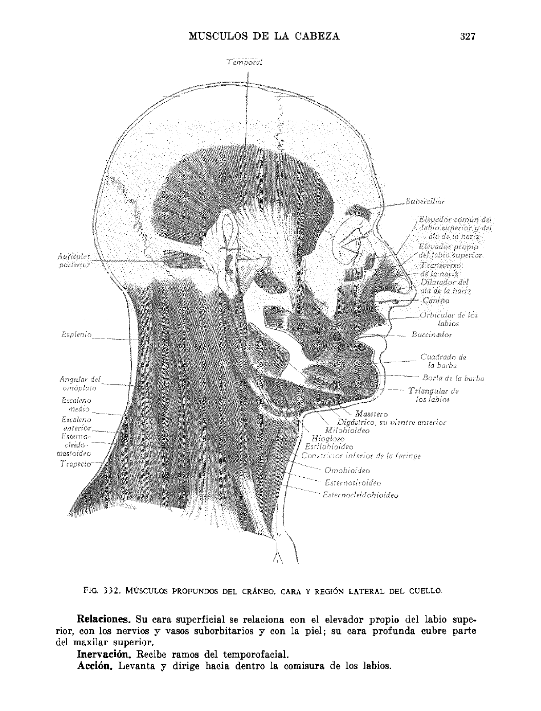 T em p o ra l MUSCULOS D E LA CABEZA 327 F ig . 3 3 2 . MÚSCULOS PROFUNDOS d e l c r á n e o , c a r a y r e g i ó n l a t e r a l d e l c u e l l o . Relaciones. Su cara superficial se relaciona con el elevador propio del labio supe rior, con los nervios y vasos suborbitarios y con la piel; su cara profunda cubre parte del m axilar superior. Inervación. Recibe ramos del temporofacial. Acción. Levanta y dirige hacia dentro la comisura de los labios.