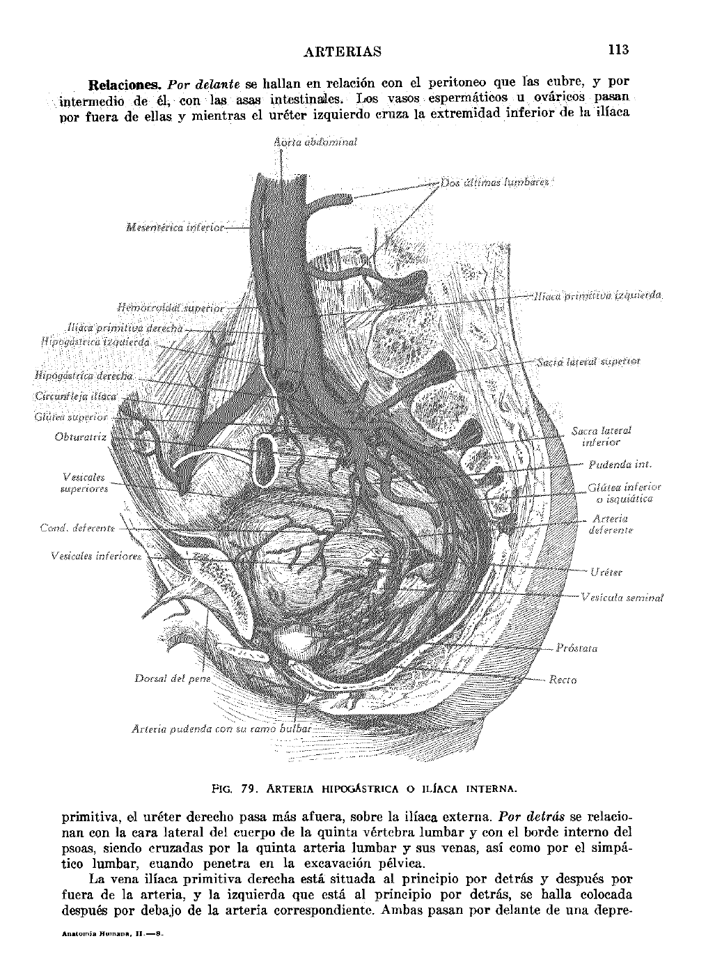 A R T E R IA S 113 R elaciones. Por delante se hallan en relación con el peritoneo que las cubre, y por interm edio de él, con las asas in testinales. Los vasos esperm áticos u ováricos pasan por fuera de ellas y m ien tras el u ré te r izquierdo cruza la extrem idad in fe rio r de la ilíaca P lG . 7 9 . A RTERIA HIPOGÁSTRICA O ILÍACA INTERNA. prim itiva, el u ré te r derecho pasa más afuera, sobre la ilíaca externa. Por detrás se relacio nan con la cara la te ra l del cuerpo de la qu in ta vérteb ra lum bar y con el borde in terno del psoas, siendo cruzadas po r la qu in ta a r te ria lum bar y sus venas, así como por el sim pá tico lum bar, euando pen etra en la excavación pélvica. La vena ilíaca p rim itiva derecha está situada al principio por de trás y después por fuera de la a rte ria , y la izquierda que está al p rincip io por detrás, se halla colocada después por debajo de la a rte ria correspondiente. Am bas pasan po r delante de una depre- A n a to m ía H u m a n a . I I •— 8-