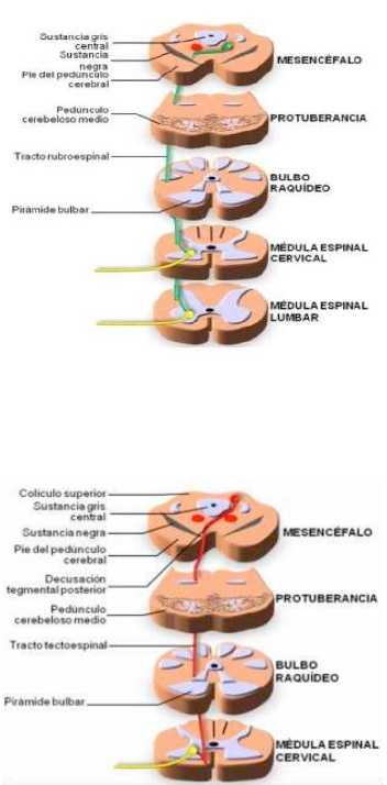 92 ANGEL CHU LEE / SILVANA CUENCA BUELE / MARCELO ISAIAS LOPÉZ atraviesa caudalmente el tronco cerebral, proporciona continuamente fibras (inervación voluntaria) a los diversos núcleos motores de los pares craneales (contralaterales principalmente). Algunas de sus fibras se proyecta directamente sobre el núcleo del V, VII, XII pares craneales (inervación bilateral). La mayoría de sus fibras terminan en núcleos reticulares, antes de alcanzar los núcleos de los nervios craneales.5 Tracto Rubroespinal. Se origina en el núcleo rojo del tegmento mesencefálico, los axones de las neuronas en este núcleo cruzan la línea media en la decusación tegmental anterior y descienden como el tracto rubroespinal a través de la protuberancia y el bulbo raquídeo. Llegan a la médula espinal y descienden por el cordón blanco lateral y terminan haciendo sinapsis con neuronas internunciales o de asociación del asta gris anterior. Las neuronas del núcleo rojo reciben impulsos aferentes de la corteza motora y desde el cerebelo. Se cree que ésta es una vía indirecta importante por la cual la corteza cerebral y el cerebelo pueden influir la actividad de las neuronas motoras alfa y gamma de la médula espinal. El tracto facilita la actividad de los músculos flexores e inhibe la actividad de los músculos extensores y antigravitacionales. Figura 5.17. Ilustración de los Tractos Rubroespinal Figura 5.18. Ilustración de los Tractos Tectoespinal Tracto Tectoespinal. La vía tectoespinal tiene su origen en las neuronas del tubérculo cuadrigémino superior. Las fibras corren hacia delante y adentro en el tegmento del mesencéfalo y después se cruzan con las del lado opuesto, por delante del acueducto de Silvio, descienden por delante del fascículo longitudinal medio hasta ocupar el cordón anterior de la médula espinal y terminar al fin, en las neuronas del asta anterior.
