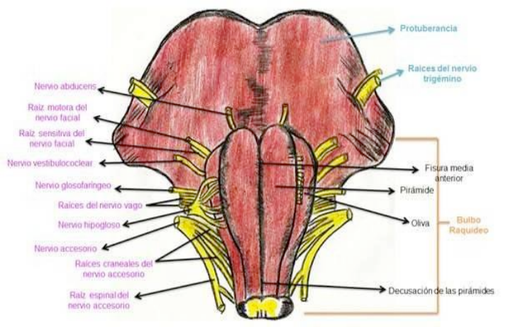 100 ANGEL CHU LEE / SILVANA CUENCA BUELE / MARCELO ISAIAS LOPÉZ Figura 6.2. Vista Anterior del Bulbo Raquideo cara lateral En posición lateral y posterior respecto de las pirámides están las olivas bulbares, que son elevaciones ovales producidas por los núcleos olivares inferiores. En el surco entre la pirámide y la oliva (surco preolivar) surgen las raíces del nervio hipogloso (XII). Por detrás de las olivas se encuentran los pedúnculos cerebelosos inferiores (cuerpos restiformes), que conectan el bulbo con el cerebelo, y forman el piso del receso lateral del cuarto ventrículo. Del surco ubicado entre la oliva y el pedúnculo cerebeloso inferior (surco retroolivar) surgen las raíces de los nervios glosofaríngeo (IX), vago (X) y las raíces craneanas del nervio accesorio (XI). cara posterior La superficie posterior de la mitad superior del bulbo raquídeo forma el triángulo inferior del piso del cuarto ventrículo (revisar cuarto ventrículo). En la superficie posterior de la mitad inferior del bulbo el surco mediano posterior se continúa con la estructura homónima de la superficie posterior de la médula espinal. Hacia arriba , encontramos el OBEX, que corresponde con el ángulo inferior del cuarto ventrículo. A cada lado del surco mediano posterior hay un engrosamiento alargado, el tubérculo grácil, producido por el núcleo grácil subyacente. Por fuera del tubérculo grácil hay un engrosamiento similar, el tubérculo cuneiforme, producido por el núcleo cuneiforme subyacente.