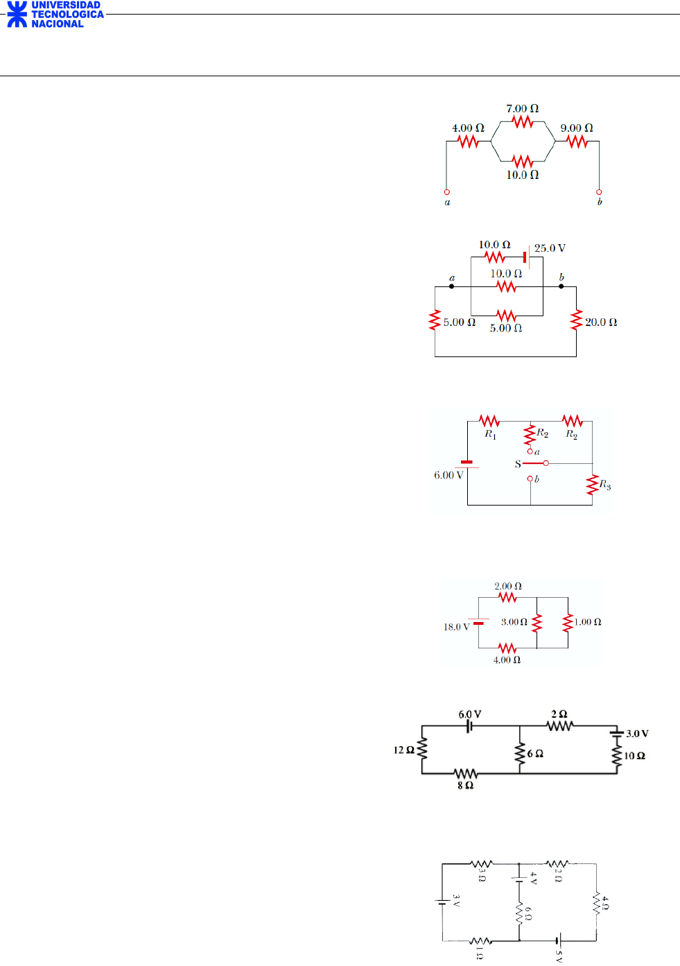 FÍSICA II Trabajos prácticos para ingenierías 1 Práctico 7: ELECTROCINÉTICA - Circuitos 1- (a) Determine la resistencia equivalente entre los puntos a y b de la figura (b) Si entre los puntos a y b se aplica una diferencia de potencial de 34,0 V, calcule la corriente en cada resistencia? • a) 17,1 Ω; b) 1,99 A para 4,00 Ω y 9,00 Ω, 1,17 A para 7,00 Ω y 0,818 A para 10,0 Ω 2- Considere el circuito que se muestra en la figura. Determine (a) la corriente en la resistencia de 20,0 Ω y (b) la diferencia de potencial entre los puntos a y b. • a) I = 227 mA; b) ∆V = 5,68 V 3- Una batería de 6,00 V suministra corriente al circuito de la figura. Cuando el interruptor de doble posición S está abierto, como se muestra, la corriente en la batería es de 1,00 mA. Cuando el interruptor se cierra en la posición a, la corriente en la batería es de 1,20 mA. Cuando el interruptor se cierra en la posición b, la corriente en la batería es de 2,00 mA. Determine las resistencias R1, R2 y R3 • R1 = 1,00 kΩ, R2 = 2,00 kΩ, R3 = 3,00 kΩ 4- Calcule la potencia entregada a cada resistencia en el circuito que se muestra en la figura • P1 = 4,00 W, P2 = 14,2 W, P3 = 1,33 W, P4 = 28,4 W 5- Calcule las corrientes en cada resistencia de la figura • 2,00 Ω: 0,26A, 6,00 Ω: 0,028 A, 8,00 Ω: 0,29 A, 10,0 Ω: 0,26 A, 12,0 Ω: 0,29 A 6- Resolver el circuito de la figura a partir del estudio de cada uno de sus elementos. • La potencia suministrada por las baterías y la energía por unidad de tiempo disipada en las resistencias. • Comprobar la conservación de la energía. • P3V = - 0,642 W; P4V = 0,0952 W; P5V = 0,950 W FÍSICA II Trabajos prácticos para ingenierías 2 • P1Ω = 0,0457 W; P2Ω = 0,0722 W; P3Ω = 0,137 W; P4Ω = 0,144 W; P6Ω = 0,00340 W 7- Determine los valores de Ix, Vx y del resistencia R. • R = 3,00 Ω; Ix = 3,00 A; Vx = 78.0 V 8- En el circuito indicado en la figura, las baterías tienen una resistencia interna despreciable. a) Hallar la corriente en cada resistencia, b) la diferencia de potencial entre los puntos a y b, y c) la potencia suministrada por cada batería. a) I1 = 0,240A; I2 = -0,785 A; I3 = -0,545 A b) ∆Vab = 2,40 V c) P1 = 6,54 W; P2 = 2,88 W; P3 = -4,71 W 9- Para el circuito que se muestra en la figura, la resistencia R tiene un valor de 5,00 Ω y ε = 20,0 V. Encuentre las lecturas en el amperímetro y el voltímetro. Suponga que los medidores son ideales. • I = 3,90 A: V = 4,30 V 10- La corriente a través del resistor de 4,00 kΩ en la figura es de 3,10 mA. ¿Cuál es el voltaje terminal Vba de la batería “desconocida”? (Existen dos respuestas. ¿Por qué?) • Vba = 48 V, -24 V