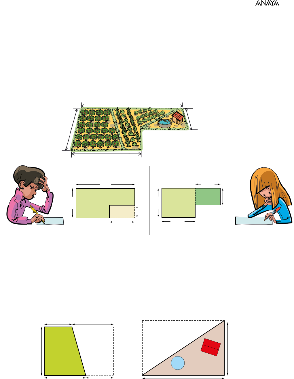 Matemáticas 1 ESO Página 263 Con lo que ya sabes, resuelve • Asier y Jara calculan la superficie de la huerta que tiene su abuela en el pueblo. Pero cada uno lo hace de diferente forma. 70 m 35 m 20 m 40 m 70 · 35 − 30 · 15 = 2 000 m2 40 · 35 + 30 · 20 = 2 000 m2 asier 70 m 30 m 15 m 35 m jara 30 m 40 m 20 m 35 m 1 Explica el método que ha seguido cada uno y di si ambos son correctos. Asier ha calculado el área del rectángulo grande y la del rectángulo que no pertenece a la huer- ta. Después, ha restado la segunda de la primera. Jara ha dividido la huerta en dos rectángulos, ha calculado sus áreas y las ha sumado. Ambos métodos son correctos. 2 Observa y explica cómo han calculado Jara y Asier la superficie de las zonas A y C. 30 m20 m 30 m 20 m 35 m C 30 A 20 SA = (35 · 50) : 2 = 875 m2 SB = (30 · 20) : 2 = 300 m2 Asier ha calculado el área de un trapecio: le ha adosado otro trapecio igual invertido, obte- niendo un rectángulo de dimensiones conocidas. Ha calculado el área del rectángulo y la ha dividido entre dos. Jara ha calculado el área de un triángulo rectángulo: le ha adosado otro triángulo igual, inver- tido, obteniendo un rectángulo de dimensiones conocidas. Ha calculado el área del rectángulo y la ha dividido entre dos. 13 ÁREAS Y PERÍMETROS Matemáticas 1 ESO 3 Por último, calcula el área de la zona B, donde están las hortalizas. SB = Sparcela – SA – SC SB = 2 000 – 300 – 875 = 825 mm2 El área de la zona B es igual al área de la huerta (2 000 m2) menos la del trapecio (875 m2) y menos la de la zona A (300 m2). Área zona B = 2 000 – 875 – 300 = 825 m2 Matemáticas 1 ESO 1 MEDIDAS EN LOS CUADRILÁTEROS Página 265 Para fijar ideas 1 ¿Puede haber paralelogramos que tengan los mismos lados, pero diferente área? Explica tu respuesta. 4 cm 5 c m 7 cm 7 cm 7 cm 1 cm5 c m3 cm5 c m Sí, porque el área también depende de la altura. 2 Teniendo en cuenta que el área del rectángulo rosa es 24 u2, ¿sabrías calcular sin utilizar ninguna fórmula el área de los demás cuadriláteros? Por ejemplo: observa que el trapecio azul ocupa la mitad, es decir, 24 : 2 = 12 u2. A = 6 . 4 = 24 u2 A = 2 6 $4 A = +( ) 2 4$4 4 A = +( ) 2 6$4 4 A = . Después, compara tus resultados con los que obtengas completando las fórmulas. Rombo: Ocupa la mitad de la superficie que el rectángulo inicial, es decir, su área es 12 u2. ( ) 2 6 4$ = 12 u2 Trapecio azul: Ocupa la mitad de la superficie del rectángulo inicial, es decir, su área es 12 u2. ( ) 2 2 4 4$+ = 12 u2 Trapecio amarillo: Si eliminamos la primera fila de cuadraditos del rectángulo inicial, elimi- namos un cuarto de su superficie, por lo que si eliminamos la mitad de dicha fila, estaríamos eliminando un octavo. Por tanto, el área del trapecio amarillo es igual a un octavo de rectán- gulo, es decir, 3 u2. ( ) 2 4 3 6$+ = 21 u2 Trapecio morado: Su área es igual a la del rectángulo inicial, es decir, 24 u2. 6 · 4 = 24 u2 Matemáticas 1 ESO Para practicar 1 Halla el área y el perímetro de las siguientes figuras: a) b) c) d) 24 m 5 m 11 m 13 m13 m 25 m20 m 23 m 13 m 28 m 43 m 37 m 14,4 m 16 m 24 m a) b) c) d) 24 m 5 m 11 m 13 m13 m 25 m20 m 23 m 13 m 28 m 43 m 37 m 14,4 m 16 m 24 m a) Área = 2 24 16· = 192 m2 b) Área = ( ) 2 28 43 20·+ = 710 m2 Perímetro = 4 · 14,4 = 57,6 m Perímetro = 28 + 20 + 43 + 25 = 116 m c) Área = ( ) 2 23 37 11·+ = 330 m2 d) Área = 24 · 5 = 120 m2 Perímetro = 2 · 13 + 23 + 37 = 86 m Perímetro = 4 · 13 = 52 m 2 Calcula el perímetro y el área de un salón rectangular de dimensiones 6,4 m y 3,5 m. Perímetro = 2 · 6,4 + 2 · 3,5 = 19,8 m Área = 6,4 · 3,5 = 22,4 m2 3 ¿Cuánto mide el lado de un cuadrado de 225 cm2 de área? 225 = l 2 → l = 225 = 15 cm El lado del cuadrado mide 15 cm. 4 La diagonal de un cuadrado mide 15 cm. Halla su área. (Recuerda que el cuadrado es tam bién un rombo). Área = 2 15 15· = 112,5 cm2 El área del cuadrado es 112,5 cm2. 5 ¿Verdadero o falso? I II El área del ala-delta (figura I) se puede hallar calculando el área del rombo rojo (figu ra II), restándole el área del rombo verde y dividiendo la diferencia por 2. Verdadero. a) b) c) d) Matemáticas 1 ESO 2 MEDIDAS EN LOS TRIÁNGULOS Página 266 Para fijar ideas 1 Teniendo en cuenta que el área del rectángulo es 6 · 4 = 24 u2, calcula mentalmente, sin utilizar ninguna fórmula, el área de cada triángulo. Triángulo amarillo → 12 u2 Triángulo verde → 12 u2 Triángulo azul → 12 u2 Triángulo naranja → 12 u2 2 Observa estas figuras. Todas tienen 6 unidades de base y 3 de altura. Copia, calcula y completa las áreas de los triángulos. Compáralas con el área del paralelogramo. A = 6 · 3 = 18 u2 A = 2 $4 4 A = 2 $4 4 A = 2 $4 4 Triángulo amarillo → ( )2 6 3$ = 9 u2 Triángulo azul → ( )2 6 3$ = 9 u2 Triángulo naranja → ( )2 6 3$ = 9 u2 Todas las áreas son la mitad del área del paralelogramo inicial. Para practicar 1 Halla el área de estos triángulos: 13 m 20 m a) b) 240 m 50 m 13 m 20 m a) b) 240 m 50 m a) Área = 2 20 13· = 130 m2 b) Área = 2 240 50· = 6 000 m2 a) b) Matemáticas 1 ESO 2 ¿Verdadero o falso? El área de un triángulo es igual al área de un rectángulo con su mis ma altura y la mitad de su base. h b h b/2 Verdadero. 3 El área del triángulo verde es 40 dm2. ¿Cuál es el área del amarillo? ¿Y la del trapecio mo rado? Triángulo amarillo → 40 : 4 = 10 dm2 Trapecio morado → 10 ∙ 3 = 30 dm2 4 Observa el mismo triángulo rectángulo, apoyado sobre un cateto, y apoyado sobre la hi potenusa. Calcula el área y, con ese dato, calcula la altura sobre la hipotenusa. 25 cm 20 cm 15 c m 20 cm h 25 cm 15 cm A = ( )2 15 20· = 150 cm2 150 = ( · )2 25 h → h = 25 300 = 12 cm Matemáticas 1 ESO 3 MEDIDAS EN LOS POLÍGONOS Página 267 Para fijar ideas 1 El lado de un octógono regular mide 12 cm y la apotema, 14,5 cm. Completa y calcula el área. Atriángulo = 2 $4 4 = … Aoctógono = 8 · Atriángulo = 8 · = … 12 cm