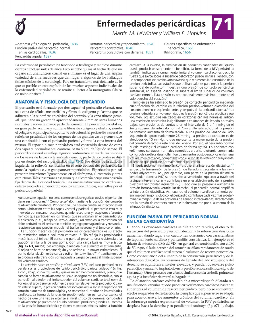 Enfermedades pericárdicas Martin M. LeWintery William E. Hopkins 71 Derrame pericárdico y taponamiento, 1640 Pericarditis constrictiva, 1646 Pericarditis constrictiva con derrame, 1651 Causas específicas de enfermedad pericárdica, 1651 Bibliografía, 1656 Anatomía y fisiología del pericardio, 1636 Función pasiva del pericardio normal en las cardiopatías, 1636 Pericarditis aguda, 1637 La enfermedad pericárdica ha fascinado a fisiólogos y médicos durante cientos e incluso miles de años. Esto se debe quizás al hecho de que un órgano sin una función crucial en sí mismo es el lugar de una amplia variedad de enfermedades que dan lugar a algunos de los hallazgos físicos clásicos de la cardiología. Para un tratamiento más detallado de lo que es posible en este capítulo de los muchos aspectos individuales de la enfermedad pericárdica, se remite al lector a la monografía clásica de Ralph Shabetai.1 A N A T O M ÍA Y F IS IO LO G ÍA DEL PER ICA RD IO El pericardio está formado por dos capas:1 el pericardio visceral, una sola capa de células mesoteliales y fibras de colágeno y elastina que se adhieren a la superficie epicárdica del corazón, y la capa fibrosa parie tal, que tiene un grosor de aproximadamente 2 mm en seres humanos normales y rodea la mayor parte del corazón. El pericardio parietal es, en gran parte, acelular y contiene fibras de colágeno y elastina, siendo el colágeno el principal componente estructural. El pericardio visceral se refleja en proximidad de los orígenes de los grandes vasos y constituye una continuidad con el pericardio parietal y forma la capa interna del mismo. El espacio o saco pericárdico está contenido dentro de estas dos capas y, normalmente, contiene hasta 50 mi de líquido seroso. El pericardio visceral se refleja algunos centímetros antes de las uniones de los vasos de la cava a la aurícula derecha, parte de los cuales se dis ponen dentro del saco pericárdico (fig. 71-1). Por detrás de la aurícula izquierda, la reflexión se localiza en el seno oblicuo del pericardio. La aurícula izquierda es, en gran parte, extrapericárdica. El pericardio parietal presenta inserciones ligamentosas en el diafragma, el esternón y otras estructuras. Tales inserciones aseguran que el corazón ocupe una posición fija dentro de la cavidad torácica. Las únicas estructuras no cardiovas culares asociadas al pericardio son los nervios frénicos, envueltos por el pericardio parietal. Aunque su extirpación no tiene consecuencias negativas obvias, el pericardio tiene sus funciones.1,2 Como se señaló, mantiene la posición del corazón relativamente constante. Proporciona una barrera contra las infecciones así como lubricación entre las capas visceral y parietal. El pericardio está muy inervado por mecanorreceptores, quimiorreceptores y receptores aferentes frénicos que participan en los reflejos que se originan en el pericardio y/o el epicardio (p. ej., reflejo de Bezold-Jarisch), así como en la transmisión del dolor pericárdico. El pericardio también segrega prostaglandinas y sustancias relacionadas que pueden modular el tráfico neuronal y el tono coronario. La función mecánica del pericardio mejor caracterizada es su efecto de restricción sobre el volumen cardíaco.1,2 Ello refleja las propiedades mecánicas del tejido.2 El pericardio parietal presenta una resistencia a la tracción similar a la de una goma. Con una carga baja es muy elástico (fig . e71-1, arriba). Sin embargo, a medida que aumenta el estiramiento, el tejido se hace de repente rígido y se resiste a un mayor estiramiento. El punto de la relación entre carga y estiramiento (v. fig. e71-1, arriba) en que se produce esta transición corresponde a cargas cercanas al límite superior del volumen cardíaco. La relación entre la presión y e l volumen (RPV) del saco pericárdico es paralela a las propiedades del tejido pericárdico parietal aislado1,2 (v. fig. e71-1, abajo, curva izquierda), que es un segmento distensible, plano, que cambia de forma relativamente brusca a un segmento no distensible, con la transición alrededor del límite superior del volumen cardíaco total normal. Por eso, el saco tiene un volumen de reserva relativamente pequeño. Cuan do este se supera, la presión dentro del saco que actúa sobre la superficie del corazón aumenta de forma rápida y se transmite al interior de las cavidades cardíacas. La forma de la relación presión-volumen pericárdica explica el hecho de que una vez se alcanza el nivel crítico de derrame, cantidades relativamente pequeñas de líquido adicional producen grandes aumentos en la presión intrapericárdica y tienen marcados efectos sobre la función cardíaca. A la inversa, la eliminación de pequeñas cantidades de líquido puede producir un sorprendente beneficio. La forma de la RPV pericárdica también indica que normalmente limita el volumen cardíaco; es decir, la fuerza que ejerce sobre la superficie del corazón puede limitar el llenado, con un componente de presión intracavitaria que representa la transmisión de la presión pericárdica. Los estudios que utilizan balones para medir la presión superficial de contacto1,2 muestran una presión de contacto pericárdica sustancial, en especial cuando se supera el límite superior de volumen cardíaco normal. Esta presión es proporcionalmente más importante en el lado derecho del corazón.2 También se ha estimado la presión de contacto pericárdica mediante cuantificación del cambio en la relación presión-volumen diastólica del corazón derecho e izquierdo, antes y después de la pericardiectomía.1,2 La presión reducida a un volumen dado es la presión pericárdica efectiva a ese volumen. Los estudios realizados en corazones caninos normales indican una restricción pericárdica insignificante a volúmenes de llenado normales bajos, con presiones de contacto en el intervalo de 2 a 4 mmHg en el límite superior del intervalo normal. Con un ll