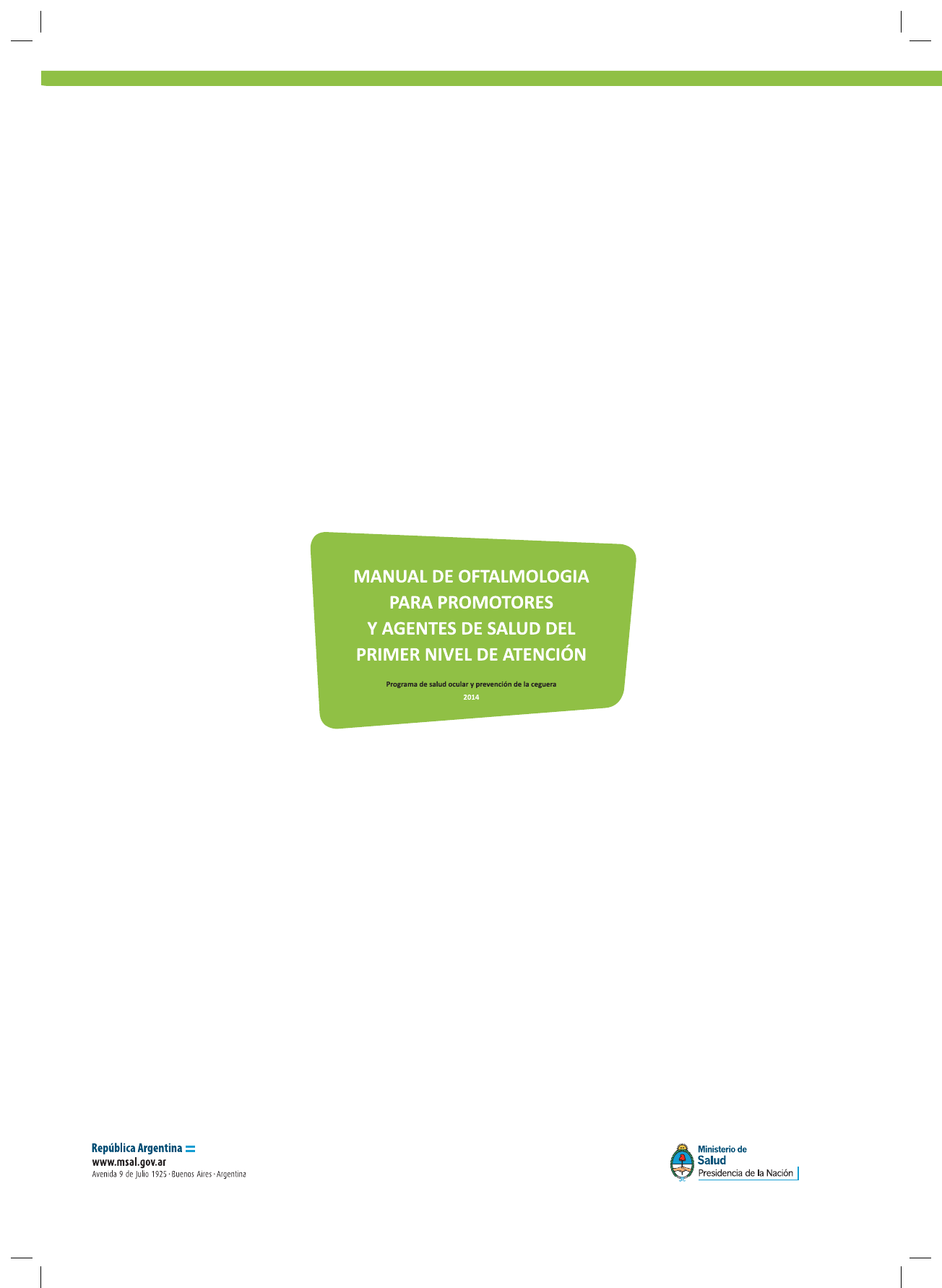 / / / / / / / / / / / / / / / / / / / / / / / / / / / / / / / / / / / / / / / / / / / / / / / / / / / / / / / / / / / / / / / / / / / / / / / / / / / / / / / / / / / / / / / / / / / / / / / / / / / / / / / / / / / / / / / / / / / / / / / / / / / / / / / / / / / / / / / / / / / / / / / / / / / / / / / / / / / / / / / / / / / / / / / / / / / / / / / / / / / / / / / / / / / / / / / / / / / / / / / / / / / / / / / / / / / / / / / / / / / / / / / / / / / / / / / / / / / / / / / / / / / / / / / / / / / / / / / / / / / / / / / / / / / / / / / / / / / / / / / / / / / / / / / / / / / / / / / / / / / / / / / / / / / / / / / / / / / / / / / / / / / / / / / / / / / / / / / / / / / / / / / / / / / / / / / / / / / / / / / / / / / / / / / / / / / / / / / / / / / / / / / / / / / / / / / / / / / / / / / / / / / / / / / / / / / / / / / / / / / / / / / / / / / / / / / / / / / / / / / / / / / / / / / / / / / / / / / / / / / / / / / / / / / / / / / / / / / / / / / / / / / / / / / / / / / / / / / / / / / / / / / / / / / / / / / / / / / / / / / / / / / / / / / / / / / / / / / / / / / / / / / / / / / / / / / / / / / / / / / / / / / / / / / / / / / / / / / / / / / / / / / / / / / / / / / / / / / / / / / / / / / / / / / / / / / / / / / / / / / / / / / / / / / / / / / / / / / / / / / / / / / / / / / / / / / / / / / / / / / / / / / / / / / / / / / / / / / / / / / / / / / / / / / / / / / / / / / / / / / / / / / / / / / / / / / / / / / / / / / / / / / / / / / / / / / / / / / / / / / / / / / / / / / / / / / / / / / / / / / / MANUAL DE OFTALMOLOGIA PARA PROMOTORES Y AGENTES DE SALUD DEL PRIMER NIVEL DE ATENCIÓN Programa de salud ocular y prevención de la ceguera 2014 / / / / / / / / / / / / / / / / / / / / / / / / / / / / / / / / / / / / / / / / / / / / / / / / / / / / / / / / / / / / / / / / / / / / / / / / / / / / / / / / / / / / / / / / / / / / / / / / / / / / / / / / / / / / / / / / / / / / / / / / / / / / / / / / / / / / / / / / / / / / / / / / / / / / / / / / / / / / / / / / / / / / / / / / MANUAL DE OFTALMOLOGIA PARA PROMOTORES Y AGENTES DE SALUD DEL PRIMER NIVEL DE ATENCIÓN Programa de salud ocular y prevención de la ceguera 2014 Manual de oftalmologia para promotores y agentes de salud del primer nivel de atención AUTORIDADES Ministro de Salud de la Nación Dr. Juan Manzur Secretario de Determinantes de la Salud Dr. Eduardo Bustos Villar Programa de Salud Ocular y Prevención de la Ceguera Lic. Rosario Barrenechea Dra. Natalia Bello INDICE CAPITULO I: EL OJO Anatomia del ojo Funcionamiento del ojo CAPITULO II: AGUDEZA VISUAL Agudeza visual Técnica para evaluar agudeza visual Agudeza visual en niños Ambliopìa Estrabismo CAPITULO III: PATOLOGIA OFTALMOLOGICA Vicios de refraccion - Cornea y esclera - Nervio optico - Cristalino - Retina - Macula - Párpados - Enfermedades connatales -Recien nacidos - Conjuntivitis - Queratitis - Hemorragia subconjuntival - Orzuelo/chalazion -Celulitis preseptal - Dacrocistitis aguda - Herpes zoster oftálmico CAPITULO IV: URGENCIAS OFTALMOLOGICAS Ulcera corneal - Quemaduras - Glaucoma agudo CAPITULO V: CUANDO DERIVAR CAPITULO VI: TRIAGE OFTALMOLóGICO 7 • 11 • 15 • V c 29 • 33 • 35 • 5 "Mejor es la salud que nunca se perdió". Séneca La Salud es uno de los componentes de desarrollo de una comunidad, está directamente relacionada con la disponibilidad y distribución de los recur- sos. El promotor de Salud es un dinamizador de hábitos saludables: en- tendemos por actividades de promoción de salud aquellas que se realizan para reforzar hábitos saludables y para prever factores de riesgo. Es un Agente indispensable en el territorio para la prevención de la enfermedad y para favorecer el acceso de la población a la salud. Este manual tiene por objetivo brindar conocimientos sobre patologías visuales para propiciar la prevención, la detección precoz y el oportuno tratamiento. Sosteniendo la importancia de contribuir al conocimiento de los agentes de la salud en este tópico propiciando así un incremento de los RRHH y téc- nicos en las regiones que lo necesiten, a fin de evitar las complicaciones secundarias mediante la capacitación. Se pretende aportar a los saberes de los recursos humanos del territorio a fin de desarrollar tareas de tamizaje y derivación temprana de patologías del campo visual y de instrumentar líneas de promoción de la salud. INTRODUCCIÓN Manual de oftalmologia para promotores y agentes de salud del primer nivel de atención / / / / / / / / / / / / / / / / / / / / / / / / / / / / / / / / / / / / / / / / / / / / / / / / / / / / / / / / / / / / / / / / / / / / / / / / / / / / / / / / / / / / / / / / / / / / / / / / / / / / / / / / / / / / / / / / / / / / / / / / / / / / / / / / / / / / / / / / / / / / Manual de oftalmologia para promotores y agentes de salud del primer nivel de atención / / / / / / / / / / / / / / / / / / / / / / / / / / / / / / / / / / / / 7 ANATOMIA DEL OJO El ojo tiene forma esferoidal y está formado por tres capas concéntricas. 1. Túnica externa: córnea y esclerótica. 2. Túnica media o vascular: úvea, formada por iris, cuerpo ciliar y coroides. 3. Túnica interna: retina. En su interior se limitan unos compartimentos: 1. Cámara anterior, limitada por la cara posterior de la córnea por delante, y el diafragma iridopupilar por detrás. Está ocupada por humor acuoso. 2. Cámara posterior, entre el iris y pupila por delan- te y la cara anterior del cristalino, con sus fibras zonulares. Ocupada por humor acuoso. 3. Cámara vítrea, limitada por la cara posterior del cristalino, fibras posteriores de zónula y parte del cuerpo ciliar por delante y el resto por retina. Está ocupada por el vítreo. Capitulo 1 EL OJO/ / / / / / / / / / / / / / / / / / / / / / / / / / / / / / / / / / / / / / / / / / / / / / / / / / / / / / / / / / / / / / / / / / / / / / / / / / / / / / / / / / / / / / / / / / / / / / / / / / / / / / / / / / / / / / / / / / / / / / / / / / / / / / / / / / / / / / / / / / / / / / / / / / / / 