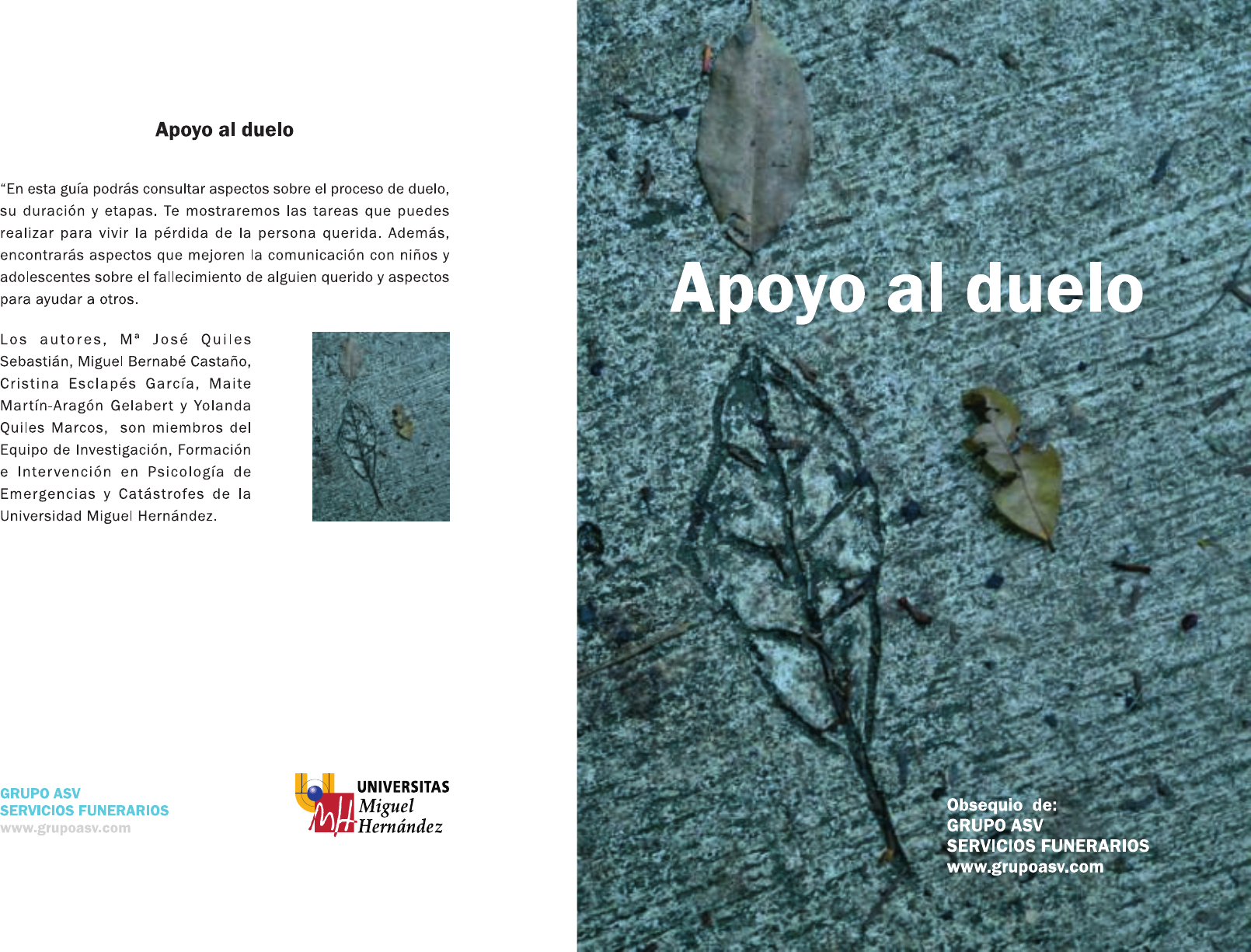 FRANCISCO Máquina de escribir https://www.facebook.com/rojoamanecer2.1/ https://www.facebook.com/rojoamanecer2.1/ Fotos cedidas por: Miguel Ángel Catalá Miralles Reservados todos los derechos. Queda rigurosamente prohibida, sin la autorización escrita de la titular del Copyright, bajo las sanciones establecidas en las leyes, la reproducción parcial o total de esta obra por cualquier medio o procedimiento, incluidos la reprografía y el tratamiento informático, así como la distribución de ejemplares mediante alquiler o préstamo público. © 2007 Mª José Quiles Sebastián, Miguel Bernabé Castaño, Cristina Esclapés García, Maite Martín-Aragón Gelabert y Yolanda Quiles Marcos Editado por: © ASV FUNESER, S.L. Web: WWW.GRUPOASV.COM ISBN: 978-84-612-1614-7 Depósito legal: MA-94-2008 Impreso en los talleres de: AltaGrafics - Telf.: 952 33 00 10 - www.altagrafics.es Puedes llorar porque se ha ido o puedes sonreír porque ha vivido. Puedes cerrar los ojos y rezar para que vuelva o puedes abrirlos y ver todo lo que ha dejado. Tu corazón puede estar vacío porque no lo puedes ver o puede estar lleno del amor que compartisteis. Puedes llorar, cerrar tu mente, sentir el vacío, dar la espalda o puedes hacer lo que a él o ella le gustaría: sonreír, abrir los ojos, amar y seguir. Poema Popular Escocés El duelo es una de las experiencias más dolorosas que atravesamos en nuestra vida. Es un proceso lleno de etapas, momentos y tareas a las que hemos de hacer frente. Con esta guía, elaborada por los miembros del Equipo de Investigación, Formación e Intervención en Psicología de Emergencias y Catástrofes de la Universidad Miguel Hernández para GRUPO ASV, pretendemos ser una fuente de apoyo y de resolución de posibles dudas ante pensamientos, sentimientos y acciones que puedas estar viviendo. Te animamos a leerla a tu ritmo, sin prisas. Apoyo al duelo AUTORES Mª José Quiles Sebastián Miguel Bernabé Castaño Cristina Esclapés García Maite Martín-Aragón Gelabert Yolanda Quiles Marcos Los autores son miembros del Equipo de Investigación, Formación e Intervención en Psicología de Emergencias y Catástrofes de la Universidad Miguel Hernández. ÍNDICE CAPÍTULO 1: DUELO ................................................................................11 1. Introducción. ......................................................................................11 2. ¿Qué es el duelo?..............................................................................11 3. Vivencias de la persona en duelo. ...................................................13 4. Etapas del proceso de duelo. ...........................................................17 5. Duelo complicado. .............................................................................21 CAPÍTULO 2: ¿QUÉ PUEDO HACER YO?..................................................27 1. Introducción .......................................................................................27 2. Las tareas del proceso. .....................................................................27 3. Recuerda ............................................................................................38 CAPÍTULO 3: ¿CÓMO VIVE UN NIÑO EL DUELO?...................................41 1. Introducción........................................................................................41 2. ¿Qué debemos tener en cuenta cuando hablamos con los niños de la pérdida de un ser querido?..............................41 3. ¿Cómo influye la edad del niño en la forma de entender la pérdida de un ser querido? ..........................................................44 4. ¿Cómo comunicar el fallecimiento a un niño?................................47 CAPÍTULO 4: ¿CÓMO PUEDO AYUDAR A LOS DEMÁS? .........................55 1. Introducción. ......................................................................................55 2. ¿Cómo puedo ayudar durante el duelo? .........................................55 3. ¿Qué puedo hacer para ayudar durante el funeral? ......................60 4. Recuerda. ...........................................................................................61 BIBLIOGRAFÍA ..........................................................................................62 QUEREMOS SABER TU OPINIÓN ............................................................63 7 FRANCISCO Máquina de escribir https://www.facebook.com/rojoamanecer2.1/ https://www.facebook.com/rojoamanecer2.1/ CAPÍTULO 1: DUELO 1. Introducción. La muerte de un ser querido es una de las circunstancias más terribles a las que debemos enfrentarnos a lo largo de la vida. A la vez, se trata de una situación por la que irremediablemente hemos de pasar. En ocasiones nos puede parecer que el dolor es insoportable, tanto más en la medida en la que más queremos a la persona fallecida. Sin embargo, conviene recordar que la elaboración de un duelo puede convertirse en una experiencia enriquecedora, que suponga la maduración y el crecimiento personal; no olvidemos que elaborar un duelo es transformar el dolor en amor. 2. ¿Qué es el duelo? El duelo es la reacción psicológica, el dolor emocional que sentimos cuando hemos perdido a alguien importante en nuestras vidas. Por tanto, es un proceso normal por el que pasamos cuando hemos perdido a un ser querido y en el que tenemos que ir adaptándonos a una nueva realidad: la vida sin él o sin ella. La pérdida de un ser querido significa una ruptura inesperada con lo que ha sido nuestra vida hasta ese momento. Todo a partir de ahora se ve de forma diferente y necesitamos un 11 tiempo para adaptarnos. Tras la pérdida, nos vemos inmersos en una crisis emocional que puede servirnos para crecer como personas o para debilitarnos y enfermarnos, dependiendo de cómo la afrontemos. El duelo es un proceso normal cuya evolución, habitualmente, progresa hasta la superación. Podemos decir que hemos completado un du