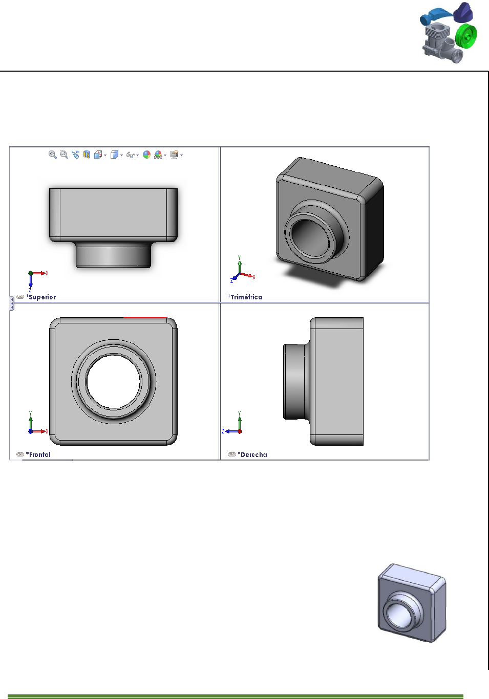 MODELADO 3D CON SolidWorks® Instructor: Mtro. Irving Antonio Huchin Noh Página 18 M O D E L A D O 3 D C O N S o li d W o rk s ® 1.3. Inicio práctico en 40 minutos 1.3.1. Objetivo del tema: • Crear y modificar la siguiente pieza: 1.3.2. Competencias del tema: • Ingeniería: Desarrollar una pieza 3D basándose en un plano, cotas y operaciones seleccionadas. • Tecnología: Aplicar una interfaz de usuario gráfica basada en Windows. 1.3.3. Creación de una pieza en SolidWorks En esta lección, creará su primera pieza de SOLIDWORKS. Realice las siguientes acciones: • Configurar un nuevo documento de pieza. MODELADO 3D CON SolidWorks® Instructor: Mtro. Irving Antonio Huchin Noh Página 19 M O D E L A D O 3 D C O N S o li d W o rk s ® o Cree un nuevo documento y guarde la pieza. Nombre el archivo como: “tutorial1”. 1.3.4. Crear la base Extruya un rectángulo con una esquina en el origen y acotado como se muestra. 1.3.4.1. Croquizar la base A. Haga clic en Extruir saliente/base (en la barra de herramientas Operaciones). Aparecen los planos Alzado, Planta y Vista lateral, y el cursor cambia a . Observe que a medida que mueve el cursor sobre un plano, se resalta su borde. B. Seleccione el plano Alzado. La visualización cambia para que el plano Alzado se oriente hacia usted. Los comandos de la barra de herramientas Croquis aparecen en el Administrador de comandos. Se abre un croquis en el plano Alzado. C. C. Haga clic en Rectángulo de esquina (barra de herramientas Croquis). D. Mueva el cursor al origen del croquis . Cuando el cursor cambia a es porque se encuentra sobre el origen. E. Haga clic en el origen y arrastre el cursor hacia arriba a la derecha. Observe que muestra las cotas actuales del rectángulo. No es necesario que sea exacto con las cotas. F. Libere la herramienta Rectángulo de esquina realizando una de las siguientes operaciones: Haga clic en el botón de la herramienta que está usando. Presione la tecla Esc. Presione la tecla Intro. MODELADO 3D CON SolidWorks® Instructor: Mtro. Irving Antonio Huchin Noh Página 20 M O D E L A D O 3 D C O N S o li d W o rk s ® Haga clic en el botón de la siguiente herramienta que desee utilizar. Haga clic en Seleccionar (barra de herramientas Estándar). 1.3.4.2. Acotar la base A. Haga clic en Seleccionar en la barra de herramientas Estándar. Las etiquetas coloreadas representan Relaciones de croquis. Las etiquetas fueron agregadas por SOLIDWORKS cuando se creó el rectángulo e indican relaciones verticales, horizontales y coincidentes. Puede: Ver una información sobre herramientas al pasar el cursor sobre un rótulo. Modificar o eliminar una relación de croquis al hacer doble clic en un rótulo. Muestre u oculte las relaciones de croquis haciendo clic en Ver > Ocultar/Mostrar > Relaciones de croquis. Los lados del rectángulo que están en contacto con el origen son negros. Como se inició el croquis en el origen, el vértice de estos dos lados coincide automáticamente con el origen, como muestra el símbolo . Esta relación restringe el croquis. B. Arrastre uno de los lados azules o arrastre el vértice para ajustar el tamaño del rectángulo. C. Haga clic en Cota inteligente (barra de herramientas Cotas/Relaciones). D. Seleccione la arista superior del rectángulo. E. Haga clic por encima de la línea para colocar la cota. Aparece el cuadro de diálogo Modificar. F. Establezca el valor en 120. G. Haga clic en . El tamaño del croquis se ajusta para reflejar la cota de 120 mm. H. Haga clic en Zoom ajustar (barra de herramientas Ver) para mostrar el rectángulo completo y centrarlo en la zona de gráficos. I. Repita los pasos 3-8, con una línea vertical, y establezca la altura del rectángulo en 120 mm. Ahora el croquis está completamente definido, como indica la barra de estado en la parte inferior de la ventana de SOLIDWORKS. MODELADO 3D CON SolidWorks® Instructor: Mtro. Irving Antonio Huchin Noh Página 21 M O D E L A D O 3 D C O N S o li d W o rk s ® 1.3.4.3. Extruir la base A. Haga clic en Salir del croquis (barra de herramientas Croquis). El PropertyManager Saliente-Extruir aparece en el panel izquierdo, la vista del croquis cambia a Trimétrica y aparece una vista preliminar de la extrusión en la zona de gráficos. B. En el PropertyManager, en Dirección 1: a. Seleccione Hasta profundidad especificada en Condición final. b. Establezca Profundidad en 30. C. Haga clic en . La nueva operación, Saliente-Extruir1, aparece en el gestor de diseño del FeatureManager y en la zona de gráficos. Presione la tecla Z para aplicar el zoom alejar o Mayús+Z para aplicar el zoom acercar. El croquis fue embebido en la operación de extrusión. Haga clic en al lado de Saliente-Extruir1 en el gestor de diseño del FeatureManager para expandir la operación. El Croquis1, que se utilizó para extruir la operación, aparece en la lista debajo de la operación. Si necesita modificar un croquis después de haber sido embebido, haga clic con el botón derecho del ratón en la operación embebida y seleccione Editar croquis. D. Haga clic en Sombreado con aristas en la barra de herramientas Ver. 1.3.5. Agregar el saliente Extruya un saliente que esté centrado en el modelo y acotado como se muestra. 1.3.5.1. Croquizar y acotar el saliente A. Haga clic en la cara frontal del modelo para preseleccionar el plano de croquis para la siguiente operación. B. Haga clic en Extruir saliente/base (en la barra de herramientas Operaciones). MODELADO 3D CON SolidWorks® Instructor: Mtro. Irving Antonio Huchin Noh Página 22 M O D E L A D O 3 D C O N S o li d W o rk s ® C. Haga clic en Normal a (barra de herramientas Vistas estándar). D. Haga clic en Círculo (barra de herramientas Croquis). E. Haga clic cerca del centro de la cara y desplace el cursor para croquizar un círculo. F. Suelte la herramienta Círculo. G. Haga clic en Cota inteligente (barra de herramientas Cotas/Relaciones). H. Seleccione el circulo. I. Mueva el puntero fuera de