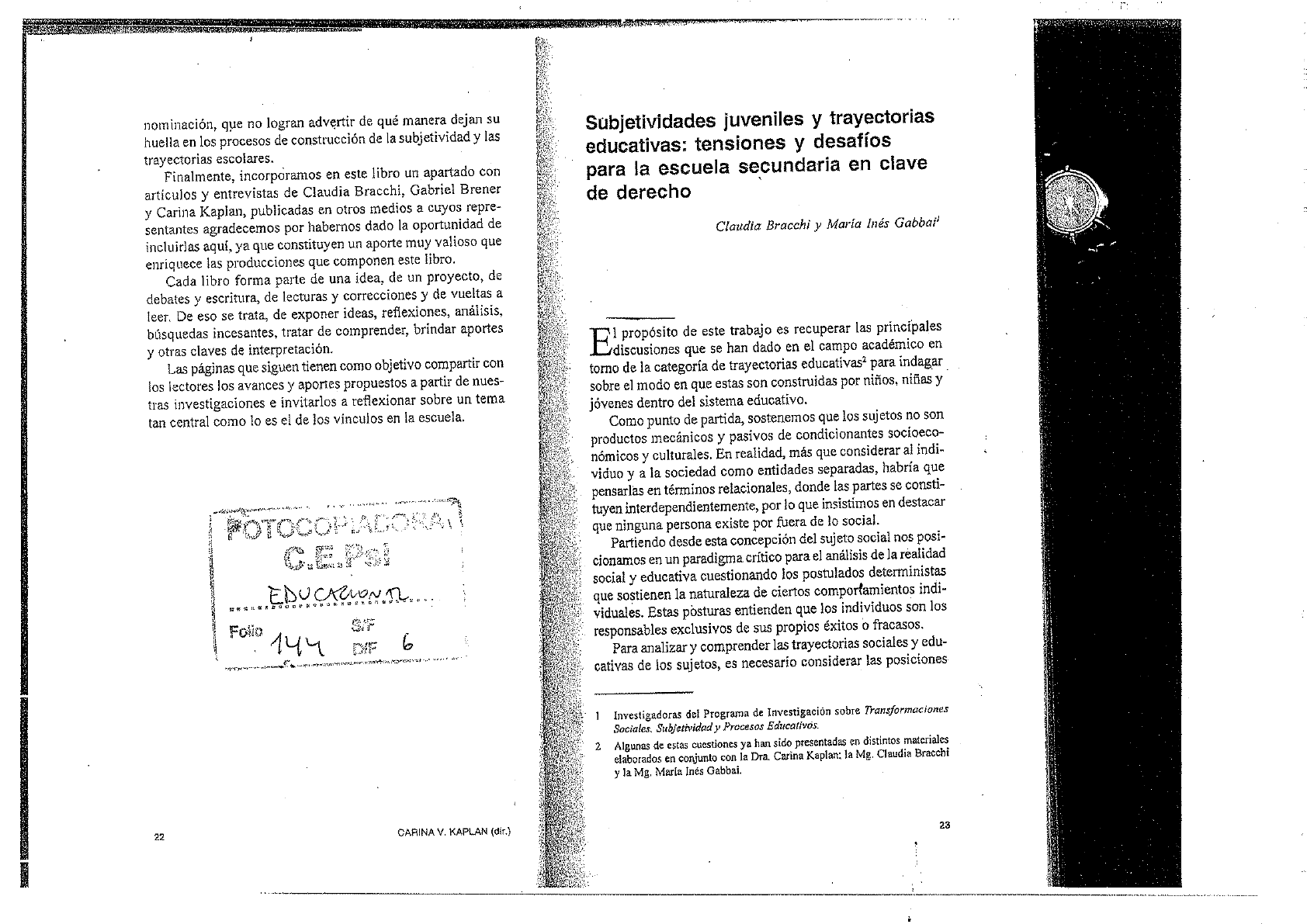 144 BRACCHI y GABBAI Subjetividades juveniles y trayectorias educativas, tensiones y desafíos para la escuela secundaria en clave de derecho
