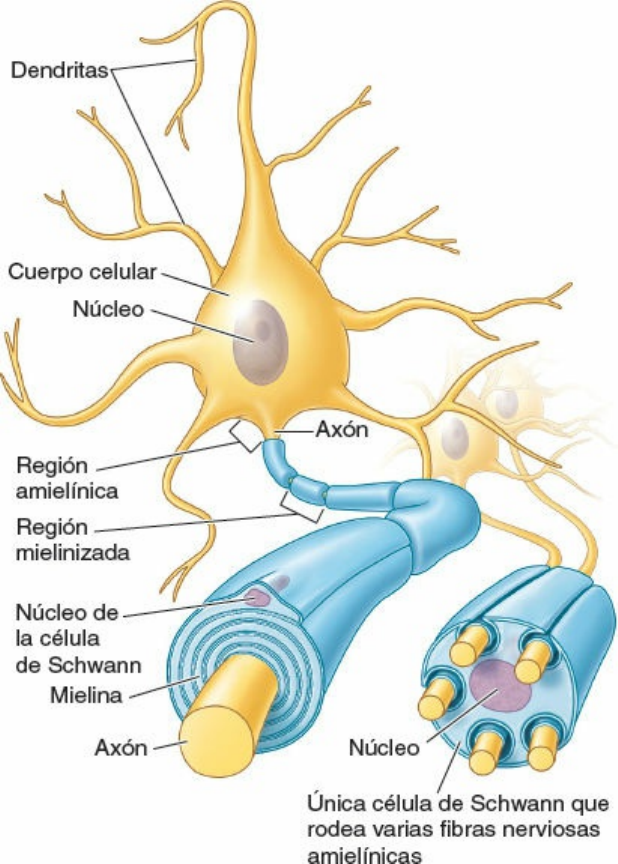 FIGURA 1-32. Fibras nerviosas mielinizadas y amielínicas. Las fibras nerviosas mielinizadas tienen una vaina compuesta por una serie continua de células del neurilema (de Schwann) que rodean el axón y forman una serie de segmentos de mielina. Las múltiples fibras amielínicas están individualmente incluidas dentro de una única célula del neurilema que no produce mielina. Sistema nervioso periférico El sistema nervioso periférico (SNP) se compone de fibras nerviosas y cuerpos celulares, situados fuera del SNC, que conducen los impulsos hacia o desde este (fig. 1-30). El SNP está organizado en nervios que conectan el SNC con las estructuras periféricas. Una fibra nerviosa consta de un axón, su neurilema (del griego neuron, nervio + lemma, cáscara) y el tejido conectivo endoneural circundante (fig. 1-32). El neurilema está formado por la membrana de las células de Schwann, que rodea inmediatamente el axón y lo separa de otros axones. En el SNP, el neurilema puede adoptar dos formas, lo que crea dos clases de fibras nerviosas: 1. El neurilema de las fibras nerviosas mielinizadas consiste en células de Schwann específicas para un determinado axón, organizadas en una serie 148 https://booksmedicos.org https://booksmedicos.org 1 DESCRIPCIÓN GENERAL Y CONCEPTOS BÁSICOS Sistema nervioso Sistema nervioso periférico booksmedicos.org Push Button0:
