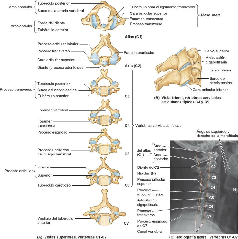 FIGURA 2-5. Vértebras cervicales. A) Las vértebras C1, C2 y C3 son atípicas. B) Las caras superior e inferior de los cuerpos vertebrales cervicales son respectivamente cóncavas y convexas. En combinación con la orientación oblicua de las caras articulares, ello facilita la flexión y la extensión, así como la flexión lateral. C) El arco anterior del atlas está situado por delante de la línea curva continua formada por las caras anteriores de los cuerpos vertebrales C2-C7. Las vértebras C3-C7 son las vértebras cervicales típicas (figs. 2-4 A y 2-5 A; tabla 2-1). Sus forámenes vertebrales son grandes para acomodar el abultamiento (intumescencia) cervical de la médula espinal, por el papel que desempeña esta región en la inervación de los miembros superiores. Los bordes superiores de los cuerpos vertebrales cervicales, alargados transversalmente, están elevados de forma posterior y sobre todo lateral, pero se hallan deprimidos anteriormente, lo que les asemeja a un asiento esculpido. 201 https://booksmedicos.org https://booksmedicos.org booksmedicos.org Push Button0: