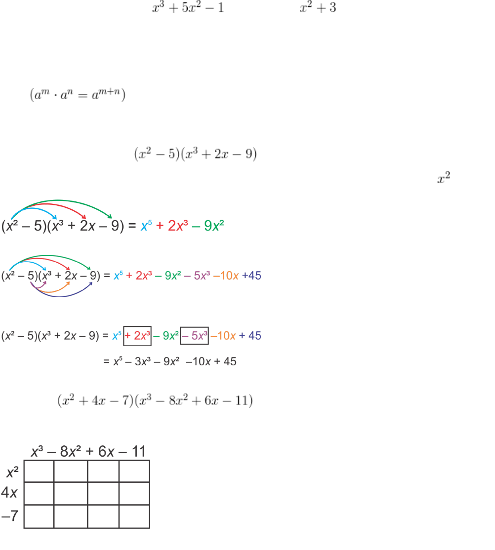 Materia: Matemática de Octavo Tema: Multiplicación de polinomios El largo de un rectángulo es y el ancho es . ¿Cuál es el área del rectángulo? Marco teórico Multiplicar polinomios es muy parecido a multiplicar números. Cuando multipliques polinomios usarás mucho la propiedad de la multiplicación de potencias de igual base . Aplicas la propiedad distributiva y luego combinas los términos semejantes. Ejemplo A Encontrar el producto de . Solución: Utilizando el método tradicional nos queda así. En primer lugar, toma la primero en el polinomio y multiplícala por cada término del segundo polinomio. Ahora, multiplica el -5 por cada término del segundo polinomio Por último, combina los términos semejantes. Ejemplo B Multiplicar . Solución: En este ejemplo, vamos a utilizar el método de la "caja". Alínea los polinomios, uno ponlo en el ancho de la caja y el otro en el alto. Multiplica cada término para rellenar los espacios. Por último, combina los términos semejantes. La respuesta final es: . Este método es una forma alternativa, puedes usar el método con el que te sientas más cómodo. Ejemplo C Encuentra el producto de . Solución: En este ejemplo tenemos tres binomios. Al multiplicar tres polinomios, inicia multiplicando los dos primeros. Una vez que tienes el resultado, multiplícalo por el último binomio. Ahora volvamos al problema dado al principio. Recordemos que el área de un rectángulo es su ancho por su alto. Por lo tanto, debemos multiplicar los polinomios. . Ahora combina los términos semejantes. Asegúrate de escribir tu respuesta en su forma estándar. Por lo tanto, el área del rectángulo es . Ejercicios resueltos Encontrar el producto de los siguientes polinomios. 1. 2. 3. 4. Respuestas 1. Usa la propiedad distributiva para multiplicar por el polinomio. 2. Multiplica cada término del primer polinomio por cada uno del segundo polinomio. 3. Multiplica los dos primeros binomios. Luego multiplica el resultado por el otro binomio. 4. El cuadrado indica que hay dos polinomios, multiplica el polinomio por sí mismo. Ejercicios Encuentra el producto. 1. 2. 3. 4. 5. 6. 7. 8. 9. 10. 11. 12. 13. 14. 15. 16. 17.