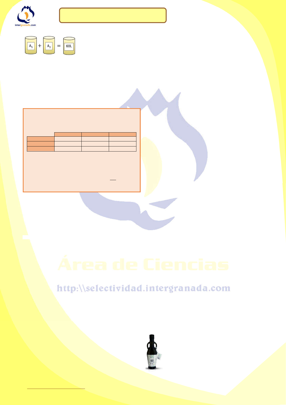 © http://selectividad.intergranada.com 1 Problemas de Mezclas Departamento de Matemáticas http://selectividad.intergranada.com © Raúl González Medina © http://selectividad.intergranada.com Enero 2021 Problemas de Mezclas 01.- Un comerciante tiene dos clases de aceite, la primera de 6 euros el litro y la segunda de 7.2 euros el litro. ¿Cuántos litros de cada clase hay que poner para obtener 60 litros de mezcla a 7 euros el litro? Sol: 10 litros de la primera y 50 litros de la segunda. 02.- Un joyero tiene dos lingotes de oro, con un 80% de pureza y el otro con un 95% de pureza. ¿Cuánto debe fundir de cada uno para obtener un lingote de 5 kilos con un 86% de pureza? Sol: 3 kilos del oro al 80% y 2 del de 95%. 03.- Se han vertido 3 litros de agua, a 15 °C, en una olla que contenía 6 litros de agua a 60 °C. ¿A qué temperatura está ahora el agua de la olla? Sol: 45° 04.- ¿Cuántos kilos de nueces de Castilla que cuestan a 0,80 € el kilo deben mezclarse con 8 kilos de nueces de la India que cuestan 1,25 € el kilo para crear una mezcla que cueste 1,00 € el kilo? Sol: 10 kilos 05.- Juan mezcla 5 kg de chocolate blanco cuyo precio es de 3 euros el kg. Con 7 kg de chocolate negro, de 4 euros el kg. ¿Cuál es el precio de la mezcla resultante? Sol: 3,58 € 06.- Se mezclan 36 kg de trigo, de 0,40 €/kg, con 60 kg de cebada, de 0,24 €/kg. ¿A cuánto sale el kilo de tritordeum? Sol: 0,3 € 07.- Se quiere mezclar vino de 60 € con otro de 35 €, de modo que resulte vino con un precio de 50 € el litro. ¿Cuántos litros de cada clase deben mezclarse para obtener 200 L de dicha mezcla? Sol: 120 litros de 60€/L y 80 litros de 35€/L. 08.- Un fabricante de queso ha mezclado cierta cantidad de leche de vaca, a 0,50 €/l, con otra cantidad de leche de oveja, a 0,80 €/l, obteniendo 300 litros de mezcla a un precio medio de 0,70 €/l. ¿Cuántos litros de cada tipo de leche empleó? Sol: 100 litros de leche de vaca con 200 litros de leche de oveja. 09.- En una bodega se mezclan 6 hl de vino de alta calidad que cuesta a 300 € el hectólitro, con 10 hl de vino de calidad inferior a 220 €/hl. ¿A cómo sale el litro del vino resultante? Sol: 2,5 € 10.- Se ha fundido un lingote de oro de 3 kg de peso y 80% de pureza, junto con otro lingote de 1 kg y 64% de pureza. ¿Cuál es la pureza del lingote resultante? Sol: 76 % 11.- ¿Cuántos litros de leche con un 10% de grasa hemos de mezclar con otra leche que tiene un 4% de grasa para obtener 18 litros con un 6% de grasa? Solución: 6 litros. 12.- Me quiero dan un baño relajante y para ello me dispongo a llenar mi bañera de 180 litros de capacidad. Si vierto 80 litros de agua a 90°C de temperatura, ¿a qué temperatura tiene que estar la otra cantidad de agua para poder darme un baño a 40°C de temperatura? Sol: a 0 grados de temperatura. 13.- Calcula cuántos litros de una disolución de H2SO4 al 80% hay que añadir a 5 litros de una disolución de ese mismo ácido, al 15%, para subir la concentración al 20%. Sol: 0,417 l 14.- Se mezcla una cierta cantidad de café de 34 € el kilo, con 80 kilos de otro café de 50 €/kg, para obtener una mezcla que se pueda vender a 44 € el kilo. ¿Cuánto café de 34 € debe emplearse en la mezcla? Sol: 48 Kg. 15.- Se mezclan 8 litros de aceite de 4€ el litro con otro más barato para obtener 20 litros a 2,5 € el litro. ¿Cuál es el precio del aceite más barato? Sol: 1,50 € el litro 16.- Un tipo de aceite de 3,2 € el litro se obtiene mezclando un 60 % de aceite virgen extra de 4 € litro y el resto con otro más barato. ¿Cuál es el precio de ese otro? Sol: 2 € el litro 17.- ¿Cuántos litros de un líquido que tiene 74% de alcohol se debe mezclar con 5 litros de otro que tiene un 90%, si se desea obtener una mezcla al 84% de alcohol? Sol: 3 litros 18.- Se mezclan 10 sacos de 40 kg de azúcar cada uno, cuyo precio es de 0'8 €/kg, con 100 kg de otra clase de azúcar, de 0'85 €/kg. ¿A cuánto sale el kilo de mezcla? Sol: 0,81 € 19.- En cierta mina de plata hay dos galerías, de la primera se extraen 6 Tm. de mineral con una pureza del 75%, de la segunda se extraen 14 Tm. de una pureza del 65%. Todo en mineral extraído se coloca en una misma pila ¿Cuál es la pureza del mineral de la pila? Sol: 68 % 20.- Se mezclan vinos de 13 € y de 9 € el litro. ¿Qué cantidad del primero hay que añadir a 80 litros del segundo, para que vendiéndolo a 10,50 € se gane el 10%? Sol: Tendremos que tomar 12,63 litros de vino de 13€ el litro. 21.- Se tienen 16 litros de una mezcla con alcohol al 25% contenidos en un recipiente. ¿Cuántos litros de alcohol puro debo agregar a la mezcla inicial para obtener finalmente una mezcla de alcohol al 50%? Sol: 8 litros 22.- Se mezclan 50 kg de carne de 4,2 €/kg con 25 kg de carne de 7 €/kg. ¿A cuánto sale el kilo de mezcla? Sol: 5,13 € 23.- Un vendedor tiene 30 litros de vino cuyo costo es de 10 € el litro. Decide agregarle agua para abaratarlo en 7.50 € y venderlo más rápido. ¿Qué cantidad de agua deberá agregar si desea ganar lo mismo? Sol: 90 litros 24.- Calcula cuántos litros de aceite de orujo de 1,6 €/l tenemos que añadir a un bidón que contiene 60 l de aceite de oliva de 2,8 €/l para obtener una mezcla de 2,5 €/l. Sol: 20 litros 25.- Mezclamos un lingote de 600 g de oro con una pureza del 80 % con otro lingote de 550 g y 95 % de pureza. ¿Qué proporción de oro habrá en el lingote resultante? Sol: 87,17 % 26.- Cierto aceite contiene un 70% de aceite de oliva virgen extra y el resto de aceite de oliva virgen; otro aceite del mismo tipo contiene solo un 10% de aceite de oliva virgen extra. ¿Qué cantidad de aceite de oliva virgen extra se debe agregar al segundo aceite para obtener 90 litros del primer aceite? Sol: 60 litros. Al mezclar 30 kg de pintura con 50 kg de otra de calidad inferior, obtenemos una mezcla que se vende a 3,30 €/kg. Si el precio de la pintura de menor calidad es la mit