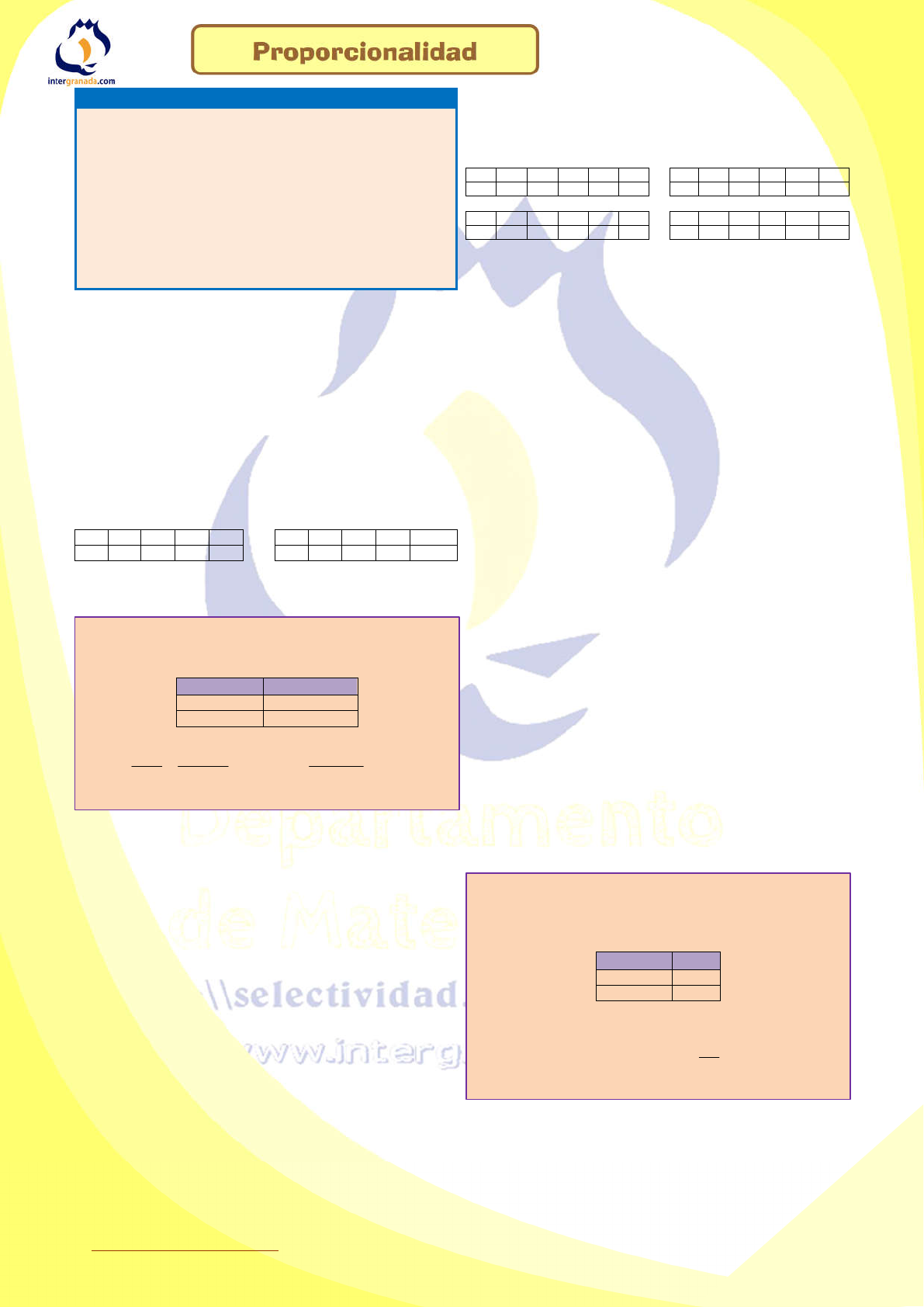 © http://selectividad.intergranada.com Proporcionalidad © http://selectividad.intergranada.com Mayo de 2022 1 Problemas de Proporcionalidad Departamento de Matemáticas www.intergranada.com © Raúl González Medina Algoritmo de resolución de problemas de Proporcionalidad Para resolver problemas de proporcionalidad hemos de: a) Leer y comprender el enunciado del problema. b) Crear una tabla de doble entrada con las magnitudes del problema, poniendo x en la magnitud a calcular. c) Discutir si son magnitudes directa o inversamente proporcionales. d) Escribir la proporción teniendo en cuenta que: 1) Si es Directa, escribimos la proporción con los números tal y como aparecen en la tabla. 2) Si es Inversa, escribimos la proporción con la fracción inversa de una de las dos magnitudes (la que tiene a la x) e) Resolver la proporción y analizar su resultado. 01.- Indica si las siguientes magnitudes son directamente proporcionales. a) Número de horas trabajadas y dinero cobrado. b) Número de horas que un alumno ve la televisión y número de horas de estudio. c) Número de personas que comen y cantidad de alimento. d) El número de hojas de un libro y su peso. e) Número de personas que participan en la compra de un regalo y dinero que aportan. f) La edad de un alumno y su altura. Sol: a) Si; b) No; c) Si; d) Si; e) No; f) No 02.- Completa las siguientes tablas de valores: a) b) 3 6 12 24 48 4 8 12 16 4820 4 8 16 32 64 1 2 3 4 1205 03.- Dos kilos de naranjas cuestan 1,50 €. ¿Cuánto costarán 5 kg? ¿Y 12 kg? Sol: a) 3,75€; b) 9€ 04.- En una obra, dos obreros realizan una zanja de 5 m. Si mantienen el mismo ritmo de trabajo, ¿cuántos metros abrirán si se incorporan 3 obreros más? Sol: 12,5 metros 05.- El precio de 12 fotocopias es de 0,50 €. ¿Cuánto costará hacer 30 fotocopias? Sol: 1,25 € 06.- Un ciclista recorre 75 kilómetros en 2 horas. Si mantiene siempre la misma velocidad, ¿cuántos kilómetros recorrerá en 5 horas? Sol: 187,5 km 07.- Un túnel de lavado limpia 12 coches en una hora (60 minutos). ¿Cuánto tiempo tardará en lavar 25 coches? ¿Y 50 coches? Sol: a) 2 h y 5 min; b) 4 h y 10 min 08.- Diez barras de pan cuestan 4,75 €. ¿Cuánto costarán 18 barras? ¿Y 24 barras? Sol: a) 8,55 €; b) 11,4 € 09.- El precio de 9 billetes de autobús es 10 €. ¿Cuál será el precio de 12 billetes? ¿Y de 15 billetes? Sol: a) 13,33 €; b) 16,67 € 10.- Se está construyendo una autopista y hay que realizar un túnel en la montaña. Está planificado que dos máquinas realicen la obra en 90 días. Para reducir ese tiempo a la tercera parte, ¿cuántas máquinas harían falta? Sol: 6 máquinas 11.- 5 botellas de leche cuestan 3,75 €, ¿cuánto costará una caja de 12 botellas? ¿Y una caja de 36 botellas? Sol: a) 9 €; b) 27 € 12.- Completa las siguientes tablas de valores. a) b) 5 10 20 4 12 60 8 2 6 3 1 6 60 30 15 75 25 5 3 12 4 8 24 4 c) d) 1 2 3 4 6 9 6 3 21 7 42 1 36 18 12 9 6 4 7 14 2 6 1 42 13.- 10 albañiles tardan 45 días en construir un muro. Si se quiere terminar en 15 días, ¿cuántos albañiles harían falta? ¿y si se quiere terminar en 5 días? Sol: a) 30 albañiles; b) 90 Albañiles 14.- Isabel ha comprado al principio de curso 7 cuadernos que le han costado 6,30 euros. ¿Cuánto se gastó María si compró 5 cuadernos? Sol: 4,50 €. 15.- Un depósito de agua se llena en 18 horas con un grifo del que salen 360 litros de agua cada minuto. a) ¿Cuánto tardaría en llenarse el depósito si salieran 270 litros por minuto? b) ¿Y si fueran 648 l/min? Sol: a) 24 horas; b) 10 horas 16.- Sabiendo que dispongo de una determinada cantidad de dinero y que con ella puedo comprar 6 prendas a 4.000 € cada una. ¿Cuántas prendas podría comprar si me costaran 3.000 € cada una? Sol: 8 prendas. 17.- Seis personas efectúan un trabajo en 10 días. ¿Cuánto tardarán en hacerlo ocho personas? Sol: 7,5 días. 18.- Indica si las siguientes magnitudes son o no inversamente proporcionales. a) La velocidad de un coche y el tiempo que tarda en recorrer una distancia. b) El número de limpiadores de un edificio y el tiempo que tardan. c) El número de ladrillos de una pared y su altura. d) El peso de la fruta y el dinero que cuesta. e) La velocidad de un corredor y la distancia que recorre. f) El nº de grifos de un depósito y el tiempo que tarda en llenarse. Sol: a) Si; b) Si; c) No; d) No; e) No; f) Si 19.- Tres niños pintan una valla en 2 horas. Si se incorpora uno más, ¿cuánto tiempo tardarán en pintarla? Sol: Una hora y media 20.- Si 20 obreros levantan un muro de ladrillos en 6 días, ¿cuántos días tardarían 12 obreros? Sol: 10 días 21.- Una merluza de 2 kilos y 300 gramos ha costado 28,75 €. ¿Cuánto pagaré por otra de kilo y medio? Sol: 18,75 € 22.- Un ganadero tiene 20 vacas y dispone de pienso para alimentarlas durante 60 días. Si tuviera 120 vacas ¿para cuántos días tendría pienso? Sol: 10 días. De 5 kilos de olivas se han obtenido 3,2 litros de aceite. ¿Cuántos litros se obtendrán de una tonelada y media de aceitunas? Si representamos los datos en una tabla: Kilos de olivas Litros de aceite 5 kilos 3,2 litros 1.500 kilos x A más kilos de aceitunas, se obtendrá más aceite. Proporcionalidad directa. 5 1500 1500·3, 2 960 3, 2 5 kg kg x l x Se obtendrán 960 litros de aceite. Un tractor, trabajando 8 horas al día, labra un campo en 9 días. ¿Cuántas horas diarias debe trabajar para realizar el trabajo en solo 6 días? Si representamos los datos en una tabla: Horas al día Días 8 horas 9 días x 6 días Para tardar menos días tendrá que trabajar más horas diarias, por tanto, se trata de una proporcionalidad Inversa. 8·9 8·9 ·6 12 6 x x Tendrá que trabajar 12 horas diarias. © http://selectividad.intergranada.com Proporcionalidad © http://selectividad.intergranada.com Mayo de 2022 2 Problemas de Proporcionalidad Departamento de Matemáticas www.intergranada.com © Raúl González Medina 23.- Una máquina emb