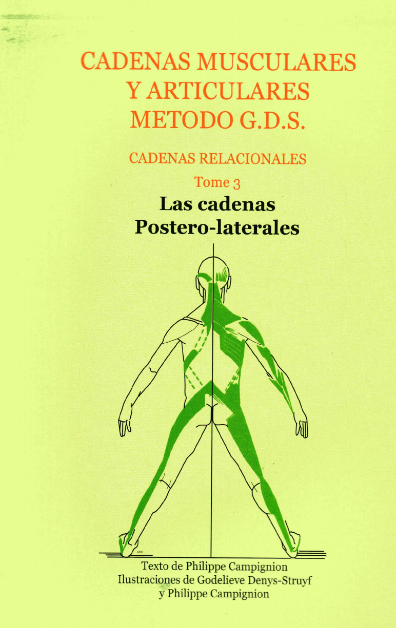 CADENAS MUSCULARES Y ARTICULARES METODO G.D.S. CADENAS RELACIONALES Tome 3 L a s cadenas Postero-laterales Texto de Phil ippe Campignion Ilustraciones de Godelieve Denvs-Strm'f y Philippe Campignion Cadenas m u s c u l a r e s y articulares Método G.D.S. I Fascículo n°3 I Cadenas i postero-laterales \e Campignion \ j © 2 0 0 7 Sumario P r ó l o g o Pr imera parte Consideraciones generales sobre las cadenas postero-laterales I Las cadenas antero-laterales y postero-laterale son cadenas relaciónales Segunda parte Anátomo-fisio-patología de las cadenas postero-laterales Acciones musculares a nivel del pivot primario ; de las cadenas postero-laterales : I la pehis Las cadenas postero-laterales a nivel del cráneo y del cuello Las cadenas postero-laterales a nivel del cuello y de miembro superior Las cadenas postero-laterales a nivel del tronco Las cadenas postero-iaterales a nivel de la pelvis Las cadenas postero-laterales I a nivel de miembros inferiores i Tercera parte Principios de t r a t a m i e n t o Conclusión Bibliografía Prólogo Este segundo t o m o nos va p e r m i t i r conocer el segundo par de cadenas en relación con el comportamiento relacional , es decir la f o r m a de c o m u n i c a r con el m e d i o . La expres ión l igada a las cadenas postero- laterales P L es m u y di ferente a la relacionada con las cadenas antero-laterales A L . Los músculos que const i tuyen cada u n o de los dos encadenamientos lo son también, t a n t o en la a c t i t u d que favorecen como en sus propias fisiologías. A L y P L s o n antagonistas c o m p l e m e n t a r i a s y están m u y l igadas e n t r e s i . H e m o s precisado en el fascículo precedente que ambas se cruzan en diferentes sitios del cuerpo, vamos a ver además que estas cadenas se prolongan una en la otra y se dan mutuamente punto fijo. Aunque sean de alguna manera inseparables, entran frecuentemente e n competición, c o m p a r t e n el t e r r i t o r i o de f o r m a m u y variada y l o i remos describiendo a m e d i d a que avancemos en la m i s m a . La primera que se instala obliga, confrecuencia a la otra, a instalarse en otro sitio. E n otros casos, cada u n a refuerza sus posiciones en su d o m i n i o y la competición t o m a f o r m a de «guerra de tr incheras». Tratándose de cadenas cruzadas, no es r a r o que la asimetría sea la regla, u n a PL izquierda en la pelvis e n t r a n d o en competic ión con u n a A L derecha en el h o m b r o . Los m i e m b r o s infer iores son con frecuencia s i t io de o t r a f o r m a de competic ión entre A L y PL que t e r m i n a p r o d u c i e n d o anomalías de torsión donde veremos que la r o d i l l a es la víctima p r i n c i p a l . Algunas p e r i a r t r i t i s de h o m b r o encuentran también su or igen en este duelo entre A L y PL. Deshacer esta madeja de compensaciones es u n trabajo apasionante. U n amigo canadiense m e d i jo u n día que, gracias al aprendizaje de cadenas,tenía a veces la impresión actuar como el Sherlock H o l m e s del cuerpo.. . Primera parte Consideraciones generales sobre las cadenas postero-latera L a s cadenas antero-laterales y postero-laterales s o n c a d e n a s r e l a c i ó n a l e s Las dos vías relaciónales, u n a de apertura hacia el m e d i o (PL) y la o tra en reserva con respecto al m e d i o ( A L ) h a n sido detalladas en el p r i m e r t o m o concernientes a Is cadenas antero-laterales. E n c o n t r a m o s otra vez aquí los dos bebés cuya a c t i t u d i l u s t r a esta diferencia c o m p o r t a m e n t a l . A L y P L , e s t r u c t u r a s d e l eje h o r i z o n t a l a l s e r v i c i o d e l c o m p o r t o r t a m i e n t o r e l a c i o n a l L a s c a d e n a s p o s t e r o - l a t e r a l e s están a s o c i a d a s a u n a n e c e s i d a d de c o m u n i c a r c o n el medio que lo r o d e a . Los sujetos f u n c i o n a n d o en P L t i e n e n neces idad de i n t e r c a m b i o s . Se m a n i f i e s t a n según u n m o d o de extraversión, p e r o existen diferentes grados de extraversión : esto va desde la persona que se c o n f o r m a instalándose en la terraza de u n café m i r a n d o la gente que pasa s in necesidad de comunicarse con ellas, hasta el que i n v i t a pagando u n a r o n d a a todos para poder i n i c i a r u n a conversación. E n el exceso, puede hacer m u c h o r u i d o para l l a m a r la atención molestanado a las personas que f u n c i o n a n en A L . A L , que t i e n e h o r r o r de las m u l t i t u d e s , pref iere relaciones m á s íntimas e inc luso quedarse en su casa... Así como A L le da m u c h a i m p o r t a n c i a a los detalles y a l análisis PLva al encuentro del medio externo A L atrae hacia si el medio externo para analizarlo F i g . 1 \L tiene u n a visión sintética de las cosas. E n el exceso esto I puede c o n d u c i r l o a t r a t a r muchos temas s in p r o f u n d i z a r n i n g u n o . I Se dispersa en acciones incontroladas y responde a la frase «quien \ abarca poco aprieta». L a percepción d e l m u n d o e x t e r i o r e s también m u y diferente; u n a experiencia hecha p o r investigadores americanos i que consiste en modi f icar la distancia entre ambos ojos con la ayuda \e u n b i n o c u l a r especial lo demuestra: cuando se d i s m i n u y e esta I distancia, como ocurre en los sujetos de tipología A L , el decorado expuesto parece m á s i m p o n e n t e que c u a n d o se a u m e n t a esta distancia, cosa que ocurre en los sujetos con t ipología PL. Es lo i que podría explicar que u n lugar que v is i tamos de nuevo siendo ; adultos, nos parece más p e q u e ñ o que el recuerdo correspondiente ; a nuestra infancia . Con el crec imiento , la distancia entre nuestras \s también aumenta . ; Es decir que para los sujetos que se mani f ies tan según u n m o d o relacional de t i p o PL, las distancias no son i m p o r t a n t e s , e l m i m d o es p e q u e ñ o y l o re