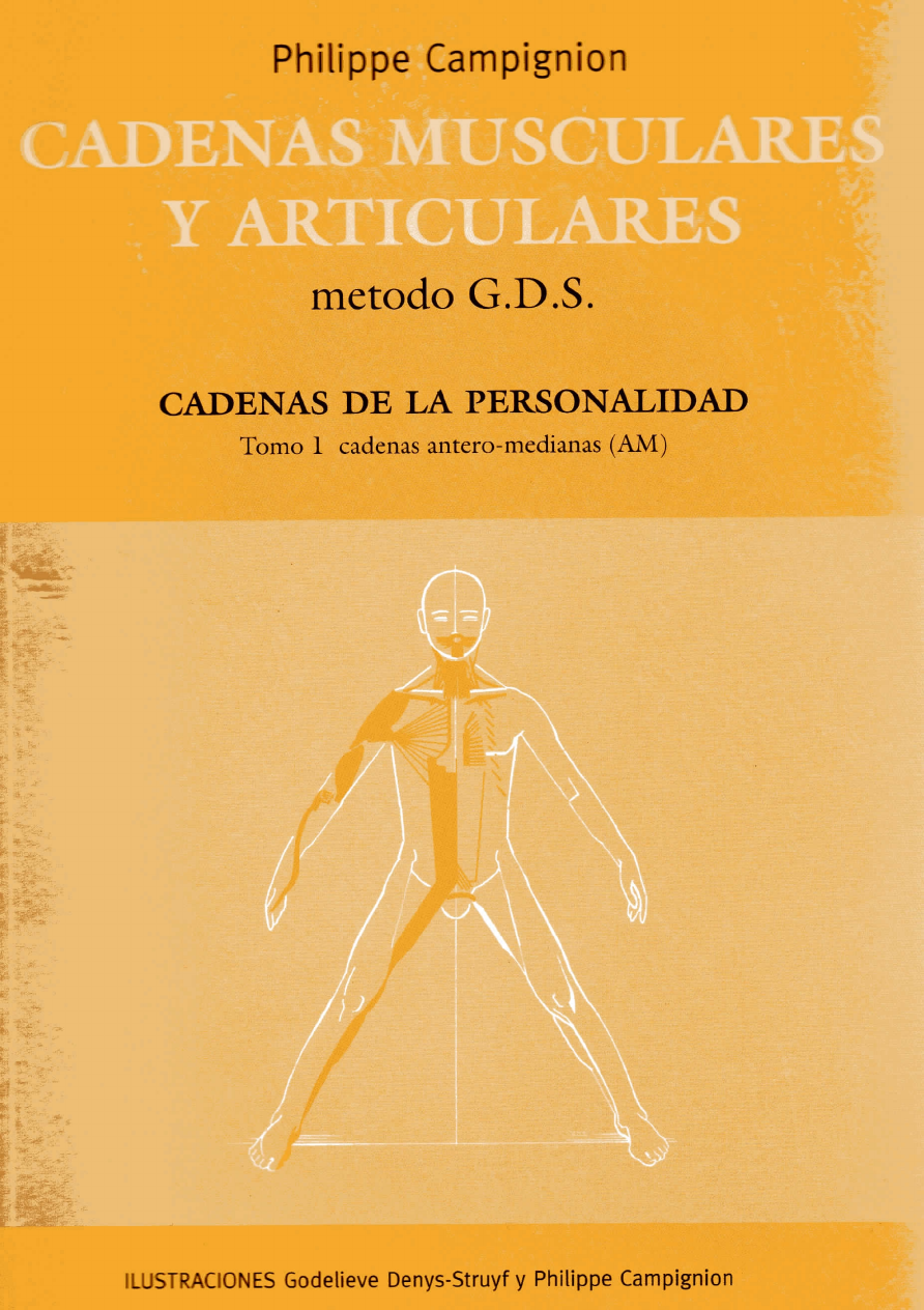 Philippe Campignion iDENAS MUSCULARF Y ARTICUI ARES método G.D.S. CADENAS D E LA PERSONALIDAD Tomo 1 cadenas antero-medianas (AM) ILUSTRACIONES Godelieve Denys-Struyf y Philippe Campignion Prólogo Primera parte Consideraciones generales sobre las cadenas antero-medianas Las cadenas antero-medianas reflejan características de la personalidad Las cadenas antero-medianas deben su nombre a la localización de su trayecto, principalmente en el tronco Detalle de las características mecánicas generales Segunda parte Anatomo-fisio-patlogía de las cadenas antero-medianas Acciones musculares a nivel de la rodilla, pivot primario de las cadenas antero-medianas Las cadenas antero-medianas a nivel de miembros inferiores AM, PL y AL, relaciones a nivel del pie Rol del abductor del hallux de AM en la torsión longitudinal del pie Cuando trabaja en exceso, el abductor del hallux instala un hallux valgus El fascículo medial del gastrocnemio, representa la AM en el plano muscular superficial de la pierna Los músculos aductores, mayor, medio y menor prolongan la AM a nivel del muslo El genu-valgum resulta de una competición entre las cadenas antero-medianas y postero-laterales Las cadenas antero-medianas a nivel de la pelvis : el periné y el piriforme Localización del periné situación del marco óseo que lo dehmita El plano profundo del periné constituye el diafragma pélvico El músculo piriforme completa el periné en su parte posterior y superior a nivel de la escotadura ciática mayor Los músculos del diafragma pélvico y el piriforme influyen en la posición del sacro y del coxix La forma del sacro está condicionada a las tensiones que la AM le impone durante su desarrollo Los músculos piriformes funcionan de forma asimétrica y están fuertemente implicados en la rotación del sacro Los músculos del periné y particularmente los músculos coxígeos intervienen en la rotación del coxis El plano medio del periné está formado por dos músculos La tensión excesiva de los miisculos transversos del periné favorece la sagitalización de las ramas isquiopubianas y el repliegue caudal del hueso coxal A nivel de la pelvis, AM y PL son antagonistas en el plano frontal Comparación de las tipologías pélvicas AM con las tipologías estudiadas en los tomos de las cadenas relaciónales Diferencia entre periné femenino y periné masculino observadas principalmente en el plano superficial Las cadenas antero-medianas a nive del tronco La cadena AM se prolonga a nivel de abdomen con los músculos piramidal y recto mayor del abdomen Los fascículos estemocostales y abdominaes del pectoral mayor completan la acción de los rectos mayores sobre el esternón. El músculo subclavio los secunda en esta tarea Resumen de las modahdades de la acción útil de la AM en su dominio La cifosis torácica excesiva, acompañada de hundimiento esternal, son huellas de un exceso de actividad en las cadenas antero-medianas El exceso de actividad en las cadenas antero-medianas, entorpece la fisiología del músculo diafragma La posición de las piezas vertebrales está modificado, por la actitud global resultante del exceso de tensión en las cadenas AM Las cadenas antero-medianas a nivel del cuello, de la mandíbula y del cráneo La cadena antero-mediana se prolonga a nivel del cuello y de la cabeza, por los fascículos esternales del músculo esternocleidomastoideo, el escaleno anterior, los hioideos, los músculos de la faringe, de la laringe y de la lengua Los músculos hioideos prolongan la cadena antero-mediana a nivel del cuello La AM se caracteriza por su tendencia a enrollar el tronco en cifosis y prolonga su acción hasta la cabeza, flexionándola anteriormente La cifosis dorsal instalada por la AM esa compensada a nivel cefáhco por los músculos esternocleidomastoideos y a nivel cervical, por los escalenos anteriores La faringe es una encrucijada entre las vias aéreas superiores y la digestiva. La faringe prolonga la AM más allá del esófago La laringe está situada en la embocadura de la tráquea El velo del paladar está situado entre la vía utilizada por el aire proveniente de la cavidad nasal hacia la rinofaringe y la vía de pasaje de los alimentos, desde la cavidad bucal hacia la orofaringe La lengua está incluida en la cadena antero-mediana mecánicamente, pero también simbólicamente, pues forma parte del aparato digestivo, por lo tanto con la función de nutrición. La deglución permite dirigir los alimentos que han sido previamente, masticados en la boca, hacia la faringe y de la faringe al esófago El equilibrio entre las cadenas antero-medianas y postero-anteriores a nivel de la cabeza y del cuello, es precario e influye en la fisiología de la articulación temporo-mandibular Los músculos pterigoideos asociados a los músculos de la faringe pueden entorpecer el movimiento respiratorio primario a partir de tensiones que instala en la sínfisis esfeno-basilar La región de la faringe presenta importantes analogías con la región del periné, podemos hablar de diafragma faríngeo Presentamos nuestra visión global relacionando los tres diafragmas : torácico, pélvico y faríngeo Las cadenas antero-medianas pueden invadir la cara, dominio de AP, y marcar la mímica con sus huellas, en la región del mentón y de los labios, particularmente el labio inferior Las cadenas antero-medianas a nivel de miembro superior Aunque predomina a nivel del tronco, como cadena de leje vertical, la AM se prologa a nivel de miembros superiores La posición de miembros superiores y de la cintura escapular es importante para el anclaje de la AM a nivel de la octava vértebra torácica Estudiaremos la torción en miembros superiores comparando con las de miembros inferiores El fascículo anterior del mtisculor deltoides es mixto, de AM y de AL El músculo braquial (braquial anterior) prolonga la AM a nivel del brazo El fascículo profundo del músculo supinador (supinador corto) toma el relevo a nivel de