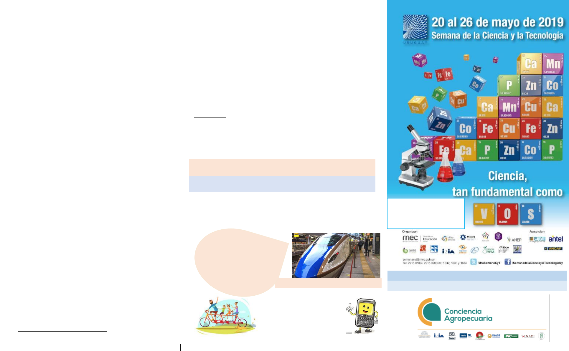 La tabla periódica de los elementos La tabla periódica de los elementos muestra los elementos químicos ordenados por su número atómico (número de protones), configuración de electrones y propiedades químicas. Lectura de la tabla periódica Es una herramienta fundamental para el estudio de la química pues permite conocer las semejanzas entre diferentes elementos y comprender qué puede resultar de las diferentes uniones entre los mismos. Elementos que la conforman La forma en la que se presenta la tabla se llevó a cabo con el fin de facilitar su estudio, la colocación de cada elemento obedece a la siguiente ley periódica: Las propiedades físicas y químicas de los elementos son funciones periódicas de sus números atómicos. Los elementos que la conforman se pueden agrupar en: 1. Periodos: son las líneas horizontales de la tabla, hay siete períodos. 2. Familias o grupos: corresponde a las líneas verticales de la tabla periódica, la tabla actual se compone de 18 familias. Las principales familias suelen ir resaltadas en un color característico. Familia de los alcalinos: litio (Li), sodio (Na), potasio (K), rubidio (Rb), cesio (Cs) y Francio (Fr). Familia de metales alcalinotérreos: berilio (Be), magnesio (Mg), calcio (Ca), estroncio (Sr), bario (Ba), radio (Ra). Familia de gases nobles: helio (He), neón (Ne), argón (Ar), Kriptón (Kr), xenón (Xe), radón (Rn). Fuente: https://www.ciencias.es/tabla-periodica/ Los elementos químicos presentes en la tabla periódica son de suma importancia para ser el humano, ya que permiten al cuerpo funcionar adecuadamente; muchos de ellos se obtienen a través del alimento, incorporándose directamente a nuestro organismo. Algunos ejemplos: Entre los elementos más importantes para el cuerpo están: hierro, calcio, potasio, magnesio, sodio, yodo, y otros más. Hierro (Fe) - Produce la hemoglobina y transporta oxígeno a todo el cuerpo, se encuentra en: higos, vegetales de hoja verde, dátiles, cereales, leguminosas, pepitas, yema de huevo, hígado, carnes, sardinas. Calcio (Ca) - Sirve para la formación y cuidado de huesos y dientes, participa en la coagulación de la sangre, ayuda a las funciones musculares y es necesario para el sistema nervioso. Su falta provoca: debilidad en los músculos, raquitismo, osteoporosis formación de caries, debilidad de las uñas. Está en: hortalizas de hoja verde, berros, perejil, leche, queso, mantequilla, tortillas, sardinas y charales. Potasio (K) - Ayuda al funcionamiento de los riñones y corazón, en la transmisión de impulsos nerviosos, controla el nivel de agua corporal. Su falta provoca: debilidad muscular y mareos. Está en: vegetales de hoja verde, fruta en general, papas. Magnesio (Mg) – Ayuda al funcionamiento de los músculos, conservar sanos los huesos, dientes y articulaciones. Su falta provoca problemas en músculos y nervios, debilidad y convulsiones. Está en: germen de trigo, habas, frijoles, maíz, avena, almendras, azúcar morena, nueces, higos, verduras de hoja verde. Fósforo (P) - Sirve para la formación de huesos y dientes, produce energía para la formación de células. Su falta provoca: debilidad y anorexia. Viene en: cereales, frijoles, lentejas, habas, carnes, pescados, pollo, huevo, yogurt. Sodio (Na) - Sirve para el funcionamiento de los músculos y nervios, regula los líquidos del cuerpo; y contribuye en la digestión. Su falta causa: Deshidratación; mareos y baja de presión. Está en: Cereales, sal de mesa, pan, queso, carnes y pescados ahumados. Fuente: http://ciencia-postnormal. blogspot.com/ Programa ¿Qué se verá en la visita? Presentaciones - stands: Introducción a la tabla periódica de los elementos químicos Hidrógeno y Oxígeno, componentes del agua, vital para la germinación Nitrógeno, uno de los principales nutrientes de los vegetales. Cómo puede ser fijado con ayuda de microorganismos Los metales pesados en suelos inundados: el caso del arsénico Visita al CURE (Centro Universitario Región Este de la Universidad de la República) donde se verá: o Elementos químicos en suelos, o Química de las telas de araña o Juegos interactivos de química Stand invitado: Club de ciencias: “Los carpinteros tecnológicos” Categoría Churrinche. Área tecnológica Título del proyecto: “Shaving made board” (Placa de aglomerado) Escuela técnica N°1. Orientador: Gustavo Medina. Mención especial a nivel nacional 2018. Uno de los ganadores departamentales 2018. Charlas: miércoles 22 10:00 h Elementos químicos naturales y sintéticos. A cargo de docentes del Liceo No. 1 de Treinta y Tres. jueves 23 10:00 h Cianobacterias: organismos milenarios - problemática actual Dra. Carla Kruk, CURE Actividad lúdica: juego con tablas periódicas, similar a la batalla naval. Se juega en parejas, en tablas plastificadas. A cargo de docentes y estudiantes del Liceo No. 1 de Treinta y Tres. ¿O que el tantalio es utilizado en celulares? Organiza: INIA Treinta y Tres Colaboran: INASE, CURE, IPA, UTU, MGAP Derechos de autor de GETTY IMAGES Image caption ¿Sabías que el escandio es usado en aluminio para bicicletas? ¿Sabías que… El niobio es usado en los trenes de levitación magnética, como éste, en Japón …? INIA Treinta y Tres 22 y 23 de mayo 2019 https://www.ciencias.es/tabla-periodica/ INFORMACIÓN GENERAL K. Enevoldsen nació en 1956. Cuando era niño le gustaban las tablas periódicas con figuras, pero nunca había buenas imágenes de todos los elementos Así que Enevoldsen decidió crear lo que hubiera querido tener en la escuela, una tabla periódica con imágenes divertidas y significativas de todos los elementos conocidos hasta el 1998. Él decía que: "Quería que toda la tabla fuera colorida, de un diseño claro, y que no estuviera llena de números, como los pesos atómicos, que no le sirven de mucho a los niños". Enevoldsen en su tabla periódica muestra al me- nos un uso para cada elemento. "Espero que, gracias a ella los niños quier