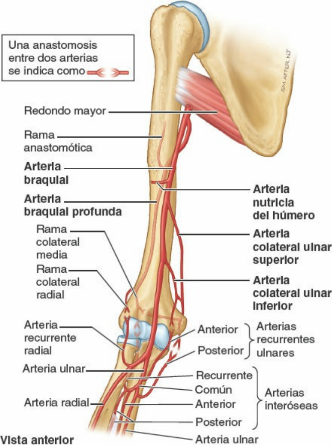 tampoco emite ningún ramo en la axila ni en el brazo, pero también aporta ramos articulares para la articulación del codo. FIGURA 3-51. Irrigación arterial del brazo y el antebrazo proximal. El codo está rodeado por anastomosis arteriales periarticulares, relevantes desde los puntos de vista funcional y clínico. La circulación colateral resultante permite que la sangre llegue al antebrazo cuando la flexión del codo afecta al flujo a través de la porción terminal de la arteria braquial. 419 https://booksmedicos.org https://booksmedicos.org booksmedicos.org Push Button0: