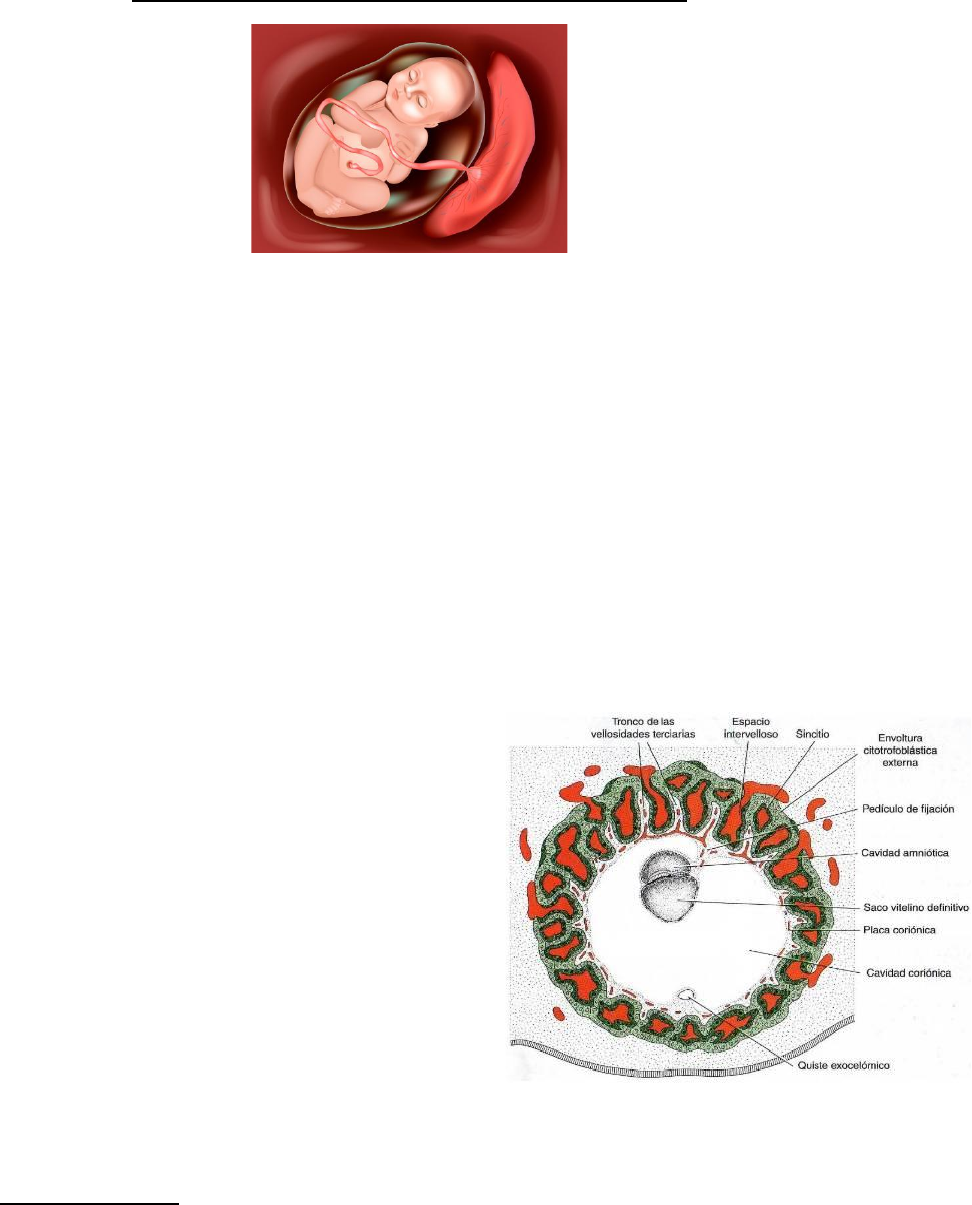 PLACENTA Y CORDÓN UMBILICAL PLACENTA: • Es un órgano temporal, se elimina después del parto • Es el órgano que a través del cordón umbilical comunica al feto con la madre • Durante todo el periodo gestacional realiza para el feto funciones de: o Pulmón o Intestino o Riñón o Glándula endocrina o Regulador inmunológico • Una vez producido el parto es expulsado junto a los anexos (alumbramiento) • Corion frondoso y decidua basal: la fusión del amnios y corion forman la membrana amniocorionica, esta es la membrana que se rompe cuando se inicia el trabajo de parto Estructura de la placenta: • 4to mes: está formada por 2 porciones/caras: o Fetal: ▪ O corion frondoso ▪ Rodeada por la lámina coriónica o Materna: ▪ O decidua basal ▪ Está rodeada por la decidua basal, cuya lamina decidual es la porción que esta íntimamente adosada a la placenta ▪ La decidua forma varios tabiques deciduales, que hacen que la placenta se divida en compartimientos (cotiledones) • Debido al crecimiento continuo del feto y a la expansión del útero, la placenta también crece, cubre el 15 a 30% de la superficie del útero • Placenta a término: o Características: ▪ Forma: Discoide ▪ Diámetro: 15 a 25 cm ▪ Espesor: 3cm ▪ Peso: 400-500 – 600 mg • Placenta a término después del nacimiento: o Lado materno se observa 15 a 20 zonas salientes: COTILEDONES Los surcos que separan a los cotiledones son formados por los tabiques deciduales • Superficie materna de una placenta normal saludable, después del nacimiento: o Lado fetal: está cubierta por la lámina coriónica, se observa VASOS CORIONICOS: ▪ Son arterias y venas de grueso calibre ▪ Que convergen en el cordón umbilical Placenta a término. Después del nacimiento: o El corion está cubierto por el amnios o La inserción del cordón umbilical suele ser excéntrica, a veces marginal Variaciones en la forma de placenta: • Placenta membranácea: si persiste las vellosidades en la totalidad del saco coriónico • Placenta accesoria: (o cotiledón aberrante) por ausencia focal de atrofia de vellosidades coriónicas en el polo vegetativo • Placenta bidiscoide: en embarazos múltiples (hay 2 placentas) • Placenta en herradura • Placenta fenestrada • Placenta succentoriara • Placenta bilobulada • Placenta circunvalada: nace el cordón umbilical en la parte central de la placenta, confluyen todos los vasos al centro • Placenta en raqueta (el nacimiento del cordón esta casi al borde) • Lóbulos separados del cuerpo principal de la placenta Superficie fetal teñido de meconio: • Superficie teñida de verde (meconio) • En productos con sufrimiento fetal Anormalidades placentarias: • Definición: adherencia anormal de las vellosidades coriónicas a una parte o totalidad de la pared uterina, con ausencia parcial o completa de la decidua basal por debajo de la cara fetal de la placenta (1/500) • Tipos: o Placenta acreta: las vellosidades están unidas al miometrio, pero no la invaden (78%) o Placenta increta: las vellosidades coriónicas invaden el miometrio (17%) o Placenta percreta: las vellosidades atraviesan la totalidad del miometrio hasta el perimetrio (5%) • Placenta previa: o La placenta se implanta en la parte baja del útero o Obstruyendo el orificio de abertura cervical (1/200 embarazos) o Puede ser: ▪ Completa ▪ Parcial ▪ Marginal: al borde del orificio ▪ Lateral: placenta está a 2 o 3 cm FUNCIONES DE LA PLACENTA: Es una estructura transitoria • El intercambio de sustancias entre la madre y el feto o al revés: o De madre a feto: pasa O2 por diferencia de presión • La producción de hormonas: o Gonadotropina coriónica o Estrógenos o Progesterona • Intercambio de gases: por difusión o Oxigeno o Dióxido de carbono o Monóxido de carbono Anticuerpos de la madre son captados por pinocitosis por el sincitiotrofoblasto y transportados después hacia los capilares fetales • Hacia el final del 4to mes de gestación la placenta produce: o Progesterona o Hormonas estrogénicas • Durante los 2 primeros meses el sincitiotrofoblasto produce: o Gonadotropina coriónica humana (HCG): ▪ Mantiene el cuerpo lúteo ▪ Es excretada por la madre en la orina y en los primeros momentos de la gestación ▪ Su presencia se usa como indicador de embarazo ▪ Posible que se produzca habituación en el feto por el con- sumo materno de drogas como la heroína y cocaína, que produce: • Sufrimiento fetal crónico • Retardo de crecimiento • Produce otra hormona: SOMATOMAMOTRO- FINA (antes lactógeno placentario): o Es semejante a la hormona del crecimiento que confiere al feto prioridad sobre la glucosa sanguínea materna • MOLA TILIFORME: aumentan mucho en cantidad que un embarazo CORDON UMBILICAL: • Características: o Aspecto: blando nacarado o o Vasos: 2 arterias 1 vena o Envuelta en Gelatina de wharton: tejido conectivo especializado o Inserción: superficie fetal de la placenta o Longitud: 50-60cm o Diámetro: 1 a 2cm o Estructura helicoidal: con 5 a 10 vueltas, se debe a la mayor longitud de las arterias umbilicales en relación con la vena umbilical o Óbitos espontáneos por alteración en el flujo • Estructura o 1 vena umbilical: lleva sangre arterial o 2 arterias: sangre venosa. Arteria umbilical única (anomalía más frecuente) o Un conducto: restos de saco vitelino o alantoides o Formado por tejido fibroblástico de revestimiento de los vasos sanguíneos: ▪ Vena lamina elástica interna ▪ Arterias con válvulas de hoboken o Envuelta por Gelatina de wharton: sustancia coloide gelatinosa o Epitelio amniótico: revestimiento pavi- mentado • Problemas probables del cordón: o Longitud >100 cm: ▪ Nudos verdaderos, circular de cordón ▪ Prolapso (importante en pre- sensación distócica, podálica) ▪ Los nudos falsos del cordón los producen las salientes de vasos umbilicales o Longitud < 30-35cm: ▪ Desprendimiento prematuro de placenta (nos pued