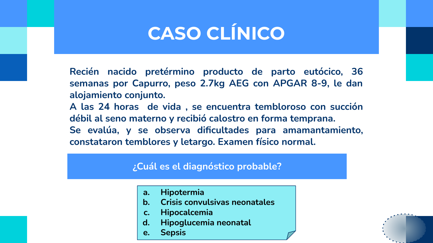 ¿Cuál es el diagnóstico probable? Recién nacido pretérmino producto de parto eutócico, 36 semanas por Capurro, peso 2.7kg AEG con APGAR 8-9, le dan alojamiento conjunto. A las 24 horas de vida , se encuentra tembloroso con succión débil al seno materno y recibió calostro en forma temprana. Se evalúa, y se observa dificultades para amamantamiento, constataron temblores y letargo. Examen físico normal. CASO CLÍNICO a. Hipotermia b. Crisis convulsivas neonatales c. Hipocalcemia d. Hipoglucemia neonatal e. Sepsis HMMS