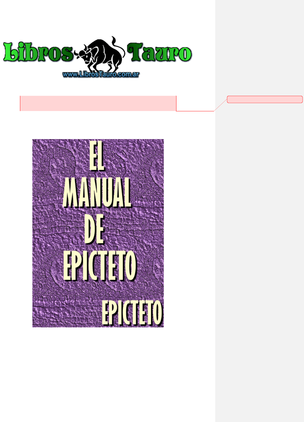 EEll MMaannuuaall DDee EEppiicctteettoo Epicteto Comentario [LT1]: El manual de Epicteto Epicteto ÍNDICE PRÓLOGO 1. DEPENDER 2. DESEAR 3. VERDAD 4. HERENCIA 5. OPINAR 6. BIENES 7. DESEAR 8. DESEAR 9. LIBERTAD 10. VIRTUD 11. PERDER 12. RENUNCIAR 13. CRITICAR 14. LIBERTAD, DEPENDER 15. EL BANQUETE 16. COMPARTIR 17. ROL 18. PRESAGIAR 19. ENVIDIAR, DESPRECIAR 20. ULTRAJAR 21. MORIR 22. FILOSOFAR 23. A-PARE-SER 24. DEPENDER DE TI 25. COMPRAR Y VENDER 26. DESEAR 27. EL MAL NO EXISTE 28. PENSAMIENTO POSITIVO 29. DELIBERAR 30. LUGAR 31. PIEDAD 32. ADIVINAR 33. SABER HACER 34. IMAGINAR 35. EL SABER DEL OTRO 36. OPERACIONES LÓGICAS 37. LUGAR 38. CEDER 39. POSEER 40. MUJERES 41. EL CUERPO 42. AGRAVIAR 43. LAS ASAS DEL SENTIDO 44. ABSURDO 45. INTERPRETAR 46. NOMBRAR Página 2 de 20 El manual de Epicteto Epicteto 47. OSTENTAR 48. DIFERENCIA 49. PRACTICAR 50. SIN PRISA PERO SIN PAUSA 51. PRACTICAR 52. FILOSOFÍA 53. SENTENCIAS SOBRE EPICTETO PRÓLOGO Epicteto, filósofo de la estoa, nació en el año 50 d.C. en Hierápolis, ciudad de Roma, liberto del liberto Epafrodito, secretario éste de Nerón; tiene por lema, “Abstente de pasiones, afectos y opiniones”. Supera su defecto físico (cojera por reuma) como superándose a sí mismo, tal que a los 43 años comienza su vida pública como filósofo en la Nicópolis, fundando una escuela para la que trabaja durante más de 40 años. El estoicismo, fundado por Zenon de Elea, era un movimiento del pensamiento que se oponía a la tiranía de Calígulas y Nerones. Razón por la que los estoicos (tanto ciudadanos o estoicos como esclavos o cínicos) fueron expulsados de Roma, hacia el año 71. Por otra parte, Saulo de Tarso, luego llamado Pablo, era estoico, y después de Yeshua, los llamados cristianos mantenían elementos de la estoa en su doctrina. Tal que no se sabe si ésta nace de estos o estos la adoptan como filosofía, hecho que, además, revela un factor explicatorio de la animadversión romana contra Yeshua y los judíos de ese entonces. Arriano, uno de los discípulos de Epicteto, quien hubiese tomado notas para sí, de las palabras del maestro, publica, cuando ya probablemente el maestro había muerto, EL ENQUIRIDON, o MANUAL DE LA ESTOA. El autor, nos lleva, fundamentalmente, por la aplicación lógica de las estoas, derivadas de: “Algunas cosas de las que existen en el mundo, dependen de nosotros, otras no”. “De nosotros dependen nuestras acciones (opiniones, inclinaciones, deseos y aversiones), de nosotros no dependen lo que no es nuestra propia acción (cuerpo, bienes, reputación, honra)”. “Las cosas que dependen de nosotros son por naturaleza libres, nada puede detenerlas, ni obstaculizarlas, las que no dependen de nosotros son débiles, esclavas, dependientes, sujetas a mil obstáculos y a mil inconvenientes, y enteramente ajenas” Manteniendo el principio según el cual sólo nos compete lo que depende de nosotros, por lo tanto, no solamente somos libres, por naturaleza, sino que nada que no sea de nuestro deseo, nos atañe, es decir, nada nos mueve del lugar elegido para vivir en tanto estemos sujetos a este deseo. La libertad no existe sino en el sentido de “liberarse de sus propias tonterías”, es decir de todo lo que no depende de nosotros. Hay, no obstante, otro camino a elegir: el de las riquezas, honores, y competiciones; el de ser reconocido y amado por otros. En tal caso, ha de atenerse uno a las consecuencias de su elección, consecuencia no otra, que la de la humillación y el caos. La elección del camino del reconocimiento propio del deseo, lleva consigo la libertad. La elección del camino del deseo de reconocimiento, lleva consigo, si bien, riquezas y honores. Éstos son sólo oropel, con el que se tapa el caos y el sufrimiento. Ninguno de los dos caminos es fácil. El autor, lleva prudente y bellamente al camino del reconocimiento del deseo y al mantenerse allí, en ese lugar, poniendo ejemplos, haciendo Página 3 de 20 El manual de Epicteto Epicteto llamado a lo que otros autores, como Sócrates por ejemplo, han dicho, y realizando elaboraciones propias a partir de aquellas. El camino por el que invita, no se logra, sin el conocerse a sí mismo, se diría, es un constante saber sobre sí mismo, que conlleva a un saber sobre los otros. En fin, hay que leer el texto, dejarse atravesar por la enseñanza, y sacar conclusiones propias. A esto es a lo que el lector queda convocado. 1. DEPENDER En cuanto a todas las cosas que existen en el mundo, unas dependen de nosotros, otras no dependen de nosotros. De nosotros dependen; nuestras opiniones, nuestros movimientos, nuestros deseos, nuestras inclinaciones, nuestras aversiones; en una palabra, todas nuestras acciones. Las cosas que no dependen de nosotros son: el cuerpo, los bienes, la reputación, la honra; en una palabra, todo lo que no es nuestra propia acción. Las cosas que dependen de nosotros son por naturaleza libres, nada puede detenerlas, ni obstaculizarlas; las que no dependen de nosotros son débiles, esclavas, dependientes, sujetas a mil obstáculos y a mil inconvenientes, y enteramente ajenas. Recuerda pues que, si tu crees libres, a las cosas por naturaleza esclavas, y propias, a las que dependen de otro; encontrarás obstáculos a cada paso, estarás afligido, alterado, e increparas a Dios y a los Hombres. En cambio si tu tienes, a lo que te pertenece, como propio y, a lo ajeno como de otro; nunca, nadie, te forzará a hacer lo que no quieres ni te impedirá hacer lo que quieres. No increparás a nadie, ni acusarás a persona alguna; no harás ni la más pequeña cosa, que no desees; nadie, entonces, te hará mal alguno, y no tendrás enemigos, pues nada aceptarás que te sea perjudicial. Aspirando entonces a tan grandes bienes, recuerda que tu no debes trabajar mediocremente para lograrlos, y que, en lo que concierne a las cosas exteriores, debes enteramente renunciar a algunas y diferir otras. Pues si buscas armonizarlas, y ambicionas estos 