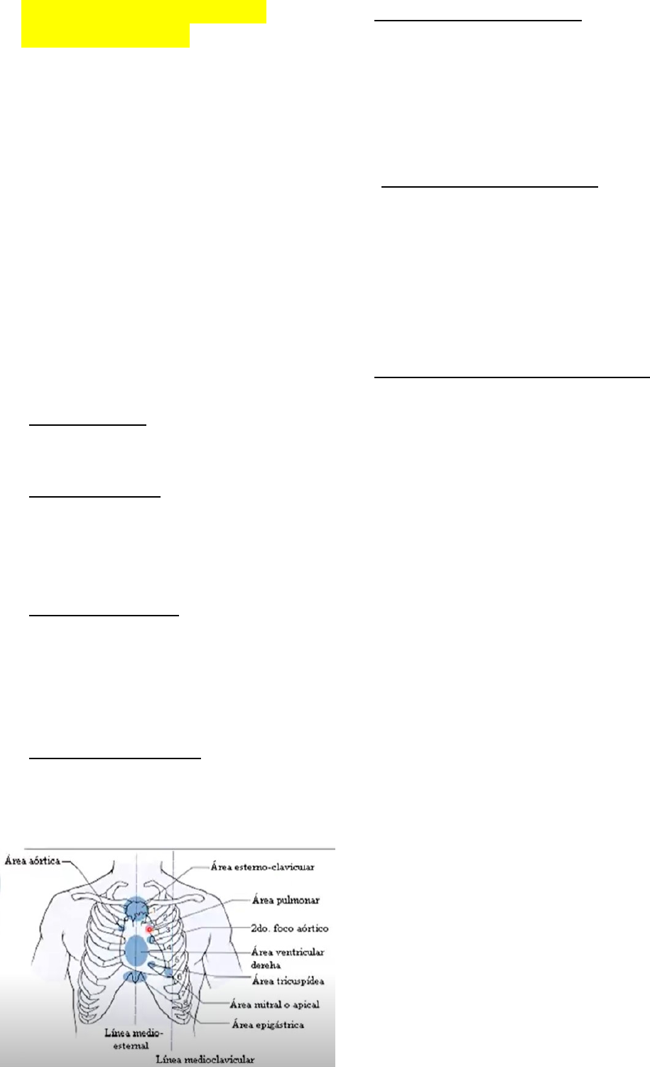 EXAMEN FISICO APARATO CARDIOVASCULAR Orientaciones generales -dejar descubierta la region que vamos a explorar, preferentemente desde el ombligo hacia arriba. -el explorador debe colocarse a la derecha del examinado -el examen debe realizarse com la persona acostada, o mejor reclinado en la camilla o em la cama -la exploracion se hara por los cuatro procedimientos clasicos que ya conocemos: la inspeccion, la palpacion, la percusion y la auscultación Areas o focos precordiales -El foco aortico, localizado em el segundo espacio intercostal derecho, exactamente al lado del borde derecho del esternon -El foco pulmonar, localizado exactamente al lado del borde izquierdo del esternon, en el segundo espacio intercostal izquierdo, representa la valvula pulmonar -El foco tricuspídeo, localizado em un area de aproximadamente 3 a 4 cm, a la izquierda del esternon em su parte inferior, a la altura de la quinta articulacion condrococostal izquierda, representa la valvula tricuspidea -El foco mitral o apical, situado en el 5to. Espacio intercostal izquierdo, en la linea medio clavicular, representa una valvula y una cámara cardíaca -El area esternoclavicular, descansa sobre el esternon y su union con ambas costillas, asi como parte de los 1ros. Espacios intercostales izquierdo y derecho. Estas estructuras pueden servir de líneas de demarcacion para evaluar el arco aortico y la arteria pulmonar -El area ventricular derecha, sobre el ventriculo derecho que enfrenta el torax anterior, se extiende desde el 3er. Espacio intercostal hasta el extremo distal del esternon. El borde lateral derecho del area se encuentra sobre la auricula derecha. El ventriculo izquierdo esta sobre su borde lateral izquierdo -El foco de Erb o 2do. foco aortico, en el 3er. Espacio intercostal izquierdo se incluye en el area ventricular derecha. Es considerado por la mayoria como el 5to. Foco principal de auscutacion precordial. INSPECCION observe todos los fenomenos visibles: .coloracion de la piel .arquitectura de la region .configuracion externa mediante la inspeccion estatica y dinamica (latidos positivos en el sentido de levantaamiento, o negativos en el sentido de depresion) en la region precordial, epigastrica y cervical. Inspeccion dinamica Permite apreciar el choque de la punta (levantamiento que experimenta la region apexiana, por el empuje hacia delante de la punta del ventriculo izquierdo durante el comienza de la sistole cardiaca) La inspeccion del choque de la punta permite fijar: -situacion o localizacion -forma -intensidad -extension -frecuencia y ritmo Situacion Adulto: V espacio intercostal izquierdo Niño: IV espacio intercostal izquierdo Anciano: VI espacio intercostal izquierdo -sobre la linea medioclavicular (LMC) (foco mitral) o un poco más adentro, limitandose a cubrir una extension reducida, que abarca aproximadamente la yema de un dedo, y que no debe ser mayor de 2 -3cm de diametro. Variaciones en estado fisiologico -en los picnicos, en los obesos y en las embarazadas, el latido de la punta asciende y puede observarse por encima del 5to. Espacio intercostal y algo hacia fuera -en los longilineos y en los delgados, se situa mas abajo y adentro -en decubito lateral izquierdo (posicion de Pachon), la punta se desvia de 2 a 5cm hacia la region axilar -las alteraciones fisiologicas del choque de la punta se observan mejor en el individuo sentado. Forma, intensidad y extension La intensidad del choque de la punta depende: -del grossor de la pared -del tamano del corazon -y de la fuerza de su contracción Frecuencia y ritmo -observar la frecuencia del choque de la punta y si este es ritmico o no, ya es un adelanto para precisas estos aspectos con mayor o menor profundidad, durante la auscutacion. Otros latidos ajunos al choque de la punta: -latido epigastrico: se observa en condiciones normales en individuos delgados. -despues de la sistole ventricular se produce la proyeccion hacia delante de la region epigastrica -otras veces, el latido epigastrico consiste en una retraccion sistolica de esa region, latido negativo, motivada por la transmision del latido cardiaco, lo que puede suceder en el terreno fisiologico -sin embargo, tal hallazgo puede ser anormal (ventriculo derecho hipertrofiado) Palpacion Palpe toda el area precordial con la palma de la mano: -la punta -la region xifoidea y sus cercanias -la base, a ambos lados del esternon La palpacion debe realizarse en distintas posiciones: -decubito supino -sentado -decubito lateral izquierdo -sentado con ligera inclinacion hacia la izquierda -decubito ventral La palma de la mano es mas sensible a la vibracion. La punta de los dedos es mas sensible a la vibracion. La punta de los dedos es mas sensible a las pulsaciones, como el choque de la punta. Elementos obtenidos con la palpacion -movimientos pulsatiles. (choque de la punta y otros) -vibraciones valvulares palpables. (choques valvulares) -estremecimiento catario. (fremito o thrill) -ritmo de galope diastolico -roces pericardicos palpables (fremito pericardico) Choque de la punta En los niños y en los jovenes es frecuente percibir el latido cardiaco en decubito supino; en tanto que en adultos de mas de 30 anos, lo comun es no escontrar ningun latido palpable en decubito dorsal -palparlo en esa posicion cuando el sujeto tiene mas de 30 anos, debe hacer sospechar alguna alteracion cardiaca -su comprobacion es constante en decubito lateral izquierdo Estremecimiento catario (fremito o thrill) -es una sensacion percebida por la mano que palpa, comparable a la sensacion que se obtiene al palpar a contrapelo en dorso de un gato que ronronea -en sujetos con eretismo cardiaco (jovenes, simpaticotonicos, hipertiroideos, etc) y pared toracica delgada, puede percibirse una sensacion vibratoria parecida al thrill, durante la sistole, a la que se denomina tremor cordis. El tremor carece de significacion patologica Los estremecimientos catarios pueden ocurrir durante: -la sistole: thrill sistolico -en plena diastole: 