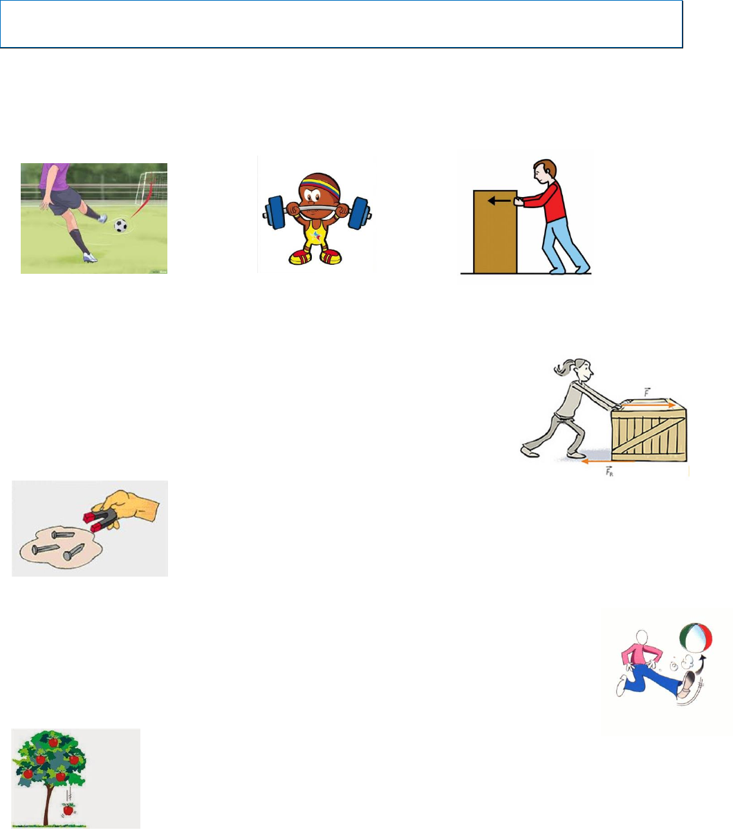 1 2º ESO Física y Química UD 9 TEMA 9. LAS FUERZAS Y SUS EFECTOS 1.- LAS FUERZAS Fuerza: es el agente físico capaz de deforma un cuerpo o de modificar su estado de reposo o de movimiento. Para que exista una fuerza, es necesario que haya dos cuerpos que entren en contacto: - Por ejemplo: cuando empujamos algo, cuando le damos una patada a un balón, levantamos unas pesas. 1.1 TIPOS DE FUERZAS Acabamos de decir que para exista una fuerza debe haber interacción entre los cuerpos. Según el tipo de interacción, las fuerzas pueden ser: - De contacto: cuando no existe separación entre los cuerpos que interaccionan (damos una patada a un balón o empujamos una caja). - A distancia: cuando se ejercen sin necesidad de contacto; existe separación entre los cuerpos que interaccionan (cuando un objeto cae desde una cierta altura, un imán que atrae un clavo). Las fuerzas también se pueden clasificar según su duración: - Instantáneas: cuando actúan durante un intervalo de tiempo muy corto (damos una patada a un balón). - Constantes o permanentes: cuando se ejercen de forma continua (atracción de un objeto por la Tierra) 2 2º ESO Física y Química UD 9 1.2 EFECTOS DE LAS FUERZAS Los resultados de la acción de una fuerza pueden ser: - Cambio de forma: cuando el objeto sobre el que actúa una fuerza adopta forma diferente a la inicial (aplastamos una esponja, o plastilina). Las fuerzas actúan como agentes deformadores. - Cambio de velocidad: cuando al actuar una fuerza sobre un cuerpo aparece una aceleración que ocasiona un cambio de velocidad (aceleramos o frenamos). Las fuerzas actúan como agentes motrices. 1.3 UNIDADES DE LA FUERZA En el SI de unidades la unidad de la fuerza es el Newton (N) Definición: Un Newton (1 N) es la fuerza que aplicada a un objeto de 1 kilogramo de masa se acelera con 1 m/s2. 1.4 REPRESENTACIÓN DE LAS FUERZAS Una misma fuerza aplicada sobre un objeto puede producir efectos diferentes por ejemplo si aplicamos hacia arriba una fuerza sobre una pelota sube, si la dirección en la que se aplica es horizontal la pelota se desplaza hacia la derecha o la izquierda. Por ese motivo, cuando hablamos de fuerzas, no basta con saber su valor numérico y la unidad en la que se mueve, sino que necesitamos conocer más cosas: dirección y sentido de aplicación. Una forma visual de representar las fuerzas es mediante FLECHAS, que van a indicar la dirección y el sentido. La longitud de la flecha es proporcional a su valor. Si una fuerza es el triple que otra, la flecha medirá el triple A esas flechas se les llama vectores Para definir correctamente la fuerza necesitamos conocer su dirección, su sentido, su punto de aplicación y el valor de su intensidad o módulo. 3 2º ESO Física y Química UD 9 La dirección es la línea sobre la que se encuentra el vector. El sentido, hacia donde apunta la flecha El punto de aplicación es el origen o lugar donde se aplica la fuerza, donde empieza el vector El módulo es lo que mide el vector y representa el valor de la fuerza ¿Cómo se suman las fuerzas? Con esta simulación se puede ver cómo se representan las fuerzas mediante vectores, cómo se pueden sumar y cómo se representa el resultado. https://phet.colorado.edu/sims/html/forces-and-motion-basics/latest/forces-and-motion- basics_es.html Actividades: (1ª entrega) - A partir de la simulación de representación de fuerzas tienes que hacer el siguiente ejercicio: Representa mediante vectores, indicando su dirección, sentido y módulo, la fuerza que aplicamos hacia la izquierda y la que aplicamos hacia la derecha, y la fuerza resultante. Hazlo con 5 ejemplos distintos. https://phet.colorado.edu/sims/html/forces-and-motion-basics/latest/forces-and-motion-basics_es.html https://phet.colorado.edu/sims/html/forces-and-motion-basics/latest/forces-and-motion-basics_es.html 4 2º ESO Física y Química UD 9 2.- LAS FUERZAS COMO AGENTES DEFORMADORES Uno de los efectos de las fuerzas es el cambio de forma de los cuerpos. Las fuerzas son agentes físicos capaces de deformar la materia. A nuestro alrededor podemos encontrar numerosos ejemplos de cuerpos que se deforman cuando se ejerce una fuerza sobre ellos, y otros por el contario, que no cambian, aunque se ejerza sobre ellos una fuerza. 2.1 TIPOS DE SÓLIDOS SEGÚN SU COMPORTAMIENTO FRENTE A LAS FUERZAS Los sólidos se pueden comportar de diferente forma frente a las fuerzas. Según este comportamiento se pueden clasificar en: - Solidos no deformables - Sólidos deformables Los sólidos no deformables o rígidos son aquellos que al someterlos a una fuerza no se deforman. Se pueden llegar a fracturar (romper) si la fuerza es muy grande. Los sólidos deformables son aquellos que al someterlos a una fuerza cambian de forma. Estos se pueden clasificar a su vez en: - Cuerpos plásticos: Son aquellos que se deforman bajo la acción de una fuerza y no recuperan su forma original, cuando la fuerza deja de actuar sobre ellos. Ejemplos: plastilina, arcilla, cera, … - Cuerpos elásticos: Son aquellos que se deforman por la acción de una fuerza y recuperan su forma original cuando ésta deja de actuar sobre ellos. Ejemplos: goma elástica, muelle, goma del pelo, pelota de espuma, … 5 2º ESO Física y Química UD 9 2.2. CUERPOS ELÁSTICOS. LEY DE HOOKE Un ejemplo de cuerpo elástico es un muelle. ¿Qué les pasa a los muelles cuando colgamos pesos en ellos? - Si sobre un muelle que permanece colgado de un soporte se añade una pesa (se ejerce una fuerza) en el extremo inferior el muelle se alargará. - Si la fuerza que se ejerce es doble el estiramiento será el doble, - Si la fuerza es triple el alargamiento será triple, .... Es decir, existe una relación de proporcionalidad entre la intensidad de la fuerza aplicada y el alargamiento producido. A esta relación entre lo que se estira un muelle y la fuerza que se le aplica se conoce como LEY DE HOOKE. Ley de Hooke: El alargamiento o compresión que experimenta un cuerpo elástico 