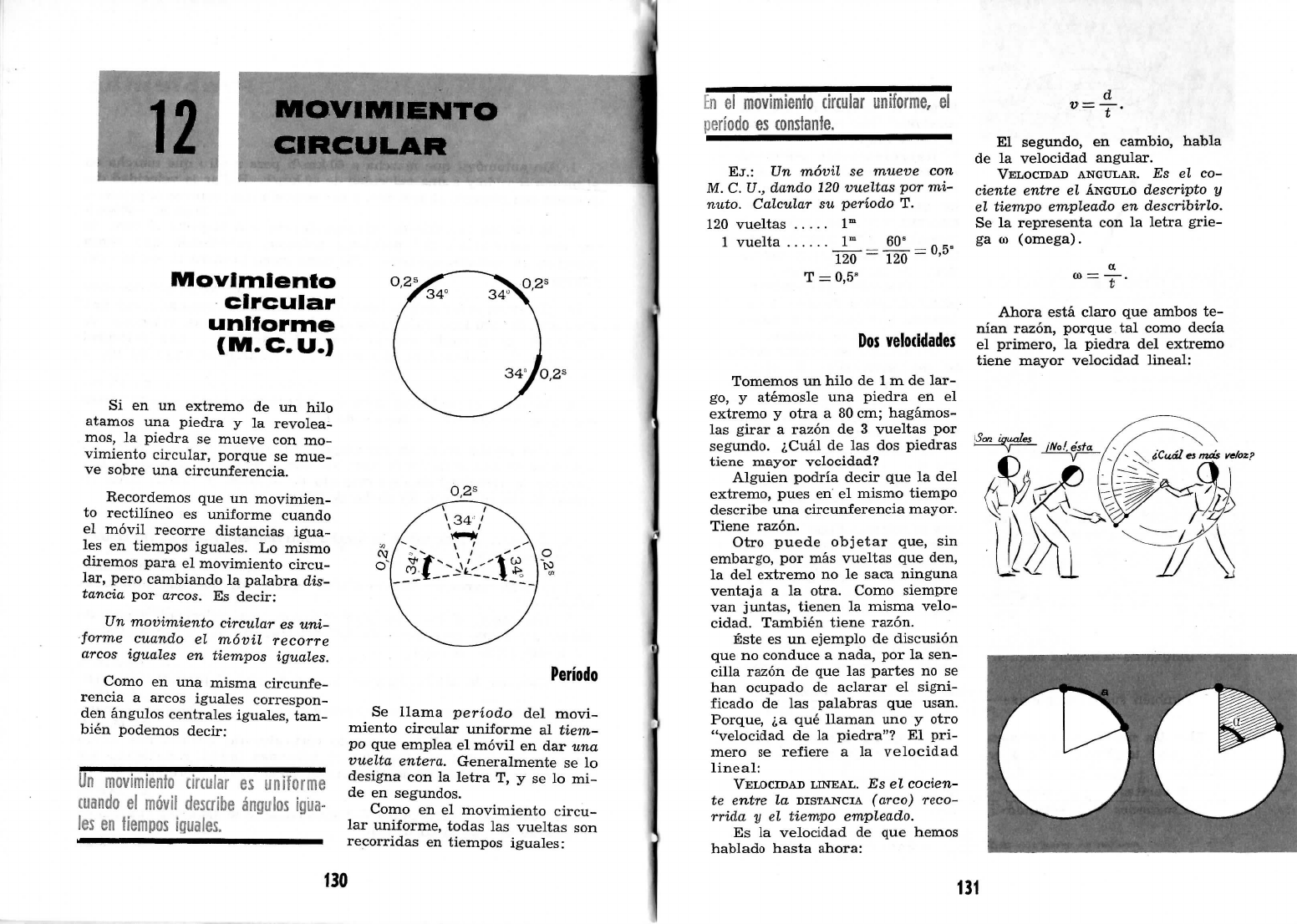 MOVIMIENTO CIRCULAR Movimiento circular uniforme (M.C.U.l Si en un extremo de un hilo atamos una piedra y la revolea- mos, la piedra se mueve con mo- vimiento circular, porque se mue- ve sobre una circunferencia. Recordemos que un movimien- to rectilíneo es uniforme cuando el móvil recorre distancias igua- les en tiempos iguales. Lo mismo diremos para el movimiento circu- lar, pero cambiando la palabra dis- tancia por arcos. Es decir: Un movimiento circular es uni- forme cuando el móvil recorre arcos iguales en tiempos iguales. Como en una misma circunfe- rencia a arcos iguales correspon- den ángulos centrales iguales, tam- bién podemos decir: Un movimiento circular es uniforme cuando el móvil describe ángulos igua- les en tiempos iguales. 0,2S 0,2S Período Se llama período del movi- miento circular uniforme al tiem- po que emplea el móvil en dar una vuelta, entera.. Generalmente se lo designa con la letra T, y se lo mi- de en segundos. Como en el movimiento circu- lar uniforme, todas las vueltas son recorridas en tiempos iguales: 130 j) el movimiento circular uniforme, el período es constantes EJ.: Un móvil se •mueve con M. C. U., dando 120 vueltas por mi- nuto. Calcular su período T. 120 vueltas 1™ 1 vuelta lm 60" 120 T = 0,5" 120 = 0,5' Dos velocidades Tomemos un hilo de 1 m de lar- go, y atémosle una piedra en el extremo y otra a 80 cm; hagámos- las girar a razón de 3 vueltas por segundo. ¿Cuál de las dos piedras tiene mayor velocidad? Alguien podría decir que la del extremo, pues en el mismo tiempo describe una circunferencia mayor. Tiene razón. Otro puede objetar que, sin embargo, por más vueltas que den, la del extremo no le saca ninguna ventaja a la otra. Como siempre van juntas, tienen la misma velo- cidad. También tiene razón. Éste es un ejemplo de discusión que no conduce a nada, por la sen- cilla razón de que las partes no se han ocupado de aclarar el signi- ficado de las palabras que usan. Porque, ¿a qué llaman uno y otro "velocidad de la piedra"? El pri- mero se refiere a la velocidad lineal: VELOCIDAD LINEAL. Es el cocien- te entre la DISTANCIA (arco) reco- rrida y el tiempo empleado. Es la velocidad de que hemos hablado hasta ahora: v = El segundo, en cambio, habla de la velocidad angular. VELOCIDAD ANGULAR. Es el co- ciente entre el ÁNGULO descripto y el tiempo empleado en describirlo. Se la representa con la letra grie- ga to (omega). Ahora está claro que ambos te- nían razón, porque tal como decía el primero, la piedra del extremo tiene mayor velocidad lineal: veloz? 131 di 3 x 2 ?t ri 1 1c;nR = 15,08 - S La velocidad angular, en cam- bio, es la misma para las dos: cu 3 x 360° grados (Oí — — — — — —•- — z^ 1 UoU - t 1" seg tte 3 X360° grados Ü>2 = — = - 7T - = 1 080 ' --t 1" seg JBn el movimiento circular uni- forme, la velocidad angular es constante. Por eso el movimiento se llama uniforme. Representación gráfica de la velocidad angular. La velocidad angular de un movimiento circu- lar es, como la velocidad rectilí- nea, una magnitud vectorial. Se la representa gráficamente por me- dio de un vector, cuyas caracterís- ticas son las siguientes: 1) Dirección: perpendicular al plano al que pertenece la circun- ferencia que describe el móvil (es paralelo al eje de rotación). 2) Sentido: se obtiene median- te una convención. Es el mismo sentido en que avanza un tirabu- zón, colocado perpendicularmente al plano en que se efectúa el movi- miento, cuando se lo hace girar en el mismo sentido que tiene el móvil. 3) Medida: se la representa por medio de una escala adecuada. Unidad para medir velocida- des angulares. Como la velocidad angular es el cociente entre el ángulo descripto y el tiempo em- pleado, la unidad para medirla es el cociente entre la unidad de ángulo y la unidad de tiempo. ., , , , ., , , unidad de ángulo gradounidad de velocidad angular = —;^r3—,—-•_ ^._—-\ —— T También suelen emplearse unidad de tiempo segundo vueltas _ vueltas revoluciones segundo ' minuto minuto EJ.: Un móvtt con movimien- to circular uniforme tarda 5 se- gundos en dar 2 vueltas. Calcular su velocidad angular. 2 vueltas 5 segundos = 0,4 vueltas segundo = 24 revol. = 24 360° • = 8 640 grados 144 jradosseg 132 EJ.: Un motor efectúa 2 000 re- voluciones por minuto. Calcular su velocidad angular en grados/ segundo. Como una revolución o vuelta tiene 360°, Equivalencia entre radianes y grados sexagesimales. Un ángulo llano mide 180°. En radianes, en cambio, su medida es: longitud del arco _ K r _ 60" = 12 000 seg. revol. min. Como se ve, en estos casos de velocidades angulares grandes, conviene usar la unidad revolucio- nes/minuto, pues es más cómoda. Una nueva unidad para medir ángulos. En física, para medir ángulos se usa mucho una unidad que aún no hemos mencionado: e) radián. En la circunferencia de la fi- gura se ha trazado un triángulo equilátero mixtilíneo. El ángulo central mide 1 radián. Es decir que: Definición de radián: Es el ángulo central al que corresponde un arco de longitud igual al radio. Cómo se obtiene la medida en radianes. Se hace el cociente entre la longitud cí del arco y la longitud r del radio: En el caso del triángulo equi- látero mixtilíneo -resulta: longitud del radio De modo que: it radianes = 180° , ,., 180°1 radian =: Las medidos de estos ángulos están expresadas en radianes. 133 _, ángulo descripto fl) — ——=.— _—__= ,,„.—= tiempo empleado 1 radián = 57°17'44",8 = 206 264,8" Pasaje de grados a radianes, y viceversa. Para expresar en ra- dianes un ángulo dado en grados, éstos se reducen a segundos y se divide por 206 264,8, o, aproxima- damente, por 206 265. EJ.: Expresar en radianes el ángulo de 75° 36' 25". 75° 36' 25" = 272 185" = 272185 =-20626F = 1'3196 Si se tiene un ángulo expresado en radianes y se lo desea en gra- dos, se multiplica por 206 265, y se lo tiene así en segundos. Luego se reduce a grados. EJ.: Expresa