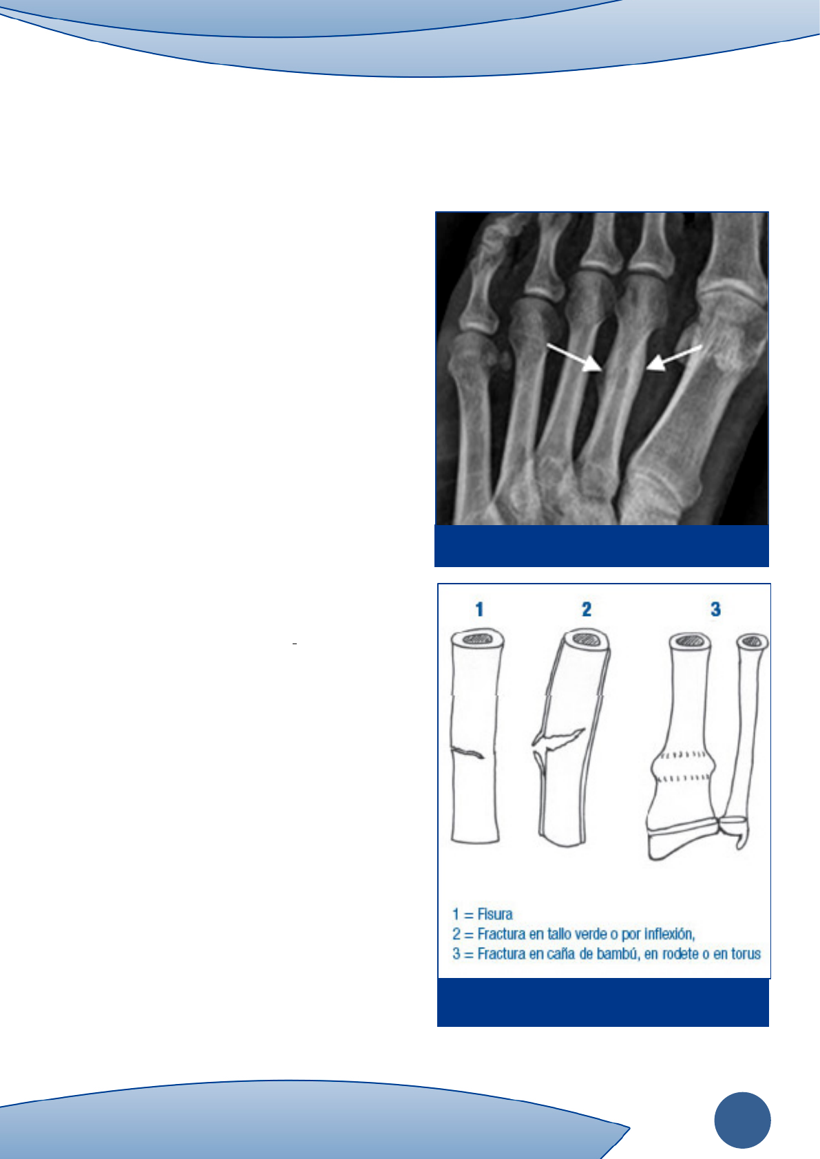 CAPÍTULO 47 - CLASIFICACIÓN FRACTURAS. PRINCIPIOS GENERALES Autores: Juan José García Vera, Juan Miguel Gómez Palomo Coordinador: Alfonso Queipo de Llano Temboury Hospital Universitario Virgen de la Victoria (Málaga) 1.- DEFINICIÓN Una fractura es una interrupción de la continuidad ósea o cartilaginosa (1). Clasificar es ordenar o agrupar algo por clases con un objetivo. En el caso de las fracturas, las clases se hacen atendiendo a diferentes criterios como la energía disipada en el traumatismo, el mecanismo de producción, el estado de las partes blandas, la extensión del trazo, la estabilidad de la fractura, la localización anatómica, etc . El objetivo suele ser definir mejor la fractura de cara a su tratamiento. Se pueden clasificar las fracturas según: 2.- SEGÚN LA ENERGÍA DISIPADA EN EL TRAUMATISMO • Fractura de alta energía: Se refiere a la gran energía cinética del traumatismo que se va a trasmitir una a la extremidad y por ende al hueso, por lo que nos vamos a encontrar con importantes lesiones del hueso y de las partes blandas. • Fractura de baja energía: No se necesita un gran traumatismo para producirla. Dos ejemplos: a) Fracturas por estrés o por fatiga: Son las resultantes de aplicar una fuerza de poca intensidad y repetidamente ocíclicamente sobre un hueso normal o patológico (por ejemplo la fractura del recluta o por estrés del 2º metatarsiano que recibe también el nombre de fractura de Deütschlander (Figura1). b) Fracturas patológicas o por insuficiencia: Son las que se producen sobre un hueso anormalmente débil por una enfermedad constitucional o adquirida, sin que requiera una fuerza anormal para producirla. 3.- SEGÚN LA EXTENSIÓN DEL TRAZO • Fractura completa: Es aquella en la que el trazo afecta a todo el espesor del hueso y periostio. • Fractura incompleta: Es aquella en la que el trazo no afecta a todo el espesor del hueso (Figura 2). a) Fisuras: afecta a parte del espesor. b) Fracturas en tallo verde: típica en los niños, suceden por flexión en huesos flexibles. Hay solución de continuidad en la superficie de tensión pero no progresa en la de compresión. c) Fracturas en rodete: típica de los niños en las zonas de unión metafiso-diafisarias. El hueso cortical metafisario es insuflado por compresión del eje vertical (2). Figura 1. Figura 2. Fisuras incompletas. 233 4.- SEGÚN EL MECANISMO DE PRODUCCIÓN • Fracturas por mecanismo directo: Son las producidas en el lugar del impacto de la fuerza responsable, pueden ser multifragmentarias. • Fracturas por mecanismo indirecto: Se producen a distancia del lugar del traumatismo. Las podemos clasificar de la siguiente forma: a) Fracturas por tensión o tracción: debidas a dos fuerzas que actúan en la misma dirección pero en sentido opuesto, divergentes desde el hueso. Ejemplos: arrancamientos maleolares, avulsión tuberosidad tibial anterior (Figura 3). b) Fracturas por compresión: debidas a dos fuerzas que actúan en la misma dirección pero en sentido opuesto, convergentes hacia el hueso. Suelen ocurrir en hueso esponjoso como el cuerpo vertebral (Figura 4), el hundimiento de meseta tibial, etc. Cuando sucede en un hueso diafisario, el trazo de fractura suele ser oblicuo. c) Fracturas por torsión: Debidas a una fuerza que ocasiona un movimiento de rotación del hueso sobre su eje. El trazo suele ser espiroideo (Figura 5). d) Fracturas por flexión: Debidas a dos fuerzas de direcciones paralelas que actúan en el mismo sentido, pero cada una en un extremo del hueso. El trazo suele ser trasverso o ligeramente oblicuo y puede existir un tercer fragmento en ala de mariposa (Figura 6). e) Fracturas por cizallamiento: Son debidas a dos fuerzas paralelas en sentido opuesto, convergentes hacia el hueso. El trazo suele ser transversal. Figura 3. 5.- SEGÚN LA LESIÓN TISULAR • Fracturas cerradas: No existe comunicación del foco de fractura con el exterior. Pueden a su vez clafisicarse según la intensidad de la lesión de las partes blandas asociada mediante la clasificación de Figura 4. Figura 5. Figura 6. Tscherne y Oestern (Tabla 1) y también la clasificación de la AO. • Fracturas abiertas: Existe una solución de continuidad en la piel que comunica el foco de fractura con el exterior. La clasificación más usada es la de Gustilo y Anderson distingue tres tipos (Tabla 2) (3,4). 6.- SEGÚN LA LOCALIZACIÓN En los huesos largos distinguimos fracturas diafisarias, metafisarias y epifisarias. Aquellas fracturas en las que el trazo afecta o se extiende hasta la superficie articular se 234 Tabla 1. Clasificación de Tscherne y Oestern para las fracturas cerradas Grado Lesión de partes blandas Mecanismo Desplazamiento Conminución 0 Ausente o mínima Indirecto Mínimo No I Abrasiones o contusiones superficiales Indirecto Moderado No II Contusión muscular significativa e incluso abrasiones profundas contaminadas. Síndrome compartimental inminente. Directo Intenso Si III Contusión extensa, con despegamiento cutáneo y destrucción de la musculatura. Lesión vascular. Síndrome compatimental establecido. Directo y de alta energía Intenso Si Tabla 2. Clasificación de Gustilo y Anderson para las fracturas abiertas Tipo Tamaño herida Grado de contaminación Daño de las partes blandas Conminución ósea I <1 cm Mínimo Mínimo Ausente II 1-10 cm Moderado Moderado Moderada III >10 cm Intenso Intenso Intensa IIIA Es posible la cobertura ósea con partes blandas IIIB Para cubrir hueso se necesitan procesos de reconstrucción IIIC Lesión vascular asociada denominan fracturas articulares. En los que están en crecimiento, además, puede haber fracturas fisarias o epifisiolisis, donde la clasificación de Salter y Harris es la más extendida (2) y se distinguen 6 tipos de fracturas: • Tipo I: Consiste en una separación completa epifiso- metafisaria, pero sin fractura ósea. • Tipo II: Es el tipo más común de lesión fisaria. En ella el trazo de fractura se extiende a