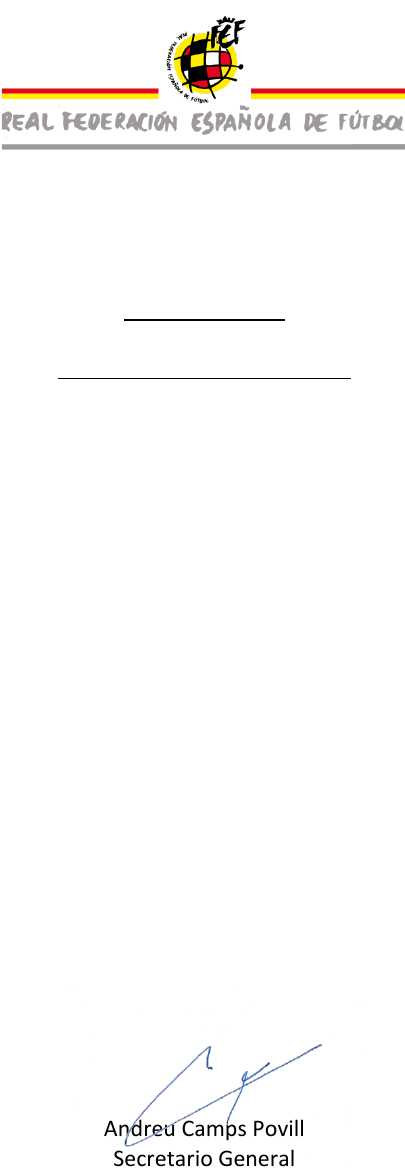 Temporada 2019/2020 CIRCULAR Nº 92 REGLAS DE JUEGO DE FUTSAL Temporada 2020/2021 Por medio de la presente, la RFEF desea comunicar a todos los estamentos pertenecientes a la especialidad de fútbol sala el contenido de las Reglas de Juego de Futsal para la Temporada 2020/2021. Asimismo, se informa que la entrada en vigor de las Reglas de Juego se ha producido desde el 1 de junio de 2020, excepto para aquellas competiciones que aun se tienen que disputar en el curso de la Temporada 2019/2020. Se adjunta el texto íntegro de las Reglas de Juego de Futsal para la Temporada 2020/2021 a fin de que sea debidamente conocida y atendida por todos los estamentos pertenecientes a la especialidad de fútbol sala. En caso de necesitar cualquier otro tipo de información complementaria al respecto pueden contactar directamente con el Comité Técnico de Árbitros de Fútbol Sala. Todo lo anterior se comunica para el general conocimiento y a los efectos oportunos. En Las Rozas de Madrid, a 6 de julio de 2020. Andreu Camps Povill Secretario General Reglas de Juego del FUTSAL 2020/21 Fédération Internationale de Football Association Presidente: Gianni Infantino Secretaria general: Fatma Samoura Dirección: FIFA-Strasse 20 Apdo. de correos 8044 Zúrich Suiza Teléfono: +41 (0)43 222 7777 Internet: FIFA.com 1 REGLAS DE JUEGO DEL FUTSAL 2020/21 Aprobadas por la Comisión de Árbitros de la FIFA y el Consejo de la FIFA. Queda prohibida la reproducción total o parcial de esta publicación por cualquier medio o procedimiento sin el consentimiento previo de la FIFA. Entrada en vigor: 1 de junio de 2020 2 ÍNDICE2 Página OBSERVACIONES SOBRE LAS REGLAS DE JUEGO DEL FUTSAL 6 REGLA 1. EL TERRENO DE JUEGO 10 1 Terreno de juego 10 2 Marcación del terreno de juego 10 3 Dimensiones del terreno de juego 12 4 Área penal 13 5 El punto de los 10 m 14 6 Zonas de sustituciones 14 7 Área de esquina 14 8 Área técnica 15 9 Porterías 16 10 Desplazamiento de las porterías 18 11 Publicidad sobre el terreno de juego 19 12 Publicidad en las redes de las porterías 19 13 Publicidad en las áreas técnicas 19 14 Publicidad alrededor del terreno de juego 19 REGLA 2. EL BALÓN 20 1 Características y medidas 20 2 Publicidad en el balón 21 3 Sustitución de un balón dañado o defectuoso 21 4 Balones adicionales 21 5 Segundo balón en el terreno de juego 22 6 Gol con un balón dañado o defectuoso 22 REGLA 3. LOS JUGADORES 23 1 Número de jugadores 23 2 Número de sustituciones y de suplentes 23 3 Entrega de la lista de jugadores y suplentes 24 4 Procedimiento de sustitución 24 5 Calentamiento 25 6 Cambio de guardameta 25 7 Infracciones y sanciones 26 8 Jugadores y suplentes expulsados 27 9 Personas no autorizadas en el terreno de juego 27 10 Gol marcado con una persona no autorizada en el terreno de juego 28 11 Regreso no autorizado de un jugador fuera del terreno de juego 29 12 Capitán del equipo 29 3ÍNDICE Página REGLA 4. EL EQUIPAMIENTO DE LOS JUGADORES 30 1 Seguridad 30 2 Equipamiento obligatorio 30 3 Colores del uniforme 31 4 Otro tipo de equipamiento 31 5 Eslóganes, mensajes, imágenes y publicidad 34 6 Infracciones y sanciones 35 7 Numeración de los jugadores 36 REGLA 5. LOS ÁRBITROS 37 1 Autoridad de los árbitros 37 2 Decisiones de los árbitros 37 3 Facultades y obligaciones 38 4 Responsabilidad del equipo arbitral 40 5 Partidos internacionales 41 6 Equipamiento del árbitro 42 REGLA 6. LOS OTROS MIEMBROS DEL EQUIPO ARBITRAL 43 1 Árbitros asistentes adicionales 43 2 Facultades y obligaciones 43 3 Partidos internacionales 46 4 Árbitro asistente de reserva 46 REGLA 7. LA DURACIÓN DEL PARTIDO 48 1 Periodos de juego 48 2 Finalización de los periodos 48 3 Tiempo muerto 48 4 Descanso 49 5 Partido suspendido definitivamente 49 REGLA 8. INICIO Y REANUDACIÓN DEL JUEGO 50 1 Saque inicial 50 2 Balón a tierra 51 REGLA 9. BALÓN EN JUEGO 52 1 Balón no en juego 52 2 Balón en juego 52 3 Canchas cubiertas 52 4 ÍNDICE Página REGLA 10. EL RESULTADO DE UN PARTIDO 53 1 Gol válido 53 2 Equipo ganador 54 3 Tanda de penales 54 4 Goles marcados fuera de casa 56 REGLA 11. EL FUERA DE JUEGO 57 REGLA 12. FALTAS Y CONDUCTA INCORRECTA 58 1 Tiro libre directo 58 2 Tiro libre indirecto 60 3 Medidas disciplinarias 62 4 Reanudación del juego tras faltas y conducta incorrecta 68 REGLA 13. TIROS LIBRES 71 1 Tipos de tiros libres 71 2 Procedimiento 71 3 Infracciones y sanciones 73 4 Faltas acumuladas 74 5 Tiro libre directo a partir de la sexta falta acumulada en un periodo 75 REGLA 14. EL PENAL 79 1 Procedimiento 79 2 Infracciones y sanciones 80 3 Resumen 82 REGLA 15. EL SAQUE DE BANDA 83 1 Procedimiento 83 2 Infracciones y sanciones 84 REGLA 16. EL SAQUE DE META 85 1 Procedimiento 85 2 Infracciones y sanciones 85 1 Procedimiento 87 2 Infracciones y sanciones 87 5 Página DIRECTRICES PRÁCTICAS PARA ÁRBITROS DE FUTSAL Y OTROS MIEMBROS DEL EQUIPO ARBITRAL 89 SEÑALES 90 POSICIONAMIENTO 103 INTERPRETACIÓN DE LAS REGLAS Y OTRAS RECOMENDACIONES 124 TÉRMINOS DE FUTSAL 143 TÉRMINOS ARBITRALES 152 ÍNDICE 6 OBSERVACIONES SOBRE LAS REGLAS DE JUEGO DEL FUTSAL Idiomas oficiales La FIFA publica las Reglas de Juego del Futsal en alemán, español, francés e inglés. En caso de divergencias en los textos, la versión en inglés prevale- cerá sobre las demás. Otros idiomas Las federaciones nacionales de fútbol que traduzcan las Reglas de Juego del Futsal pueden solicitar a la FIFA la plantilla de la edición de 2020/21 enviando un mensaje a: refereeing@fifa.org. Se ruega a las federaciones nacionales de fútbol que traduzcan las Reglas de Juego del Futsal utili- zando este formato que envíen un ejemplar a la FIFA (en el que figure claramente en la portada que se trata de la traducción oficial de la federa- ción nacional) para publicarlo en FIFA.com como ayuda y referencia. Aplicación de las Reglas del Futsal El hecho de que se aplique el mismo reglamento de futsal en cada con- federación, país y población otorga a este deporte u