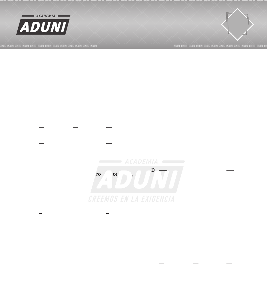 Anual San Marcos Aritmética 1. De un grupo de 80 personas, de las cuales 36 bailan, se sabe que 12 varones no bailan. Si elegimos una persona al azar; ¿cuál es la pro- babilidad de que no baile, si se sabe que es mujer? A) 11 14 B) 16 25 C) 21 25 D) 14 27 E) 15 32 2. En una bolsa se tienen 8 bolitas enumeradas correlativamente del 1 al 8. Calcule la proba- bilidad de obtener un número menor que 6, dado que fue impar. A) 3 4 B) 2 3 C) 2 5 D) 4 7 E) 1 8 3. La probabilidad de que Milagros ingrese a la UNMSM es 0,2 y de que Grisel ingrese es 0,4; si dichos eventos son independientes. ¿Cuál es la probabilidad de que ninguna ingrese a la UNMSM? A) 0,08 B) 0,44 C) 0,42 D) 0,48 E) 0,84 4. Entre 10 cargadores de celulares se han mez- clado 7 que funcionan bien con 3 que no fun- cionan. Se toman al azar los cargadores, uno por uno, y se verifica cuál es defectuoso y cuál no. Una vez probados, ya no se reponen al gru- po. ¿Cuál es la probabilidad de que se encuen- tren los tres cargadores que no funcionan en las tres primeras pruebas? A) 1 120 B) 1 60 C) 27 1000 D) 1 240 E) 1 180 UNMSM 2022 - I 5. La probabilidad de que Raúl escuche la alerta de sismo es de 0,80; si la escucha, la probabi- lidad de que salga de su habitación a tiempo es de 0,90; y si no la escucha, la probabilidad disminuye a 0,50. Si Raúl llegó a salir a tiem- po de su habitación, determine la probabili- dad de que él haya escuchado la alarma del temblor A) 32 41 B) 36 41 C) 23 32 D) 35 82 E) 10 82 UNMSM 2022 - II Probabilidad II AnuAl SAn MArcoS - 2023 11 Práctica dirigida de Práctica dirigida de AritméticaAritmética semanasemana 4040