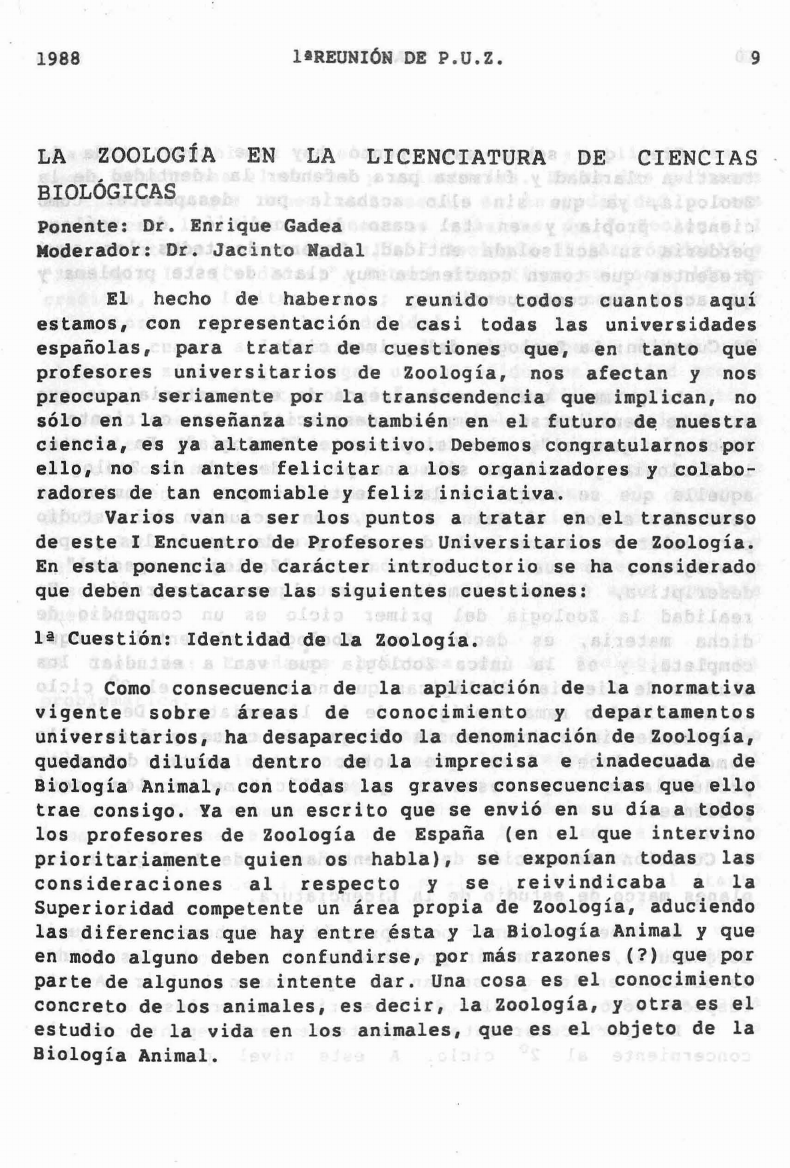 1988 11REUNI6N DE P.U.Z. 9 LA ZOOLOGíA EN LA LICENCIATURA DE CIENCIAS· BIOLÓGICAS Ponente: Dr. Enrique Gadea Moderador: Dr. Jacinto Hadal El hecho de habernos reunido todos cuantos aquí estamos, con representación de casi todas las universidades españolas, para tratar de cuestiones que, en tanto que profesores universitarios de Zoología, nos afectan y nos preocupan seriamente por la transcendencia que implican, no sólo en la enseñanza sino también' en el futuro d~ nuestra ciencia, es ya al.tamente pos i tivo. Debemos congratularnos por ello, no sin antes felicitar a los organizadores y colabo- radores de tan encomiable y feliz iniciativa. Varios van a ser los puntos a tratar en el transcurso de este I Encuentro de Profesores Universitarios de Zoología. En esta ponencia de carácter introductorio se ha considerado que deben destacarse las siguientes cuestiones: 151 Cuestión: Identidad de la Zoología. Como consecuencia de la aplicación de la normativa vigente sobre áreas de conocimiento y departamentos universitarios, ha desaparecido la denominación de Zo~logía, quedando diluída dentro de la imprecisa e inadecuada· de Biología Animal, con todas las graves consecuencias que ello trae consigo. Ya en un escrito que se envió en su día a todos los profesores de Zoología de España (en el que intervino prioritariamente quien os habla), se exponían todas las consideraciones al respecto y se reivindicaba a la Superioridad competente un área propia de Zoología, aduciendo las diferencias que hay entre ésta y la Biología Animal y que en modo alguno deben confundirse, por más razones (?) que por parte de algunos se intente dar. Una cosa es el conocimiento concreto de los animales, es decir, la zoología, y otra es el estudio de la vida en los animales, que es el objeto de la Biología Animal. 10 TRAZOS Creo que sobre este punto hay que tener toda la taxativa claridad y firmeza para defender la identidad de la Zoología, ya que sin ello acabaría por desaparecer como ciencia propia y en tal caso la condición de zoólogo perdería su acrisolada entidad. Espero de todos los aquí presentes que tomen conciencia muy clara de este problema y que actuen en consecuencia. 2ª Cuestión: La Zoología del primer ciclo. Lo primero que procede acerca de esta materia es que no debe denominarse -como es desgraciadamente corriente "Zoo l og ía general", sino simplemente "Zoología". En efecto, la Zoología general es sólo una parte de toda la Zoología: aquella que se ocupa de las cuestiones que son comunes o generales a todo el Reino Animal, con exclusión del estudio particular y sistematizado de todos y cada uno de los grupos zoológicos, lo cual es objeto de la ."Zo010g ía especial" o descriptiva, llamada también por algunos Zoografía. En realidad la Zoología del primer ciclo es un compendio de dicha materia, es decir, una Zoología elemental aunque completa, y es la única Zoológía que van a estudiar los alumnos de Ciencias Biológicas. que no cursen en el 20 ciclo la modalidad o rama zoológica de la licenciatura. De ahí la transcendencia e importancia de que se curse y desarrolle como se debe. Cre~ que sobre este punto deberían pronunciarse muy resuelta y explícitamente los· aquí presentes. 3ª Cuestión: Adecuación de las enseñanzas de Zoología a los planes marco de estudio de ia Licenciatura. Se debe considerar poco pragmático elaborar y discutir asignaturas, sin conocer previamente el marco de los planes de estudio en los que se han de implantar o incluir. A este respecto sólo cabe hablar de directrices generales. Es particularmente importante este punto en lo concerniente al 20 ciclo. A este nivel parece lo mas 1988 11REUNIÓN DE P.U.Z. 11 plausible establecer enseñanzas troncales y obligatorias y luego enseñanzas electivas y voluntarias. Entre las primeras se considera que deben mantenerse, en la modalidad o rama zoológica, las tres asignaturas clásicas de " Zoología 1 (Invertebrados no artrópodos)", " Zoología 11 (Artrópodos)" y "Zoología 111 (Cordados)". Deberá discutirse su contenido en créditos, sus límites, etc.: pero en todo caso deben ser obligatorias para dicha modalidad. En cuanto a las otras, podrán establecerse asignaturas electivas siempre que tengan un contenido con entidad propia (por ej. una "Protozoología", una "Zoofilogenia",· etc), evitando que se trate de meros capítulos de las asignaturas troncales. En lo posible se debería evitar introducir en el 20 ciclo asignaturas que fuesen materias aplicadas o excesivamente especializadas, dejándolas para el tercero, donde ahí sí caben y encuentran su más genuina razón de ser. Sería muy interesante que este punto se meditara y debatiera muy bien, procurando los aquí presentes sopesar y resolver algunas cuestiones de principio sobre esta compleja cuestión. 49 Cuestión: Enseñanza práctica de la Zoología y su problemática. Evidentemente la enseñanza práctica tiene, por lo menos, tanta importancia como la teórica, para el conocimiento de la Zoología: en esto nunca se insistirá bastante. Sin embargo, los medios financieros e incluso humanos que hasta ahora se vienen destinando al aspecto práctico son muy insuficientes. Constituye este punto, un auténtico campo de batalla. La adquisición de material (tanto para colecciones como para disección), las prácticas de campo, etc. son de financiación muy onerosa y esto difícilmente quiere comprenderlo la Superioridad Competente. Contrasta la penuria con que se ha venido moviendo la Zoología en este aspecto, con las generosas subvenciones para prácticas de este tipo que tienen otras materias (por ej. la Geología). 12 TRAZOS Se considera importantísimo hacer hincapié en este punto y estudiar un plan de viabilidad aceptable que garantice unas prácticas de Zoología dignas y eficientes. 5ª Cuestión: El tercer ciclo y la propedéutica a la investigación. A estas alturas aun constituye una caja de enigmas el llamado te