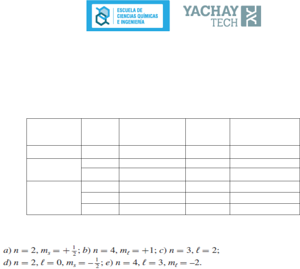 Nivelación de Carrera Asignatura: Química Semestre 2019-2 Guía de Ejercicios. Teoría cuántica del átomo y configuraciones electrónicas_Números cuánticos 1. Proporcione los cuatro números cuánticos de cada uno de los electrones en un orbital 6s. 2. Relación entre números cuánticos y orbitales atómicos n l ml Número de orbitales Designación de orbitales atómicos 1 2 3 3. ¿Cuál es el máximo número de electrones de un átomo que pueden tener los siguientes números cuánticos? Especifique en qué orbitales pueden hallarse estos electrones 4. ¿Cuál es el número total de orbitales asociados al número cuántico principal n = 3? 5. Escriba los cuatro números cuánticos para un electrón situado en un orbital 3p 6. Haga un listado de los valores de n, ℓ y mℓ, para los orbitales del subnivel 4d. 7. Justificar el número de electrones que pueden estar presentes, como máximo, en un orbital f. 8. ¿Es posible que existan en un átomo electrones con los números cuánticos: (1, 1, 1, ½); (2, -1, 1, ½); (2, 1, -1, ½); (0, 1, 1, ½); (2, 1, 2, ½)?