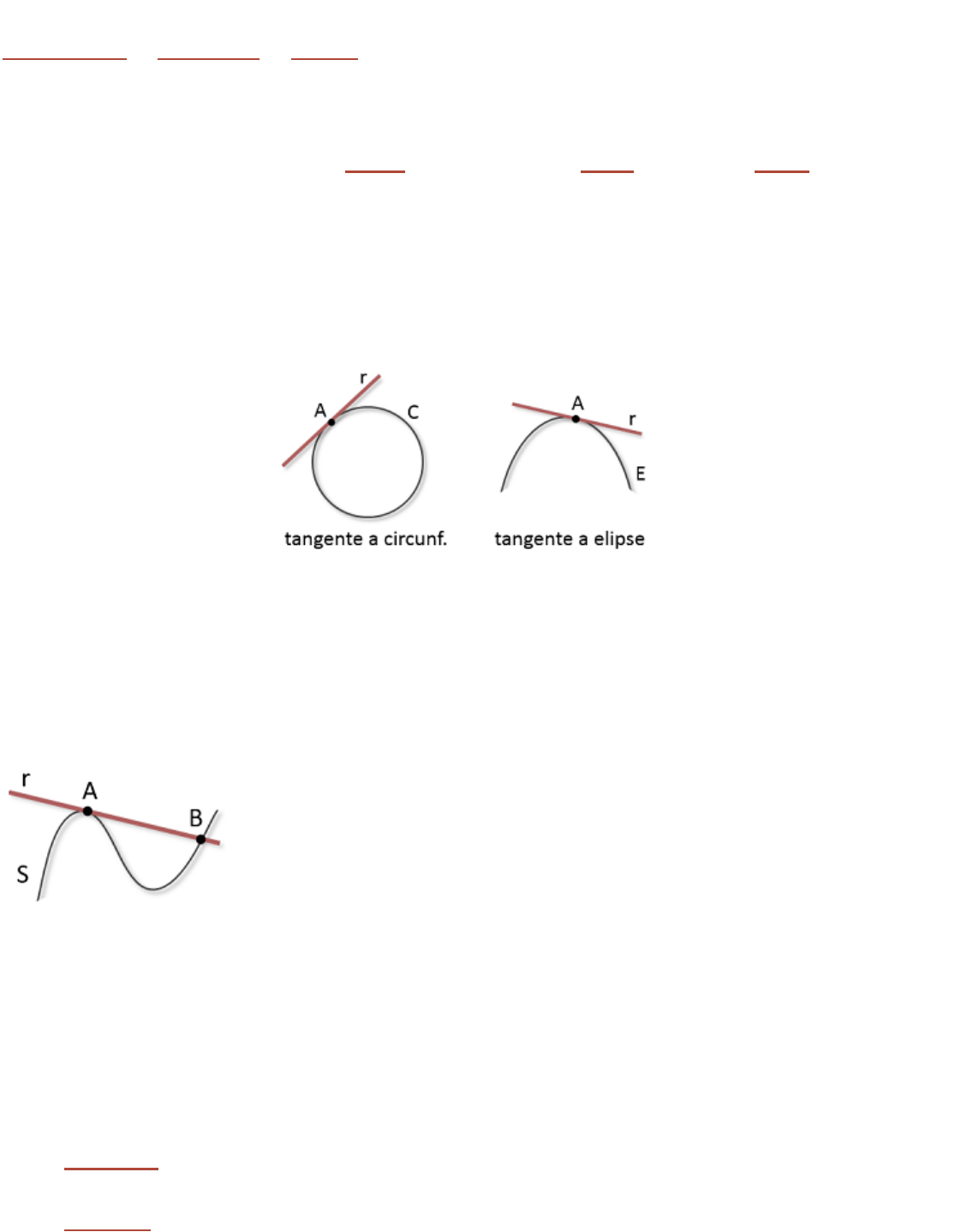 Ejemplos de Rectas Tangentes Matemáticas → Geometría → Rectas → Tangentes Definición de Recta Tangente: Las Rectas Tangentes son aquellas rectas que cortan a una curva en un único punto. Nota: etimológicamente "tangente" procede del latín "tanges -entis" que significa "que toca". Ejemplos de Rectas Tangentes: Sea una curva C (circunferencia) y una curva E (elipse) (ver imagen a continuación): En el primer caso, la recta tangente al punto A de la curva C (circunferencia) es la recta r ya que es la única que corta a la circunferencia en el punto A y en ninguno más. En el segundo caso, la recta tangente al punto A de la curva E (elipse) es la recta r ya que es la única que corta a la circunferencia en el punto A y en ninguno más. Nota: es posible que debido a la forma de la curva, la prolongación de la recta tangente a un punto pueda cortarla en otro punto diferente, como en el ejemplo de la imagen de la izquierda. En este caso la recta tangente al punto A seguiría siendo la recta r aunque su prolongación corte a la curva S en el punto B. Otros Tipos de Rectas: Semirecta: cada una de las 2 partes en las que se divide una recta al ser cortada en uno de sus puntos Secantes: las secantes son rectas que cortan a una curva en dos puntos http://www.matematicas10.net/2015/11/las-matematicas.html http://www.matematicas10.net/2015/11/la-geometria.html http://www.matematicas10.net/2015/12/ejemplos-y-tipos-de-rectas.html http://www.matematicas10.net/2015/12/ejemplos-y-tipos-de-rectas.html http://www.matematicas10.net/2015/12/ejemplos-y-tipos-de-curvas.html http://www.matematicas10.net/2016/05/los-puntos.html http://www.matematicas10.net/2015/12/las-semirrectas.html http://www.matematicas10.net/2015/12/rectas-secantes.html https://1.bp.blogspot.com/-vvHfjEbX5O0/WKyY6Xu2C-I/AAAAAAAAZ1w/7ZmjXop-GH85qoaD6hVFWtb88O1RMwVAgCLcB/s1600/Tangentes.png https://4.bp.blogspot.com/-MjBaeS9X4Jk/WKyYOgRPhyI/AAAAAAAAZ1s/L8XvP-R3d6M8fCG2aeKGxoHdG_aQOH9HwCLcB/s1600/Tangentes_2.png Tangentes: son rectas secantes que cortan a una curva solo en un punto Paralelas: son rectas que están en un mismo plano y solo se cortan en el infinito Perpendiculares: rectas que se cortan en un único punto con un ángulo de 90º (ángulo recto) Segmento: es una porción finita de una recta que está comprendido entre dos puntos extremos Cuerda: segmento con extremos en dos puntos de una curva (es una porción de una recta secante) Radio: es el segmento que une el centro de una circunferencia y cualquiera de sus puntos Diámetro: segmento que pasa por el centro y une 2 puntos extremos de una circunferencia Coincidentes: rectas que tienen los mismos puntos en común Mediatriz de un segmento: recta que corta a un segmento perpendicularmente por su punto medio http://www.matematicas10.net/2015/12/rectas-tangentes.html http://www.matematicas10.net/2015/12/rectas-paralelas.html http://www.matematicas10.net/2015/12/rectas-perpendiculares.html http://www.matematicas10.net/2015/12/los-segmentos.html http://www.matematicas10.net/2015/12/las-cuerdas.html http://www.matematicas10.net/2015/12/radios.html http://www.matematicas10.net/2015/12/el-diametro.html http://www.matematicas10.net/2017/02/ejemplos-de-rectas-coincidentes.html http://www.matematicas10.net/2017/02/ejemplos-de-mediatriz.html Ejemplos de Rectas Tangentes