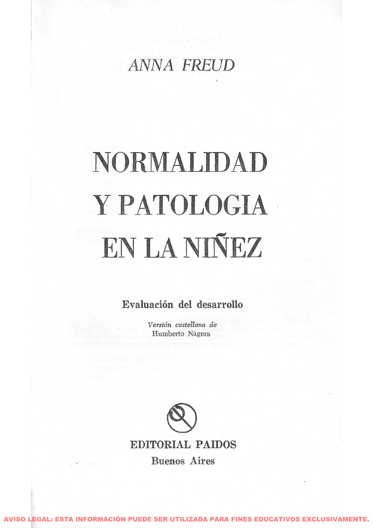 ANNA FREUD NORMALIDAD Y PATOLOGIA , EN LA NIÑEZ Evaluación del desarrollo Vers:ión castellana de Humberto Nágera EDITORIAL PAIDOS Buenos Aires AVISO LEGAL: ESTA INFORMACIÓN PUEDE SER UTILIZADA PARA FINES EDUCATIVOS EXCLUSIVAMENTE. BIBLIOGRAFIA Aichhorn, A. (1923-1948): Delinquency and Child Guidance: Selected Papers. Nueva York, International Universities Press, 1965. -- (1925): Wayward Youth. Nueva York, Viking Press, 1935. [Hay versión castellana: Juventud descarriada. Madrid, Martínez de Murguía, 1956.] Alpert, A. (1959): "Reversibility of Pathological Fixations Associated with Maternal Deprivation in Infancy". The Psychoan alytic Stu- dy of the Child, XIV, págs. 169-185.* Angel, A. Véase K atan, A. Bibring, Edward (1936): "Th e Development and Problems of th e Theory of the Instincts". Int. J. Psycho-AnaL, XXII, págs. 102-1 31, 1941. - - (1937) : "On the Theory of the Therapeutic Results of Psycho- Analysis". Int. J. Psycho-Anal., XVIII, págs. 170- 189. - - (1954): "Psychoanalysis and the Dynamic Psychotherapies". J . Amer. Psychoanal. Assn. , II, págs. 745-770. Bibring, Grete L. (1940): "über eine orale K omponente der mannlíchen Inversion". Int. Z . Psychoanal., xxv, págs. 124-130. Bóhm, F . (19 20) : "Beitráge zur Psychologie der Homosexualitát", Int. Z. Psychoanal., VI, págs. 297-319. - - (1930) : "The Femininity Complex in Men". Int. J. Psycho-Anal., XI, págs. 444- 469. -- (1933): "über zwei Typen von mánnlichen Homosexuellen". In t . Z. Psychoanal., XIX, págs. 499-506. Bonnard, A. (1950 ) : "Envir on m en tal Backgrounds Conducive to the Production of Abnormal Behaviour and Character Structure, Including Delinquency", en Congres Intern ational de Psychiatrie. París, Hermann. Bo rnstein, B. (949): "The Analysis of a Phobic Child". The Psucha- analytic Study of the Child, III y IV, págs. 181-226. - - (1951): "On Latency". The Psychoanalytic Study of the Child, VI, págs. 279- 285. Bowlby, J . (1944) : Forty-four Juvenile Thieves. Londres, Bailtiére, Tindall y Cox, 1946. - - (1960) : "Separ at ion Anxiety". Int . J . Psyc ho- A nal., XLI, págs . 89-113. - - Robertson, J am es y Rosenbluth, D. (1952): "A Two-Year- Old Gp es to Hospital". The Psychoanalytic Study of the Child, VII, pags. 82-94. Breuer, J . y Freud, S. (1893): "On the P sych ical Mech an ism of Hysterical Phenomena: Preliminary Communicat ion ". Standard Edition, II, págs. 1 -17.** Brodey, W. M. (1964) :"On the Dyn am ics of Narcissísm : 1. Externa- lization and Early Ego Developm en t" . The Psychoan aly tic Study of the Child (en prensa ). " T be Psychoanalytic Sludy of tbe Cbild , actualmente 19 volú menes, compilado por Ruth S. Eissler, Auna Freud, Heinz Hartmann, Marianne Kris. Nueva. York, Intcmational Universi ties P ress; Londres, Hogarth Press, 1945-1964. • * Véase nota de la página 185. 183 US O DI DÁ CT IC O Bryan, D. (1930): "Bisexuality". Int. J. Psycho-Anal., XI, págs. 150-166. Bühler, C. (1935): From Birth to Maturity. Londres, Routledge y Ke- gan Paul. Burlingham, D. (1952): Twins: A Study of Three Pairs of Identical Twins. Nueva York, International Universities Press. -- Goldberger, A. y Lussier, A. (1955): "Simultaneous Analysis of Mother and Child". The Psychoanalytic Study of the Child, X, págs. 165-186. Daly, C. D. (1928): "Der Menstruationskomplex". Imago, XIV, págs. 11-75. -- (1943): "The Role of Menstruation in Human Phylogenesis and Ontogenesis". Int. J. Psycho-Anal., XXIV, págs. 151-170. Eissler, K. R. (1950): "Ego-Psychological Implications of the Psycho- analytic Treatment of Delinquents". The Psychoanalytic Study of the Child, v, págs. 97-121. - - (1953): "The Effect of the Strueture of the Ego on Psychoana- lytic Technique". J. Amer Psychoanal. Assn., I, págs. 104-143. - - (1958): "Notes on Problems of Technique in the Psychoanalytic Treatment of Adolescents: With Sorne Remarks on Perversions". The Psychoanalytic Study of the Child, XIII, págs. 223-254. Fenichel, O. (1936): "The Symbolic Equation: Girl = Phallus". The Col- lected Papers of Otto Fenichel, TI, págs. 3-18. Nueva York, W. W. Norton, 1954. Ferenczi, S. (1909): "Introjection and Transference", en Sex in Psycho- analysis. Nueva York, Basic Books, 1950, págs. 35-93. [Hay ver- sión castellana: Sexo y psicoanálisis. Buenos Aires, Hormé, 1959.] -- (1911): "On the Part Played by Homosexuality in the Pathoge- nesis of Paranoia", en Sex in Psychoanalysis. Nueva York, Basic Books, 1950, págs. 154-186. -- (1914): "The Nosology of Male Homosexuality (Homoerotism), en Sex in Psychoanalysis. Nueva York, Basic Books, 1950, pág. 296- 318. Flügel, J. C. (1930): The Psychology of Clothes. Londres, Hogarth Press. [Hay versión castellana: Psicología del vestido. Buenos Aires, Paidós, 1964.] Freud, Anna (1926-1945): The Psycho-Analytical Treatment of Child- reno Londres, Imago Publishing Co., 1946; Nueva York, Internatio- nal Universities Press, 1955. [Hay versión castellana: Psicoaná- lisis del niño. Buenos Aires, Hormé, 1964.] -- (1945): "Indications for Child Analysis". The Psychoanalytic Study of the Child, I, págs. 127-150. -- (1946): "The Psychoanalytíc Study or Infantile Feeding Distur- bances". The Psychoanalytic Study of the Child, TI, págs. 119-132. -- (1949): "Aggression in Relation to Emotional Development". The Psychoanalytic Study of the Child, III y IV, págs. 37-42. -- (1951): "Observation on Child Development". The Psychoanaly- tic Study of the Child, VI, págs. 18-30. -- (1952): "The Role of Bodily Illness in the Mental Life of Child- ren". The Psychoanalytic Study of the Child, VII, págs. 69-81. -- (1962): "Assessment of Childhood Disturbances". The Psycho- analytic Study of the Chi14, XVII, págs. 149-158. -- Y Burlingham, D. (1943): War and Children. Nueva York, Inter- national Universities Press. [Hay versión castellana: La guerra y los niños. Buenos Aires, Hormé, 1965.] -- -- (1944): Infants Without Families. Nueva York, International Universities Press. [Hay