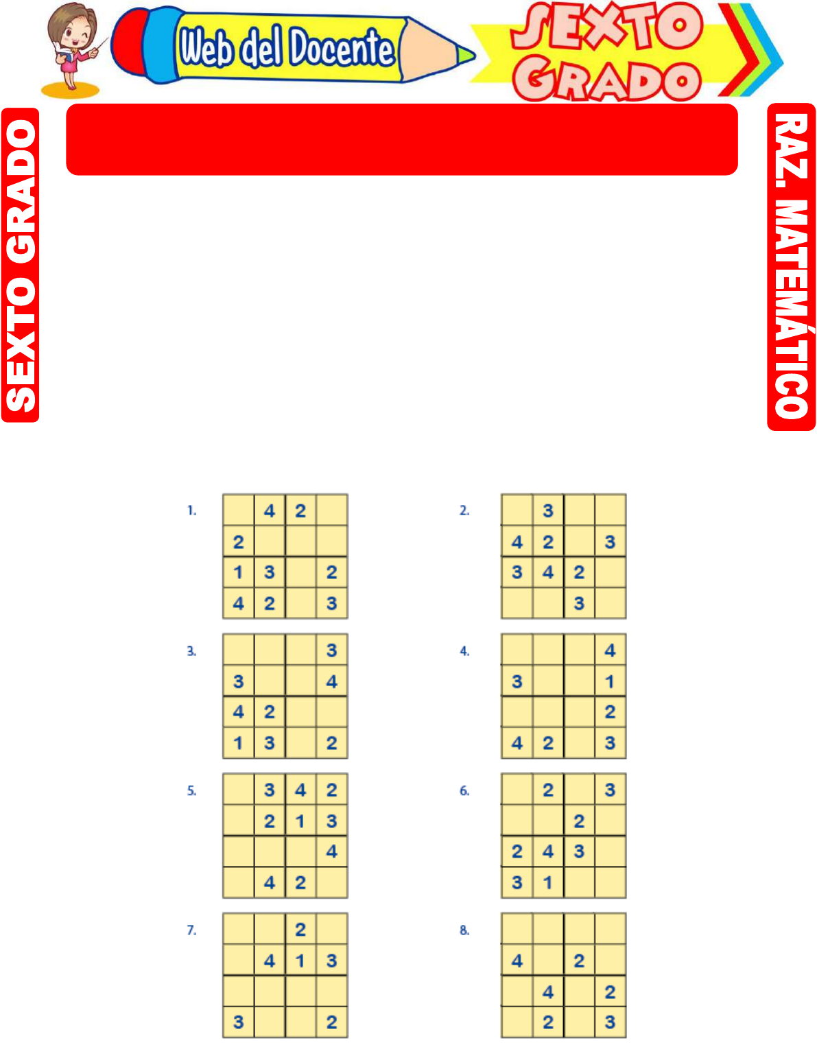 Razonamiento Matemático Visita: Webdeldocente.com Es uno de los juegos matemáticos y pasatiempos más populares del momento, fue inventado por el científico suizo Leonhard Euler en el siglo XVIII. Sus orígenes se dieron en Estados Unidos y se hizo popular en el año 1986. El juego está basado en un sistema de rompecabezas, el cual tiene como objetivo rellenar una cuadrícula o matriz de un número determinado de celdas; estas se encuentran divididas en subcuadrículas; llamadas también, cajas o regiones. Se ingresan los números del 1 hasta el número respectivo de celdas, pero teniendo muy presente que no se debe repetir ninguna cifra en la misma fila, columna o subcuadrícula. SUDOKU: 4 x 4 EL SUDOKU Razonamiento Matemático Visita: Webdeldocente.com SUDOKU: 9 x 9 Razonamiento Matemático Visita: Webdeldocente.com