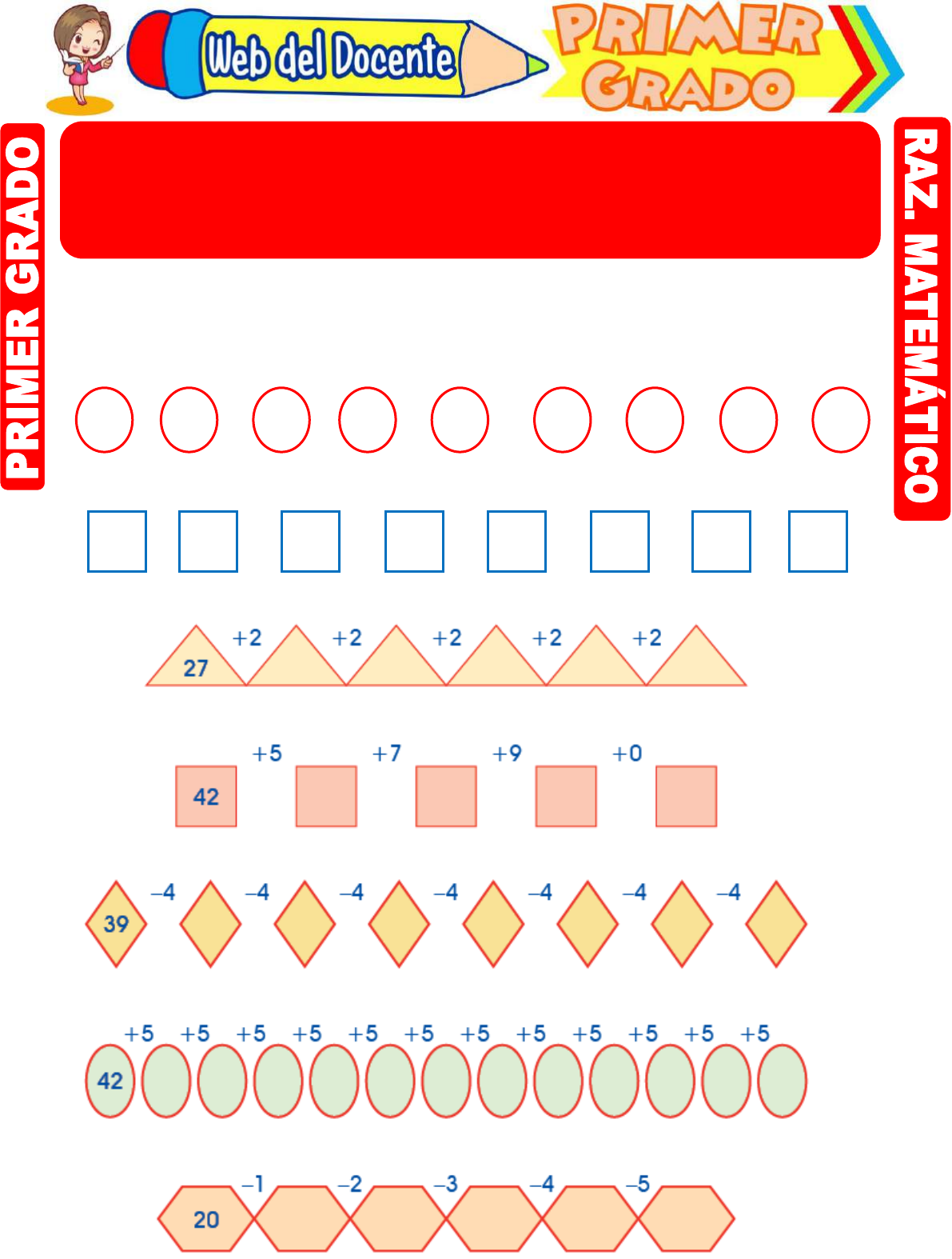Razonamiento Matemático Visita: Webdeldocente.com 1. Resuelve las siguientes series según cada condición. +2 +3 +1 +1 +2 +4 +1 +5 –2 –2 –2 –2 –2 –2 –2 COMPLETAMOS CON ADICIÓN Y SUSTRACCIÓN 6 29 Razonamiento Matemático Visita: Webdeldocente.com ¡Tú lo puedes hacer! 1. Cada figura tiene un valor (número) para que realices las operaciones (sumas o restas).