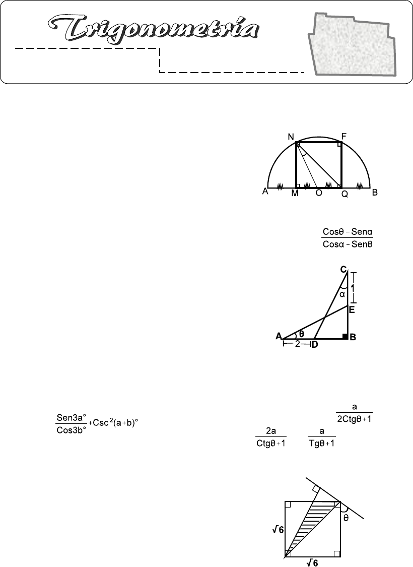 TEMA : R.T. DE AGUDOS 01. Si se cumple que x�0 y además: Tg(x2-8Senè).Ctg(x2+5Senè)=1 calcular el valor de: 5Secè - Tgè A) 7 B) 2 C) 6 D) 4 E) 5 02. Si se tiene que: Sen(2a+b)°=Cos(3a-b)° calcule el valor de : Tg(2a+9)°+ Sec(3a+6)° A) 1 B) 2 C) 3 D) 4 E) 5 03. Dadas las relaciones : Sen(a+b)° = Cos(a - b)° Tg(2a -b)° . Ctg(a+2b)°=1 calcule el valor de : Tg2(a+b)o + Csc(a - b)° A) 5 B) 4 C) 3 D) 2 E) 1 04. Dada la igualdad: Sen(2a+b)°=Cos(a+2b)° calcule el valor de: A) 5 B) 4 C) 3 D) 2 E) 1 05. Siendo “è” un ángulo agudo, para, el cual se tiene que Senè=5/13; calcule el valor de: Ctgè+3Tgè/2 A) 1 B) 2 C) 3 D) 4 E) 5 06. En un triángulo rectángulo ABC, recto en “C” se cumple que: 3+4Tg(B/2)=3CscA. calcule el valor de la expresión: 2CscA - TgB A) 1 B) 2 C) 3 D) 1/3 E) 1/2 07. En el esquema mostrado, calcule el valor de: 5Tg2è+1,4 A) 5 B) 4 C) 3 D) 2 E) 1 08. De la figura, hallar : si : CD=AE A) 1 B) 2 C) 3 D) 4 E) 5 09. Calcular el lado de un cuadrado inscrito en un triángulo isósceles de lado desigual “a” y uno de los ángulos iguales mide è. A) a(2Ctgè+1) B) C) D) E) a(3Ctgè-1) 10. Calcular el área sombreada: A) 3(1-Ctgè) B) (1+Ctgè) C) 3(1+Ctgè) D) 3(1-Tgè) E) 3(1-Senè) - 39 - Docente ROLO ROLITO YACHASUN CUSCO Clases ONLINE ROLO ROLITO TRIGONOMETRÍA 11. Del gráfico, hallar : A) 11/5 B) 5/11 C) 1/5 D) 1/3 E) 1/11 12. Si Tgè=2/3, AB=2, AD=3, calcular : Tgá A) 7/4 B) 4/7 C) 4/9 D) 9/4 E) 2/5 13. Hallar el valor de : (Ctgè+Ctgá)Tgâ A) 1 B) 2 C) 4 D) 1/2 E) 1/4 14. Hallar : Tgè Tgö A) 1/2 B) 1/3 C) 1/4 D) 2/3 E) 3/8 15. Calcular : Ctg è A) 1,2 B) 1,4 C) 1,6 D) 1,8 E) 2,00 16. Hallar CD en términos de m y è A) mSenè B) mCosè C) mTgè D) mCtgè E) mSecèCscè 17. Encontrar el diámetro del valor máximo en la circunferencia inscrita en términos de è y R. A) R(1-Senè) B) 2R(1-Senè) C) R(1-Cosè) D) 2R(1-Cosè) E) R(1-Tgè) 18. En la figura siguiente, calcule el valor : 4Tg è - 3Tg ö A) 1 B) 3 C) 5 D) 7 E) 9 - 40 - ROLO ROLITO TRIGONOMETRÍA 19. De la figura siguiente , determine el valor de “d” A) 4 B) 8 C) 12 D) 16 E) 20 20. Si el área del triángulo sombreado es de 66 m2 y además : Tgá=3/5; determine “d” A) 15 m B) 19 m C) 23 m D) 27 m E) 31 m 21. En la figura siguiente determine el valor de “Ctg è”. Si : (“O” es el centro de la semicircunferencia) A) B) C) D) E) 22. De la figura mostrada, calcular el valor de “Tgè” A) m/n B) 2m/n C) m/2n D) n/2m E) 23. En la figura mostrada, calcular el valor de : Ctgá . Ctgâ A) 1/4 B) 1/3 C) 2 D) 3 E) 4 24. Calcular el valor de “Senè” si ABCD es un cuadrado A) B) C) D) E) 25. Del gráfico mostrado, calcule “Tgè”. Si se tiene que : 13Cscá-12Ctgá = 15 A) 5/3 B) 3/5 C) 3/4 D) 4/3 E) 4/5 - 41 - ROLO ROLITO TRIGONOMETRÍA 26. De la figura mostrada, calcular “Tgx” A) B) C) D) E) 27. En un triángulo ABC (C=90°) se cumple que: Hallar : E = Ctg A - 3TgA A) 1 B) 2 C) 3 D) 4 E) 5 28. Del esquema mostrado, calcule el valor del “Cosè” A) B) 1/3 C) 3/4 D) 1/4 E) 2/3 29. Calcular el valor de “Tgè” A) 1/4 B) 1/5 C) 1/6 D) 1/8 E) 1/9 30. En un triángulo rectángulo se cumple que la hipótesis excede a un cateto en 4, y el perímetro del triángulo es 48; calcule el área del triángulo A) 48 u 2 B) 56 u 2 C) 64 u 2 D) 88 u2 E) 96 u2 - 42 -