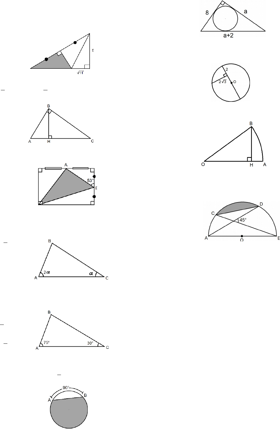 AREAS DE REGIONES TRIÁNGULARES Y CIRCULARES 1. En la figura, calcule el área de la región sombreada. A) 25 B) 20 C) 7,5 D) 30 E) 15 2. Calcule el área de la región triangular ABC, si: AH = 4 - y HC = 4 + A) 8 B) 10 C) 12 D) 16 E) 24 3. En la figura, AB = 5 cm. Determine el área sombreada. A) 16 B) 18 C) 20 D) 24 E) 28 4. En la gráfica: AB = 6u, AC = 10u. Halle el área del triángulo ABC. A) 20 B) 20 C) 24 D) 30 E) 18 5. En la figura, AC = 8m. Hallar el área de la región ABC. A) 8 B) 8 C) 16 D) 16 E) 32 6. En la siguiente figura, calcule el área de la región sombreada, si AB = 6 A) 9(3π+2) B) 9(3π-2) C) 3(3π-2) D) 3(9π+2) E) 9(2π-2) 7. En la siguiente figura, calcule el área del círculo. A) 6π B) 8π C) 9π D) 12π E) 24π 8. En la siguiente figura, calcule el área del círculo. A) 14π B) 12π C) 16π D) 8π E) 9π 9. En la figura, BH=3m y OA=6m. Halle el área del sector circular. A) 4π B) 5π C) 6π D) 8π E) 3π 10. Calcula el área de la región sombreada, sabiendo que “O” es centro y AO = OB = 2m. A) (π-1) B) (2π-3) C) 3π D) (π-2) E) (π+1)
