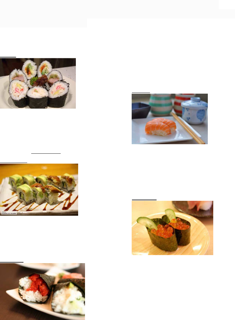 RECETARIO SUSHI Sushi: arroz cocido adobado con vinagre de arroz,azúcar y sal; relleno de verduras,pescados o mariscos "Sushi, viene de abreviar dos palabras japonesas, Su, que significa vinagre y Meshi, que significa arroz, por lo que sushi, es todo plato elaborado con arroz avinagrado al estilo japonés". Tipos de sushi: Maki. En japonés, significa rollo: arroz con pescado crudo y otros ingredientes enrollados en alga nori. Si el rollo es muy delgado se llama hosomaki, si es grueso futomaki y Uramaki. “Ura” es “cara opuesta”, un maki pero al revés. Es el arroz el que envuelve el rollo de alga nori que contiene los ingredientes. Temaki. “Te” quiere decir “a mano”. Los temaki son conos de alga nori rellenos de arroz y otros ingredientes. Como burritos mejicanos pero en versión japonesa. Nigiri. El niguiri es el sushi que no lleva alga nori (como mucho una cinta decorativa). Son piezas de arroz “amasadas” y cubiertas de pescado crudo u otros ingredientes. Gunkan. ”Acorazado” o arroz envuelto en una tira gruesa de alga nori hasta formar una especie de cuenco, normalmente relleno por encima de huevas de pescado. Inari. Es como una especie de rollito de primavera de tofu frito con arroz aromatizado y/o verduras. Oshi. “Empujar” o “prensar”. A mí me recuerda a los pastelitos que compran en casa de mis padres algunos domingos. Capas de arroz y pescado o verduras “prensadas” en un molde que se llama oshibako. Tienen forma cuadrada o rectangular. Chirasi. La palabra significa “esparcir” porque el chirasi se prepara “esparciendo” arroz, pescado crudo y otros ingredientes típicos del sushi en un plato, generalmente cuando no se tiene tiempo de ir preparando las piezas una a una. Onigiri Se trata de una porción abundante de arroz con el relleno en su interior, al que se da forma de prisma triangular y se envuelve con una porción de alga nori para poder agarrarlo. A veces se utilizan para hacer adornos o se da forma de muñecos de personajes de dibujos animados. También se conocen con el nombre de Omusubi sushi. Con esta pequeña clasificación de las distintas variedades del sushi, seguro que cuando vayas a un restaurante japonés ya podrás hacerte una idea de los platos que te ofrecen en su carta y podrás pedirlos sabiendo lo que te van a traer. Es recomendable mojar el cuchillo entre cortes ya que de esta forma se logra mayor prolijidad en los resultados. INGREDIENTES DE SUSHI Los que todavía tengáis un poco de reparo en comer pescado crudo (a pesar de lo bueno que es para la salud) podéis decantaros por las opciones vegetarianas como el California Roll, con cangrejo, aguacate y pepino. Pescado: el atún, el salmón y la anguila son los más típicos. Es importante que sea fresco y que esté libre de parásitos. Marisco: gambas, langostinos, sepia, calamar… Huevas de pescado: como caviar pero más accesible a todos los bolsillos. ¡Buenísimas! Carne: muchas veces se olvida ¡pero también hay sushi de carne! Principalmente con pollo, ternera o cerdo. Verduras y vegetales: la zanahoria, el pepino y el aguacate son un clásico pero la gracia es que el arroz combina prácticamente con todo: pimiento, espinacas, bambú… Tortilla (fukusazushi): sí, ¡tortilla!, aunque no es como la nuestra. Son como una especie de crepes hechas a base de caldo dashi (copos de bonito seco rallado y alga kombu), salsa de soja, azúcar y huevo. ALGAS Nori: Este tipo de alga es imprescindible en la elaboración de makizushi. Debemos tener en cuenta que existen dos variedades de nori: rojo y verde. Suelen tostarse para la elaboración de sushi, por lo que se denominan: yakinori. Wakame: Es una de las algas más populares, se emplea tanto en la elaboración de la sopa de miso como en diversas variedades de ensalada, aderezada con vinagre. Arame: No es de las más habituales, se parece notablemente a otra variedad: hijiki, aunque es más dulce y menos crujiente. En algunas ocasiones, este tipo de alga se emplea como acompañamiento en diferentes platos. Hijiki: Lo más característico es su color oscuro. Su volumen se multiplica por tres cuando se pone a remojo. Lo más habitual es que se sirva como aperitivo salteado en aceite con zanahoria y soja. Tengusa: Su nombre significa “hierba celestial”. Este ingrediente es fundamental en la elaboración de otro preparado: el kanten o agar-agar. Su color es rojizo. Ogonori: Se trata del otro ingrediente fundamental para la elaboración de agar- agar, junto con la tengusa. Podemos definirlo como una especie de musgo marino, que también puede emplearse como condimento de ensaladas o como acompañamiento del shashimi. Tosoka: Puede ser roja, blanca o verde. Al igual que el ogonori puede emplearse en ensaladas o con shashimi. En cualquier caso, esta alga se vende cubierta de sal por lo que será necesario remojarla antes de utilizarla en la cocina. Su forma es similar a la cresta de un gallo. Suginori: En cualquiera de sus variedades: bermellón, verde o blanca, se emplea para la elaboración de ensaladas o como acompañamiento de shashimi. Su aspecto es más delgado y ramificado que las especies anteriores. EL ARROZ El lavado y preparación Con uno o con otro arroz, el primer paso es lavarlo bien, hay que frotarlo con fuerza bajo el grifo y luego dejar en remojo x 20 min. Fijaos en las fotos como al principio el agua está muy blanca, llena de almidón, pero tras lavarlo y remojarlo a conciencia, y cambiar el agua hasta ocho veces se consigue que el arroz esté limpio y listo para cocer. La cocción se puede hacer en una cazuela tradicional o en un cocedero de arroz eléctrico, siempre sin añadir sal y en una proporción de agua de dos veces la cantidad de arroz.. Avinagrado y enfriado Para hacerlo tenemos que preparar una mezcla de vinagre de arroz o blanco con azúcar y sal. Lo mezclamos bien en una jarra .Luego, lo vamos añadiendo mientras removemos el arroz con una cuchara ancha o si queréis hacerlo en plan pr